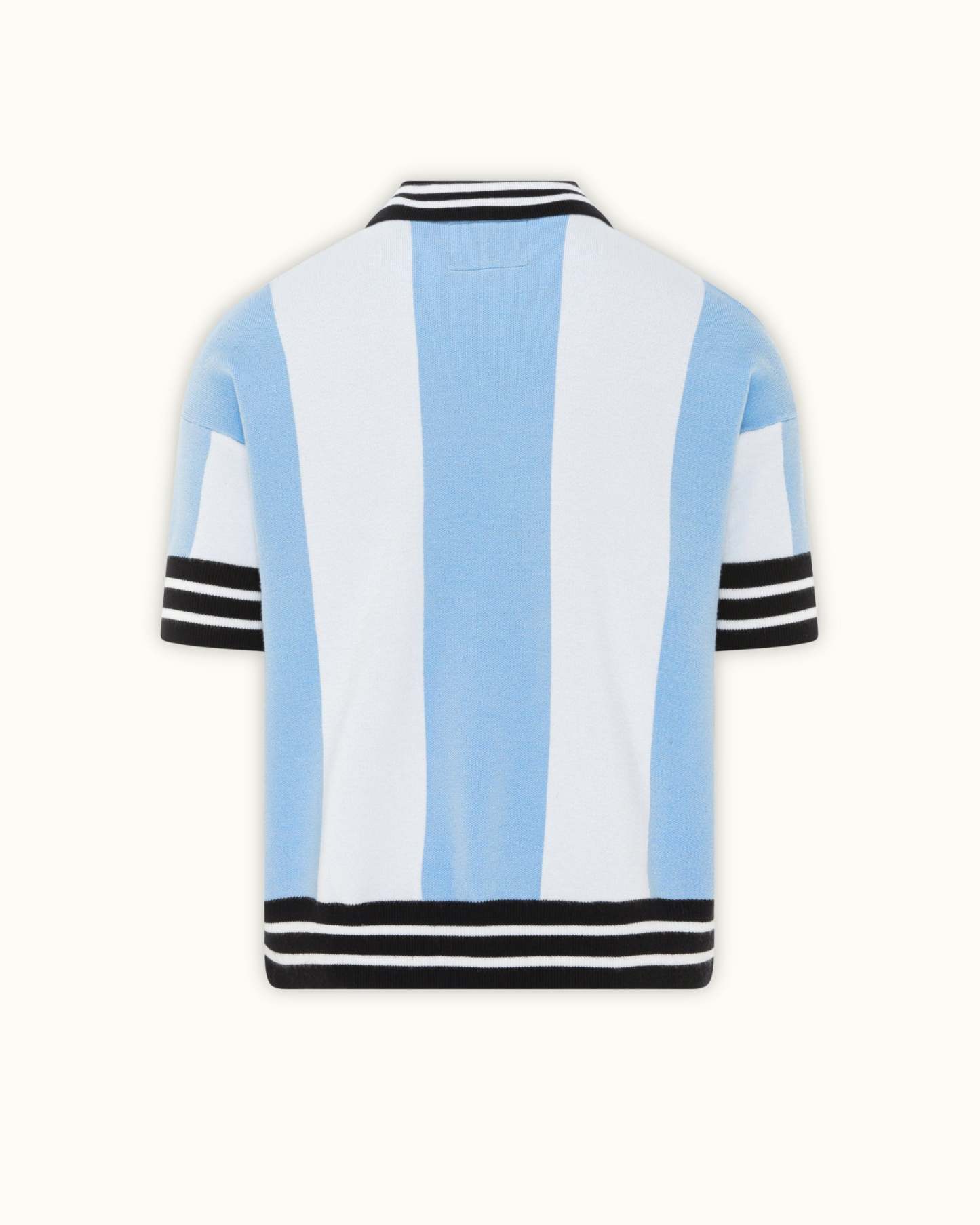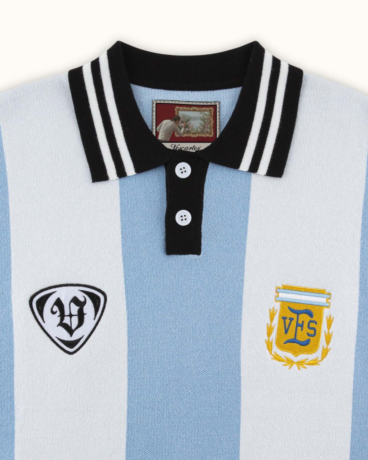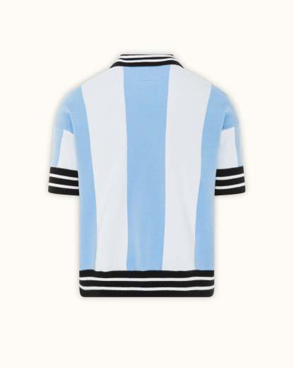 Echoing the timeless heritage of Argentine football, this knitted jersey reinterprets the nation’s iconic vertical stripe in soft baby blue and white tones. Features a classic contrast collar and ribbed hemline, with two Vescartes-themed embroidered crests.