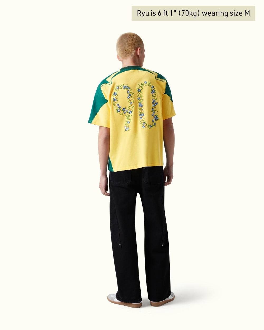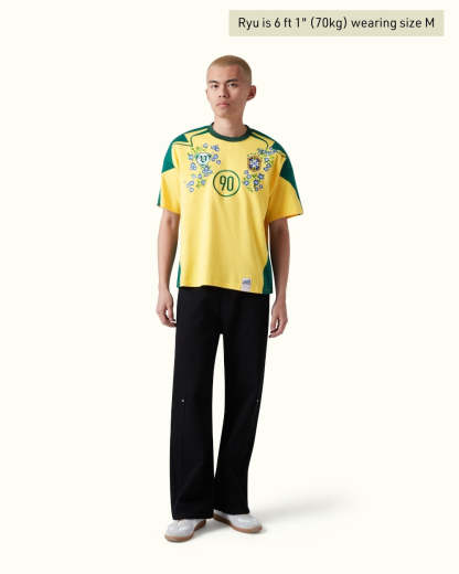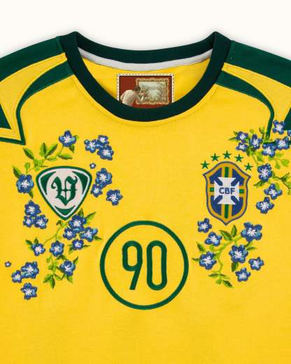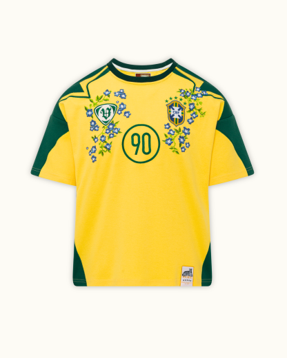 A tribute to flair, both on and off the pitch. This 100% organic cotton jersey fuses Brazil’s iconic football heritage with vibrant floral embroidery, reimagining the number 90 in full bloom. Finished with intricate chest detailing and a jaguar-branded woven label.