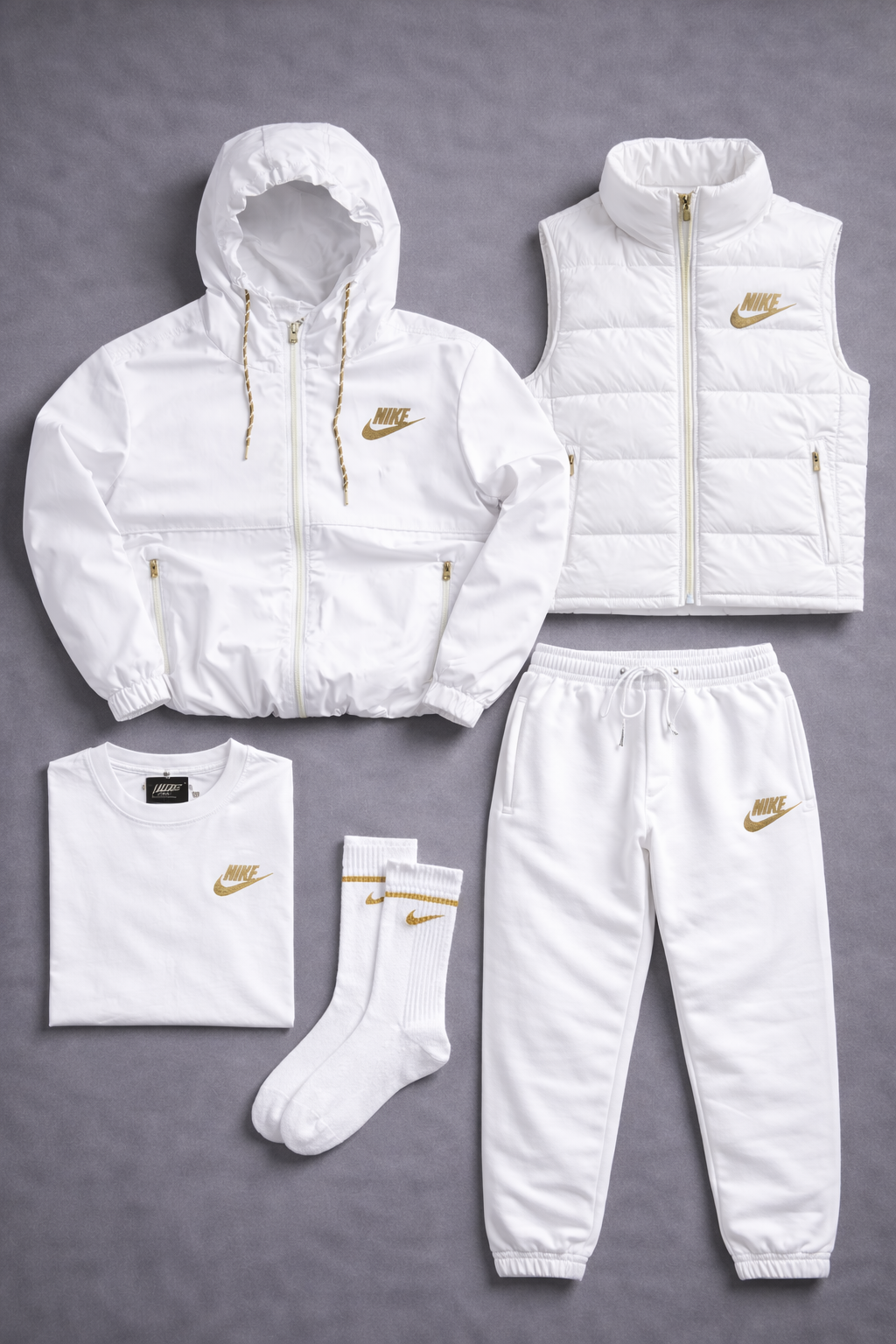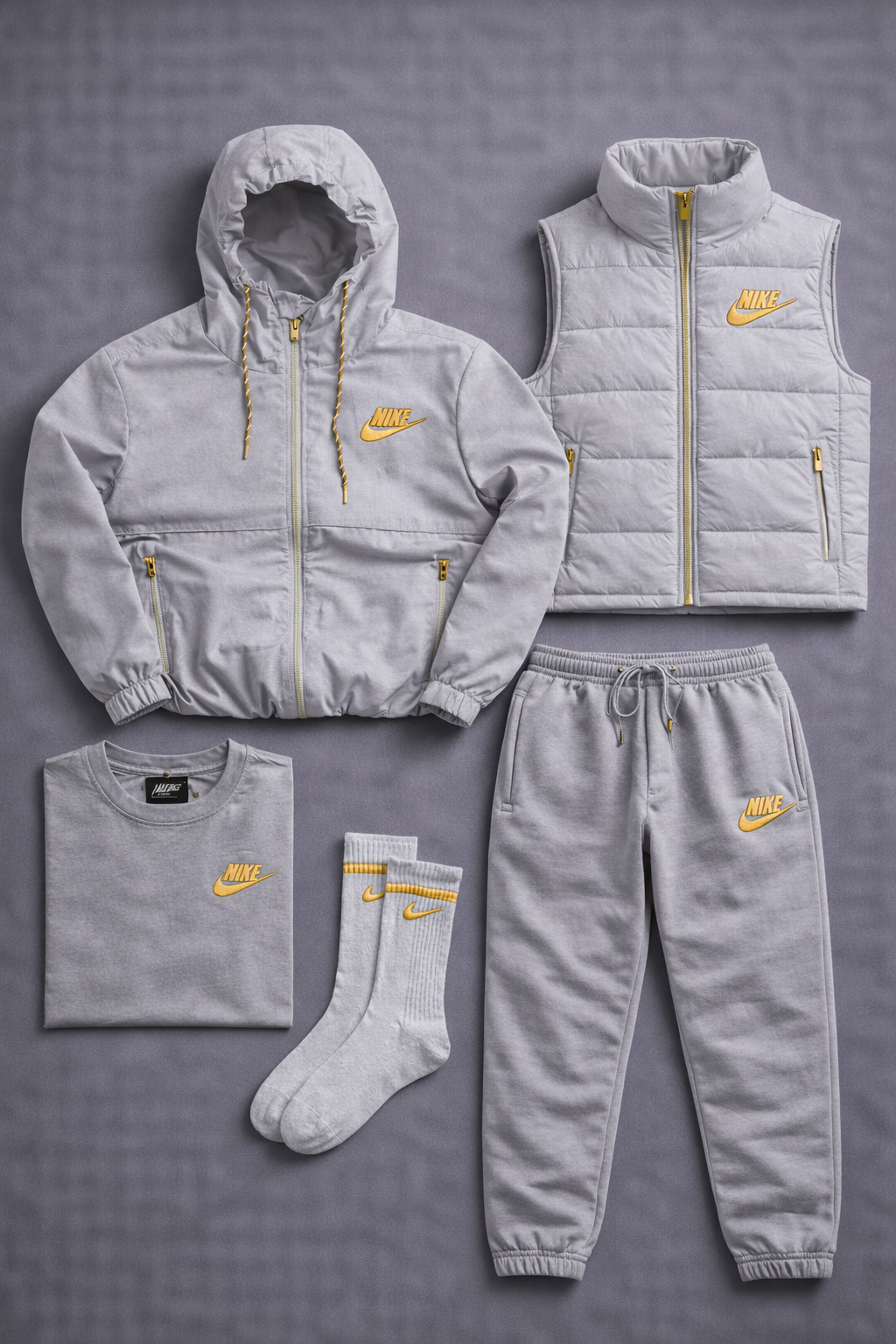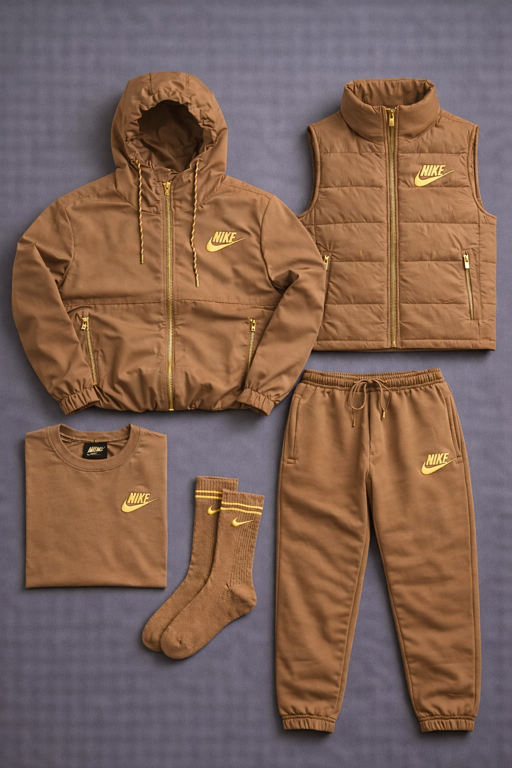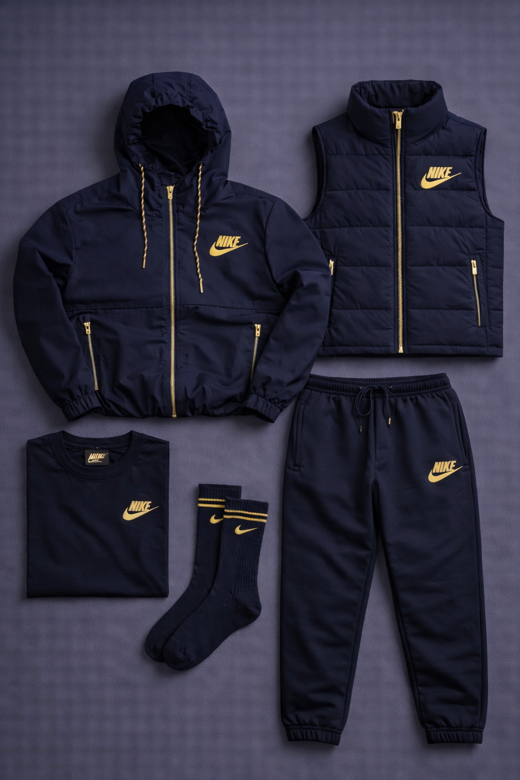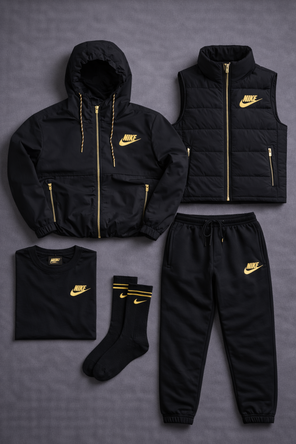 The set includes a hooded jacket, a padded sleeveless top, a T-shirt, athletic pants, and matching socks, all featuring the iconic Nike logo and gold accents on zippers, logos, and details. The materials are designed to ensure lightness, breathability, and freedom of movement, making this set perfect for both everyday wear and sophisticated streetwear style.