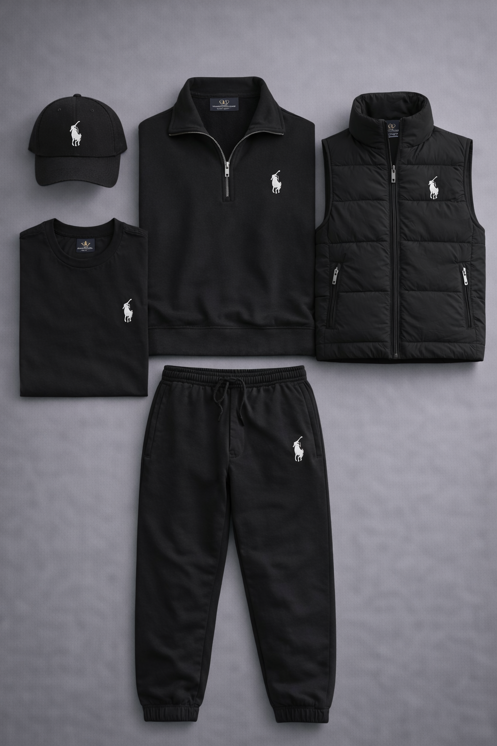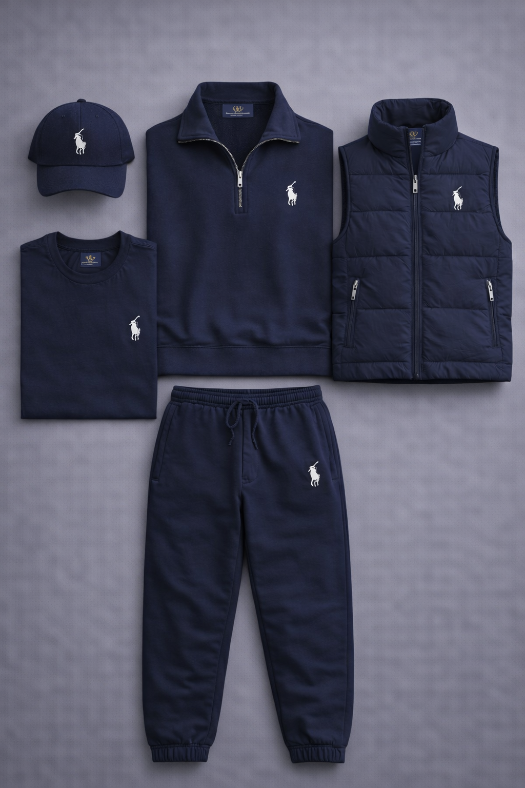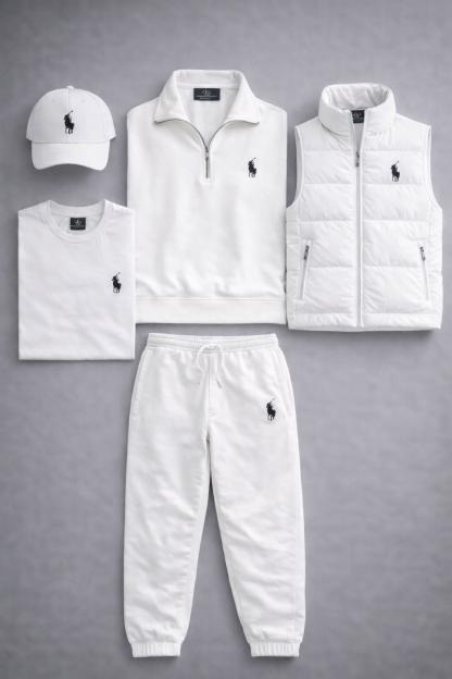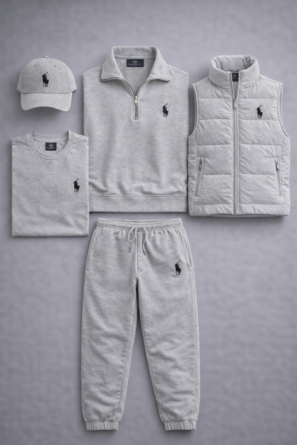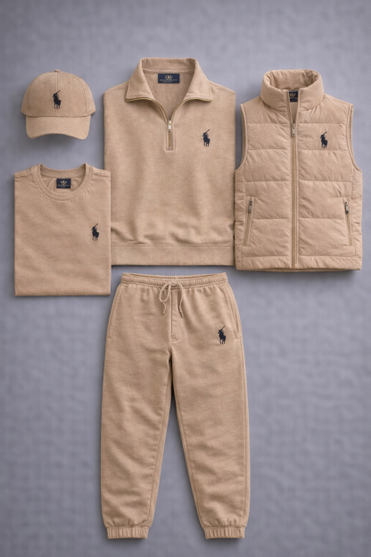 The Elite Layered Essentials Kit strikes the perfect balance between casual elegance and everyday comfort, courtesy of Polo Ralph Lauren. This coordinated set includes a quarter-zip sweatshirt, a sleeveless jacket, a T-shirt, sweatpants, and a cap, all featuring the iconic embroidered horseman logo that embodies the brand’s authenticity. Crafted from soft, high-quality materials, the set offers a clean, sophisticated style ideal for leisure, travel, or city life. A complete outfit designed for those who want a premium, modern, and perfectly coordinated look for any occasion.