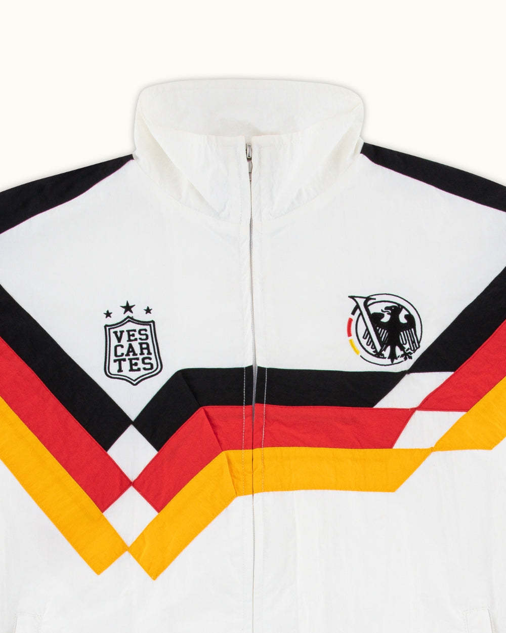 Drawing from the heritage of German football, this jacket fuses nostalgia with contemporary design. A tricolour ribbon motif arcs across the chest and sleeves, while the dual crests subtly reinterpret classic football emblems through the Vescartes identity.