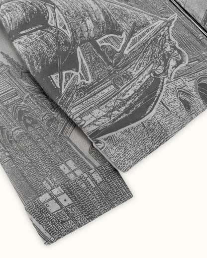 Crafted from grey cotton canvas, this jacket features a striking print of Hercules riding a winged horse through a mythological skyline. Vescartes’ signature hardware and functional waist adjusters complete the piece with subtle luxury.