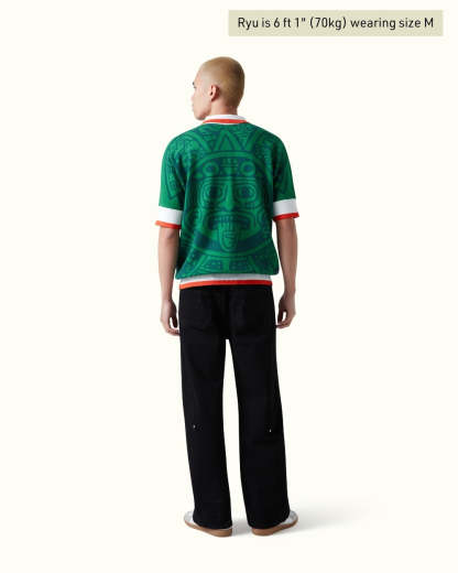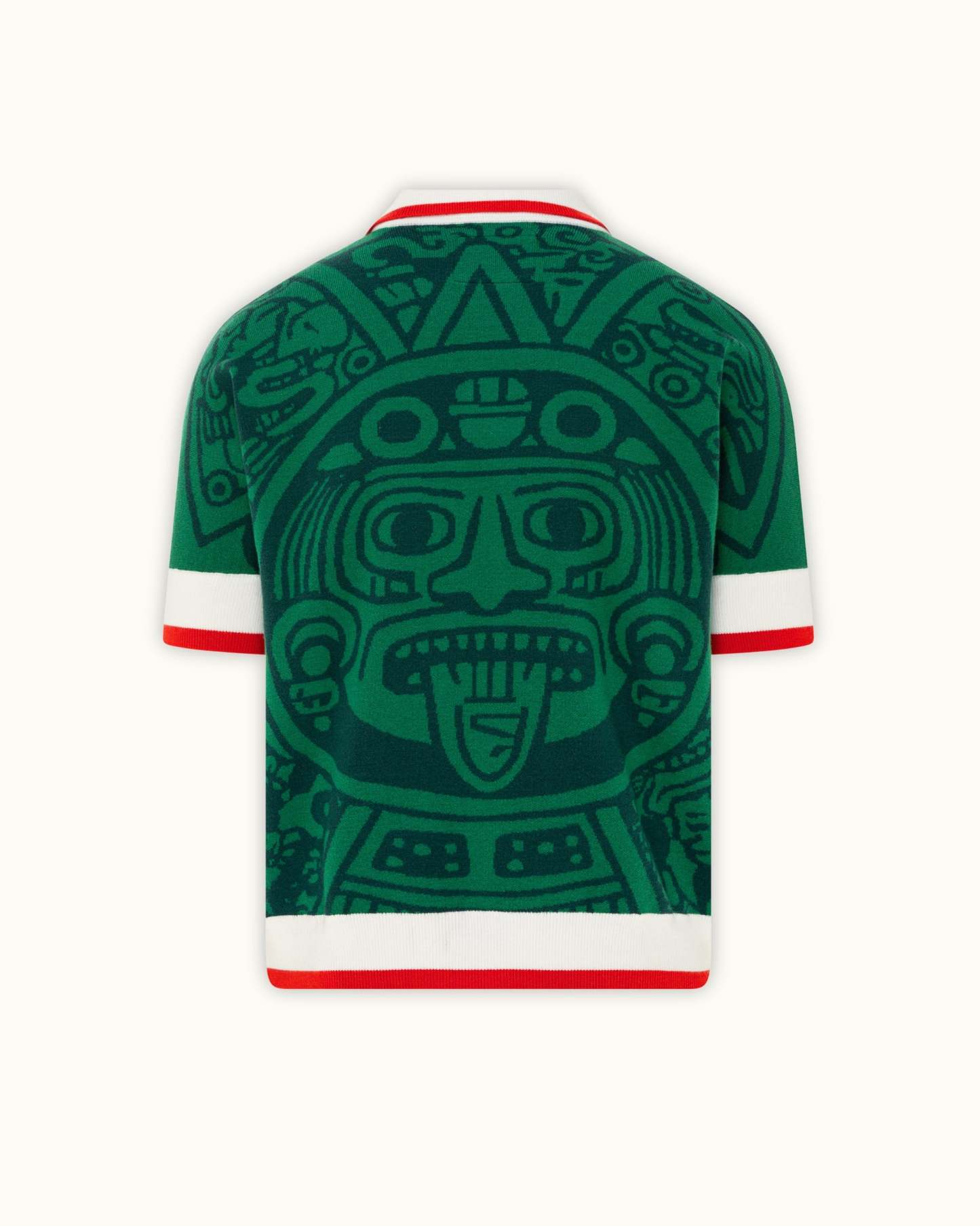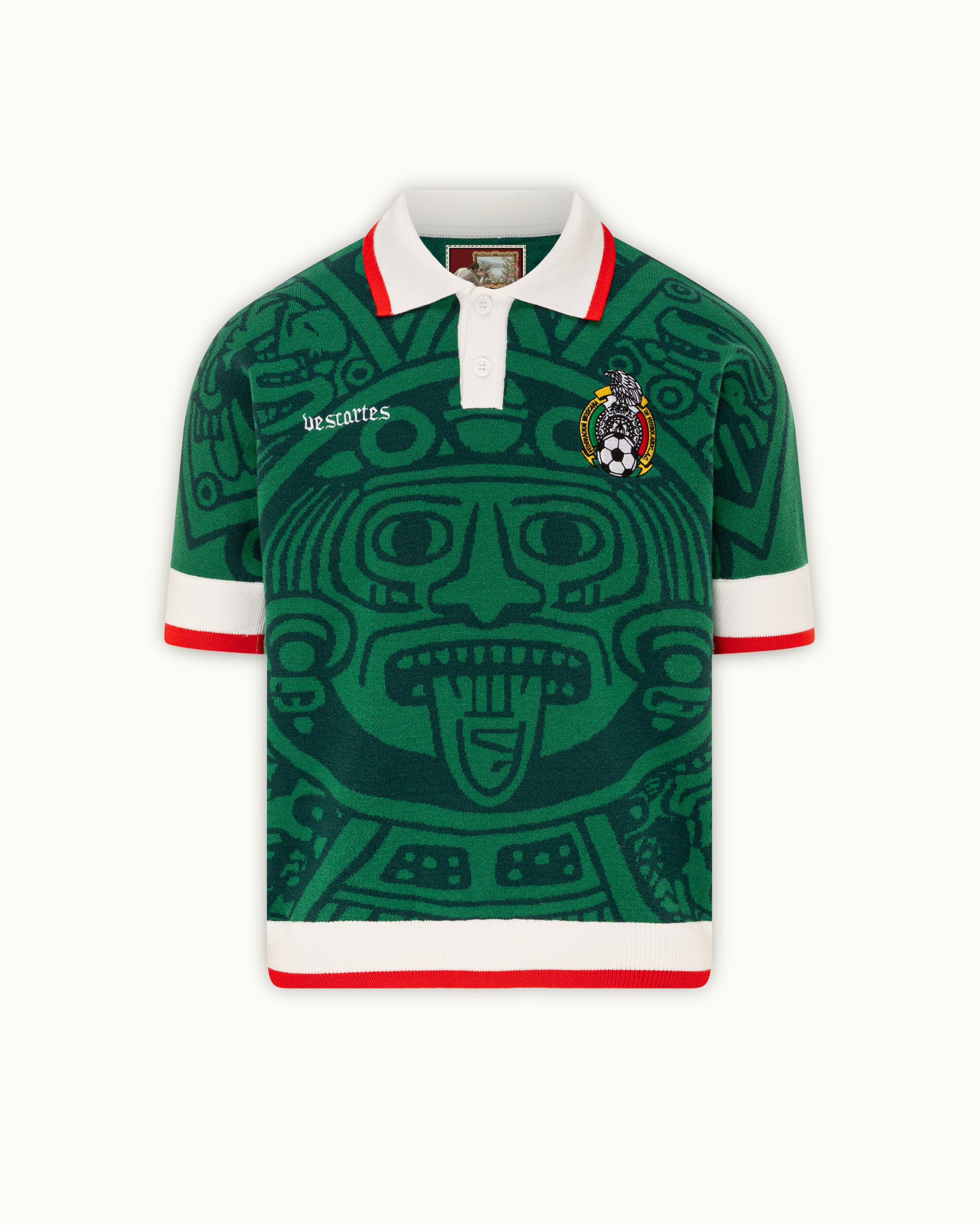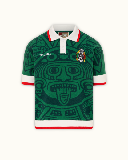 Crafted in a rich emerald green knit, this piece channels the soul of Mexico’s heritage. The jersey features an all-over jacquard Aztec calendar motif — a nod to the 1998 Mexico kit. Finished with contrast red and white accents, and embroidered Vescartes branded chest logos.