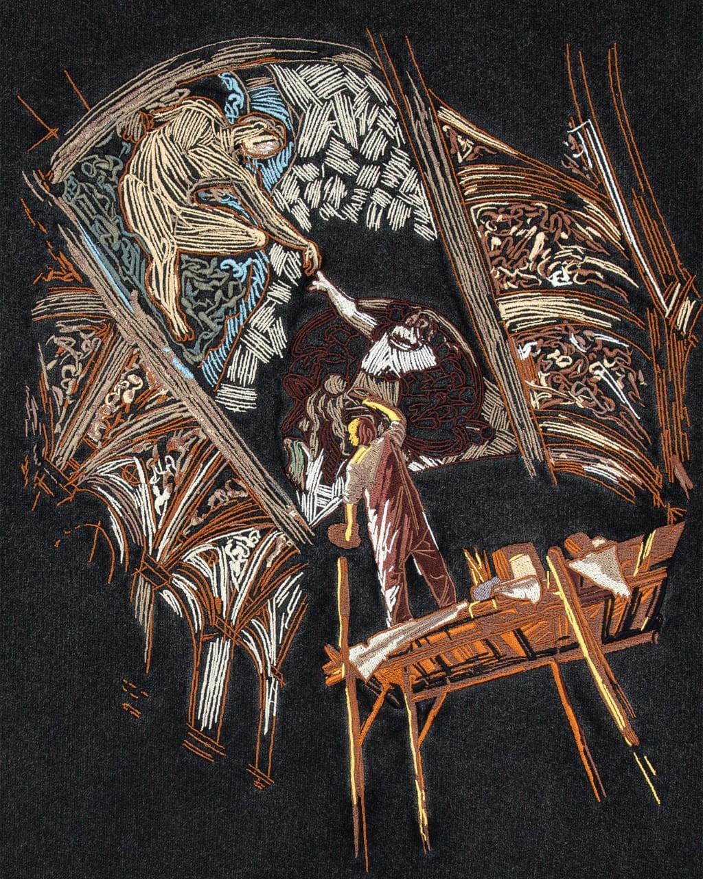 Made from 400 GSM French Terry cotton with a gentle acid wash, it carries a vintage, lived-in feel. The front features a minimalist golden-ratio logo, while the back is dominated by a striking scene of Michelangelo painting the Sistine Chapel — embroidered with over 300,000 stitches and 20 colours.