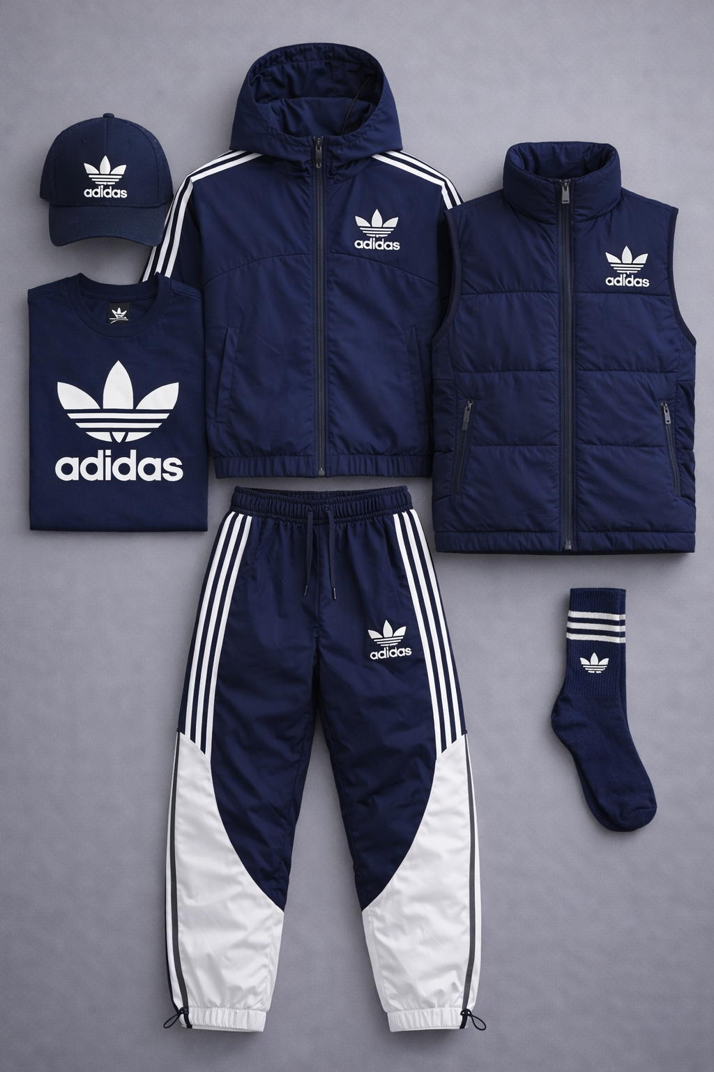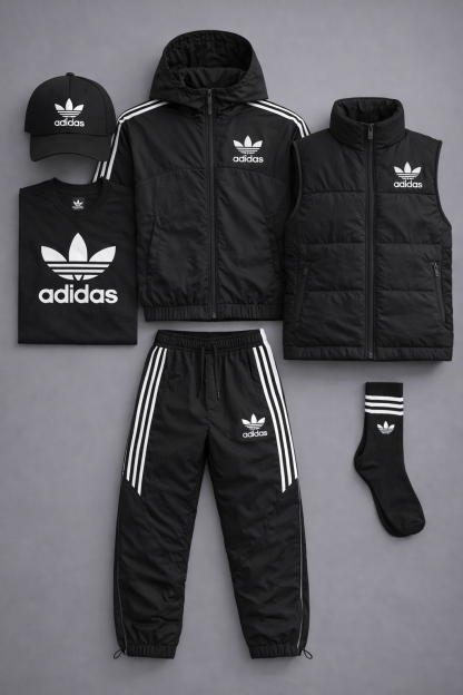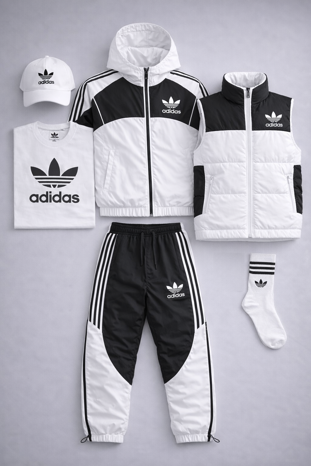 The Signature Layered Street Kit is a streetwear ensemble designed to blend urban style with everyday versatility. The kit includes a hooded jacket, a sleeveless vest, a T-shirt, athletic pants, a baseball cap, and matching socks, creating a complete and harmonious outfit. The iconic three stripes and Trefoil logo enhance the minimalist, contemporary design, while the lightweight, comfortable materials ensure freedom of movement and practicality. Perfect for those seeking a sporty, modern, and coordinated look for any occasion.