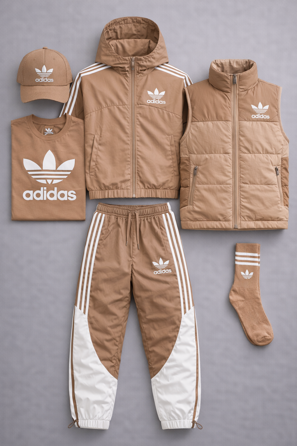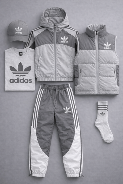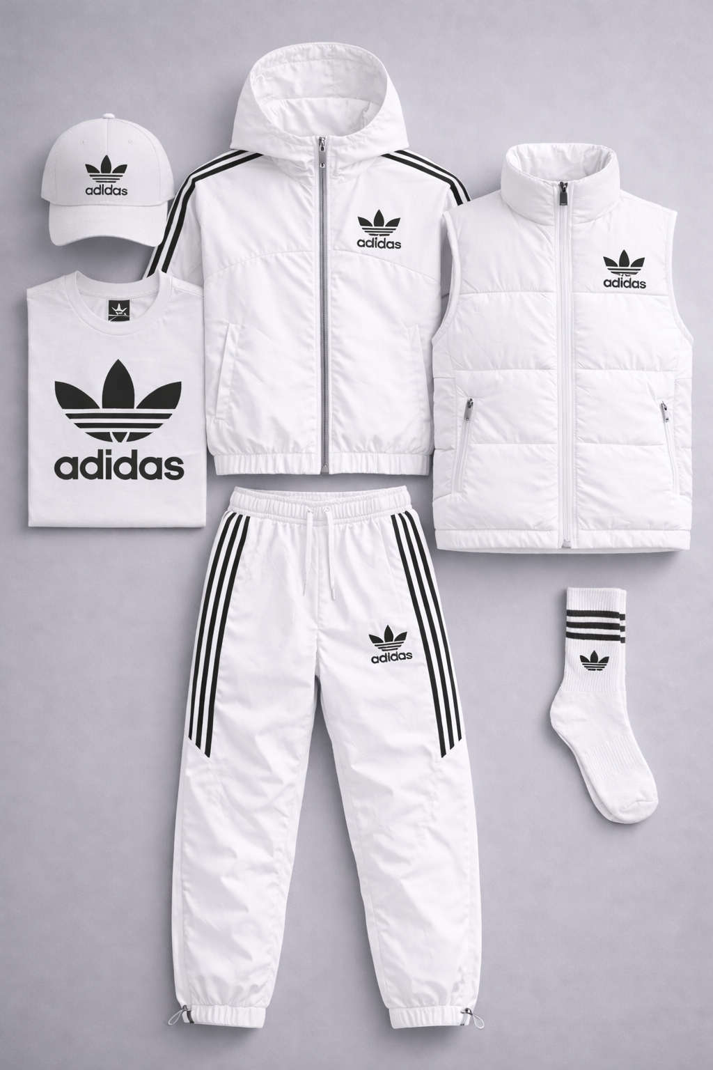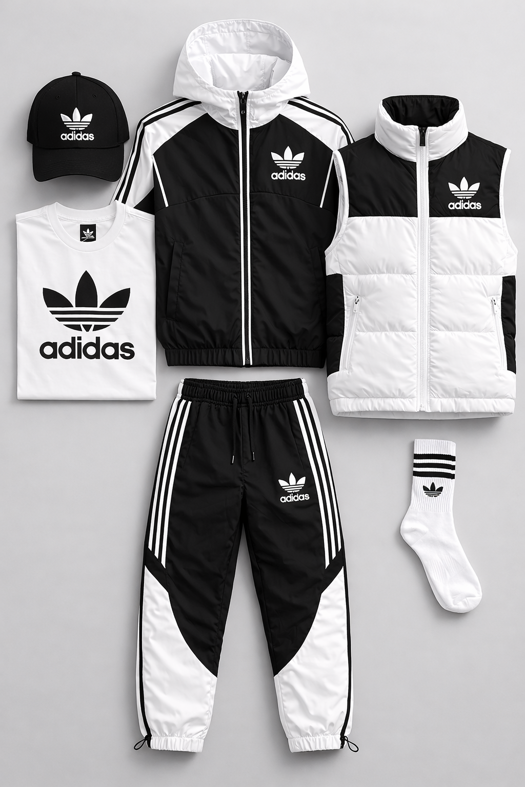 The Signature Layered Street Kit is a streetwear ensemble designed to blend urban style with everyday versatility. The kit includes a hooded jacket, a sleeveless vest, a T-shirt, athletic pants, a baseball cap, and matching socks, creating a complete and harmonious outfit. The iconic three stripes and Trefoil logo enhance the minimalist, contemporary design, while the lightweight, comfortable materials ensure freedom of movement and practicality. Perfect for those seeking a sporty, modern, and coordinated look for any occasion.