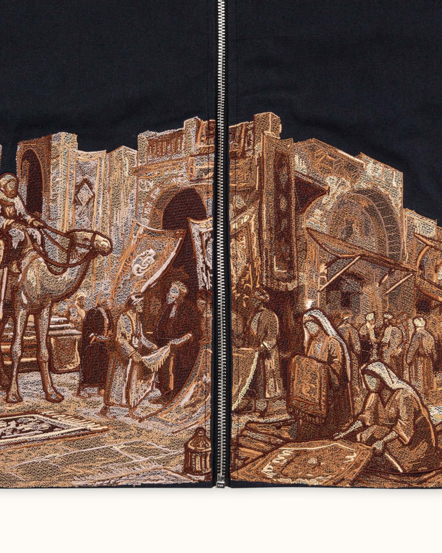 Rooted in Middle Eastern tradition, this jacket reimagines the bustling souk through detailed stitched illustration across its base. The contrast collar and custom hardware enhance its refined workwear profile, while the artwork anchors it as a wearable canvas of history.