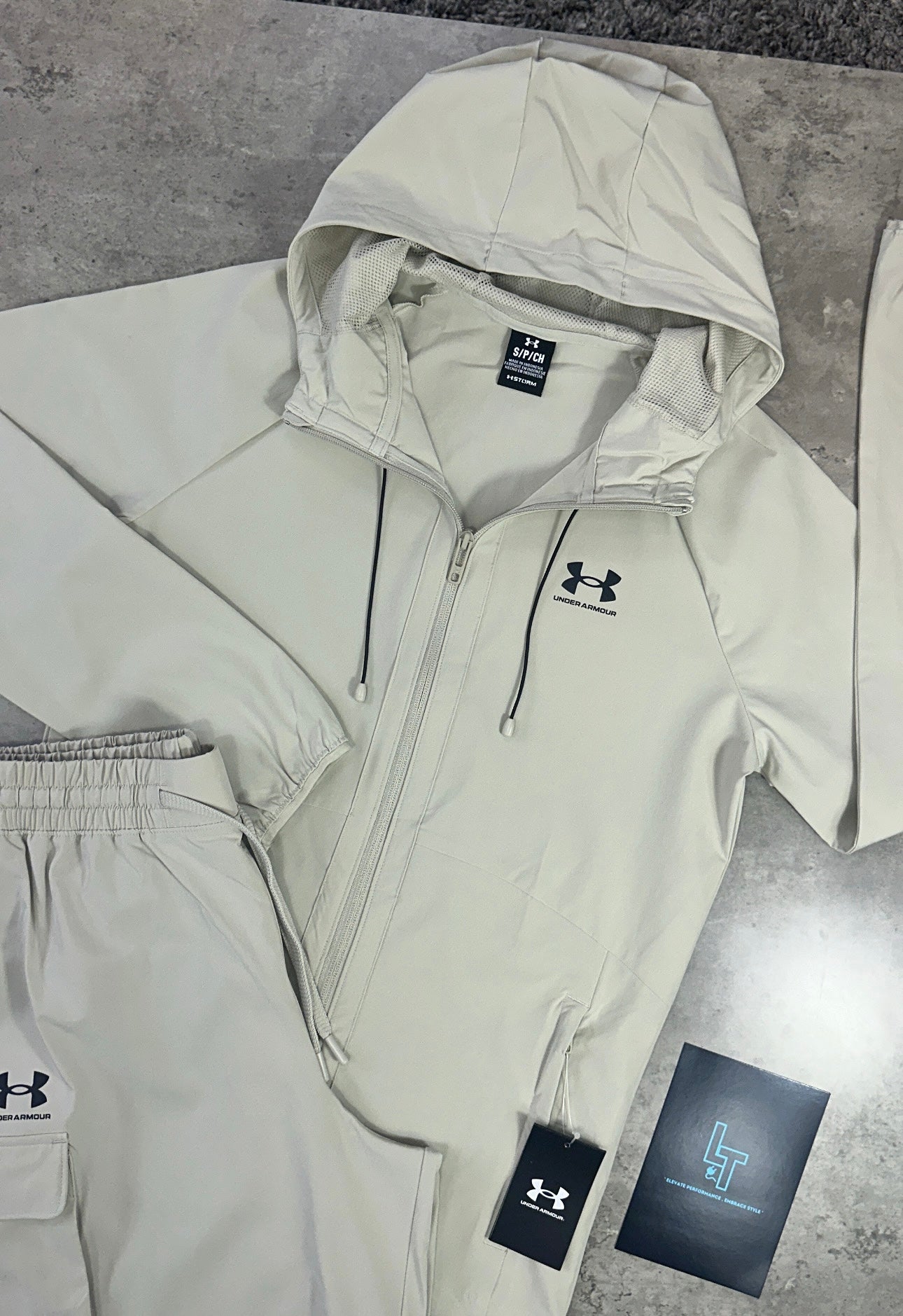 The UNDER ARMOUR CARGO SET in Beige features UA Storm technology that repels water while maintaining breathability, combined with wind-resistant materials to protect you from the elements. The shorts are crafted from lightweight stretch woven fabric offering superior comfort and durability, with 4-way stretch for unrestricted movement. An encased elastic waistband with an external drawcord ensures a secure, adjustable fit, making this set ideal for versatile, all-weather performance.
