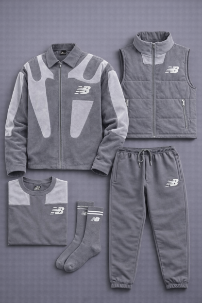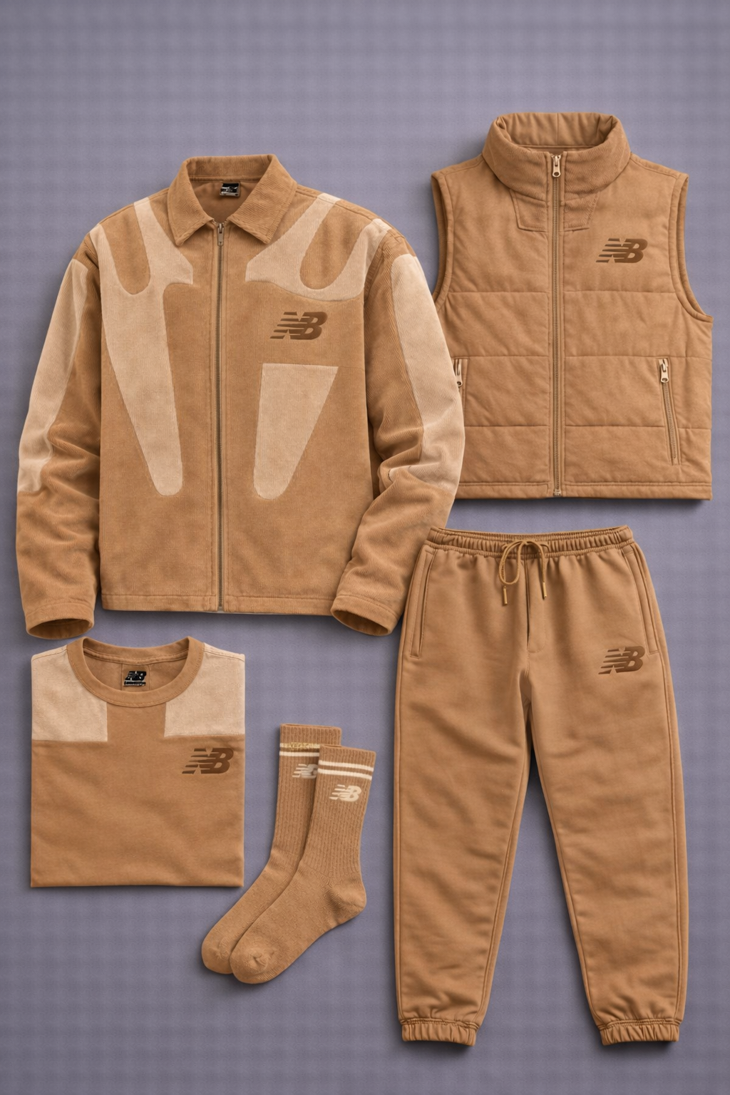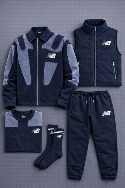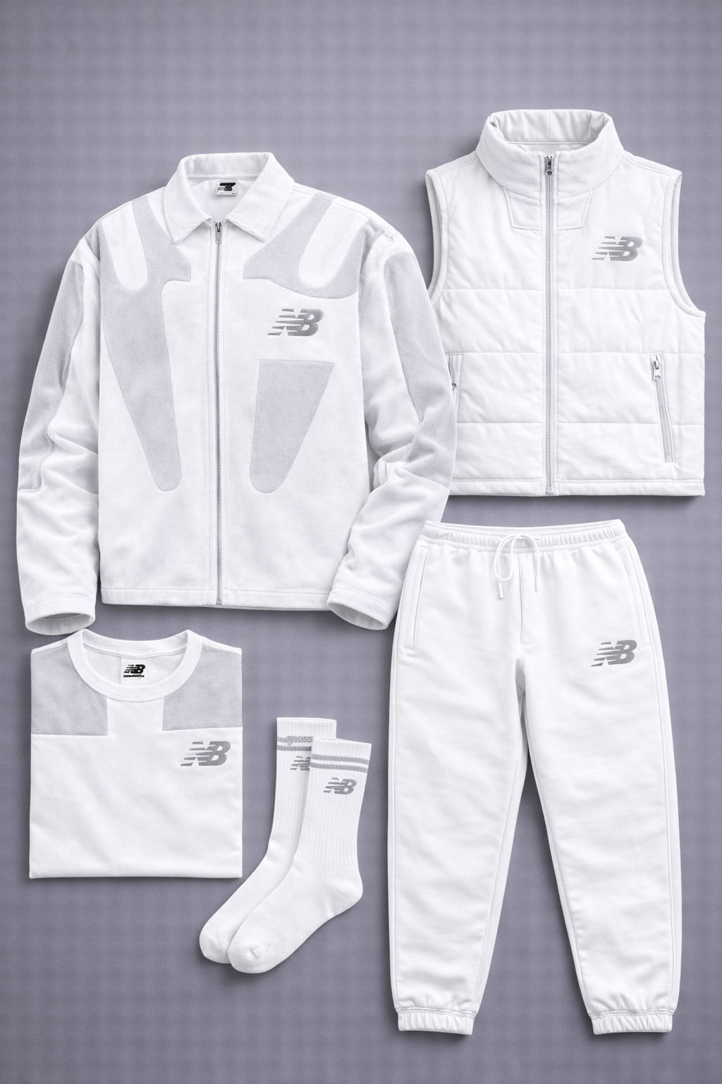 The set includes a zip-up jacket, a sleeveless vest, a T-shirt, athletic pants, and socks, all featuring the iconic New Balance logo and a minimalist design that highlights the contrast between colors. The materials are designed to ensure comfort, breathability, and freedom of movement, making this outfit ideal for everyday wear.