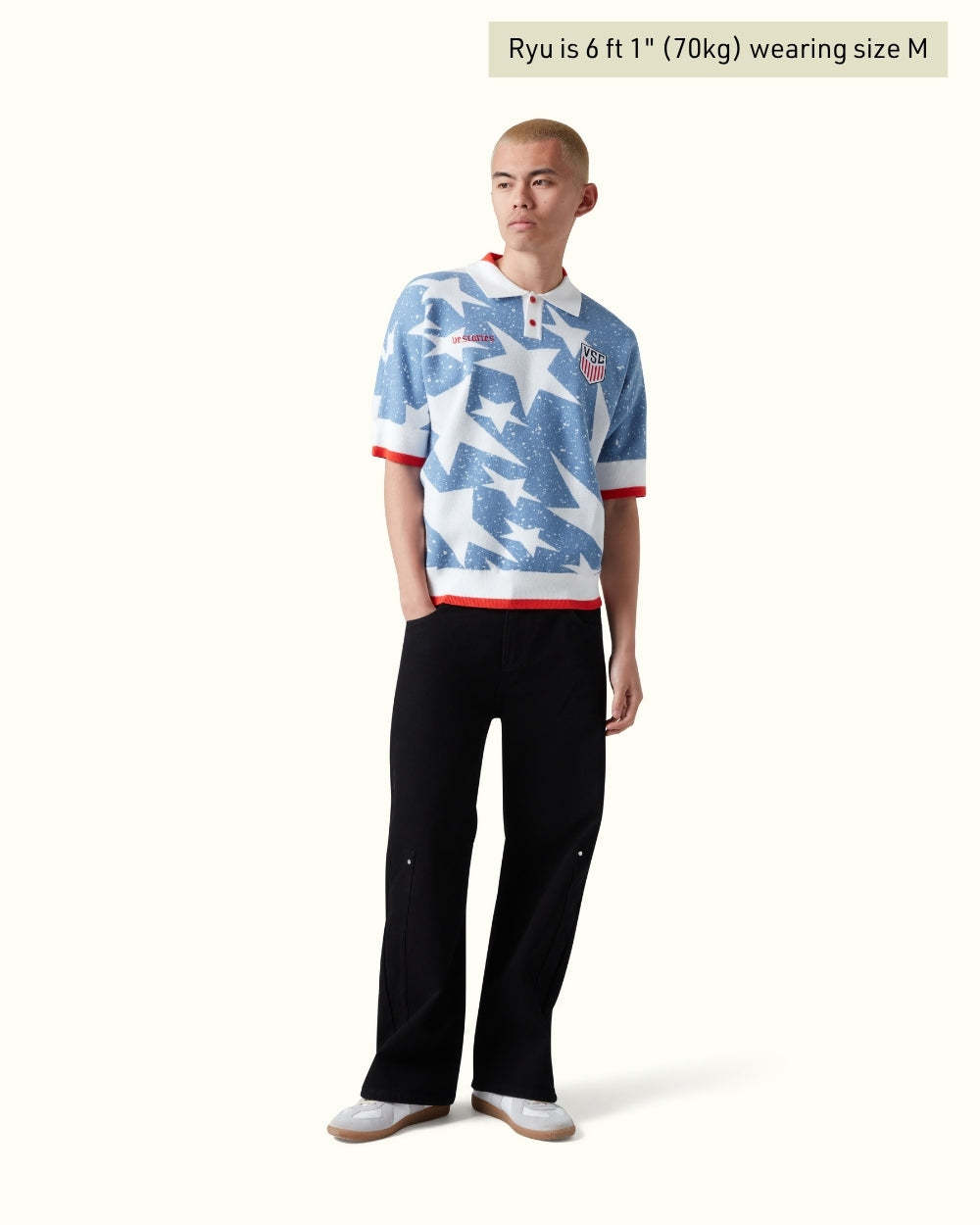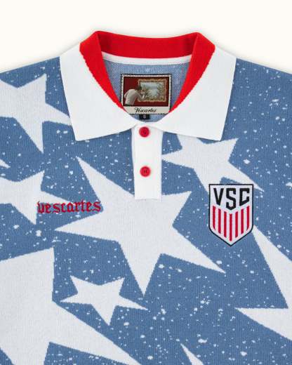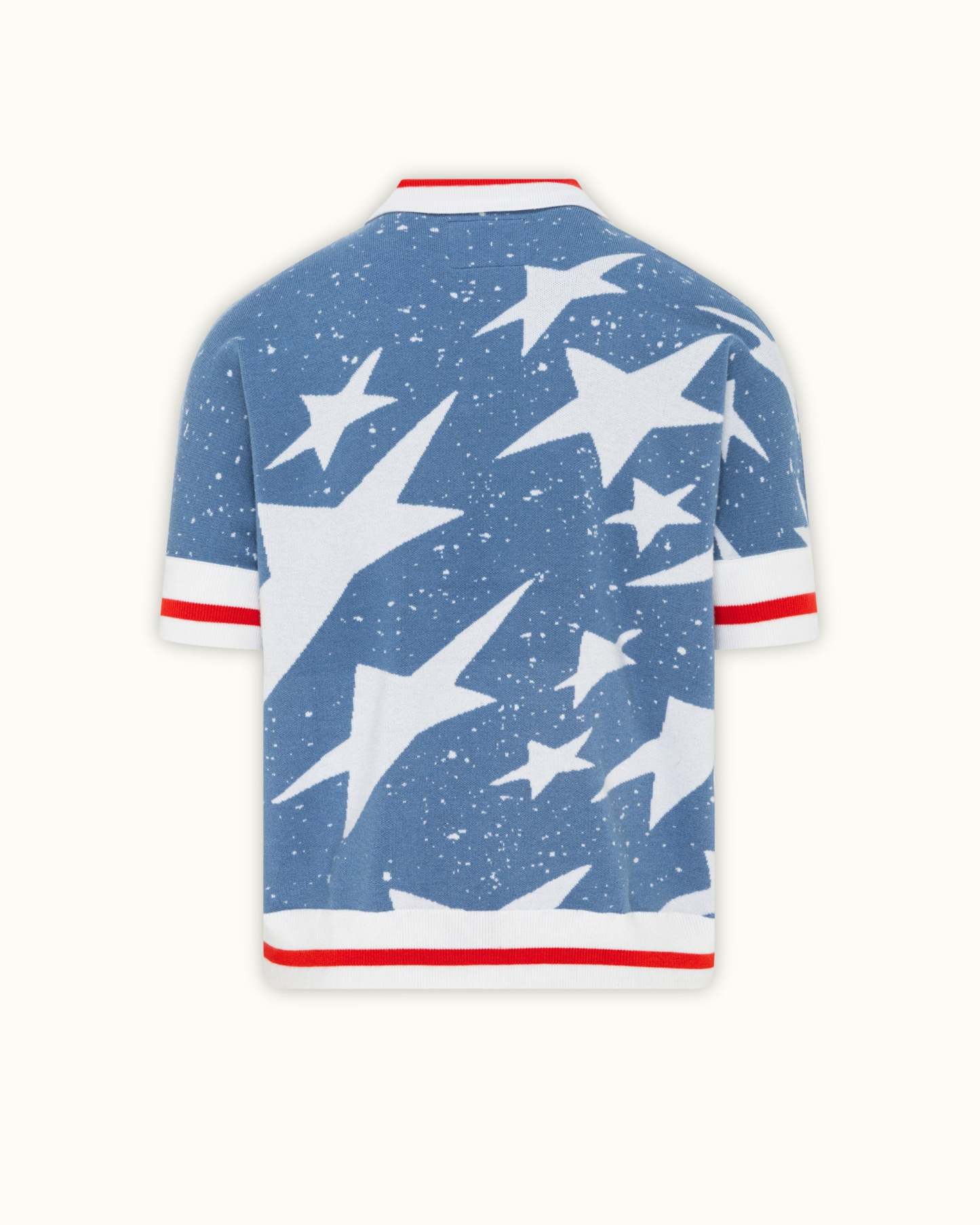 Crafted in a deep blue knit with flecks of white, it features the iconic distorted white star motif that flow across the front and back. Accents of red on the collar, sleeves and hem complete the USA flag palette, while chest embroideries add a final touch of detail.