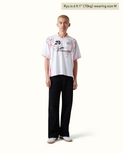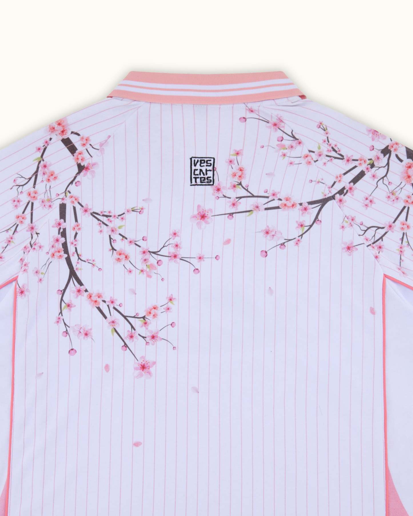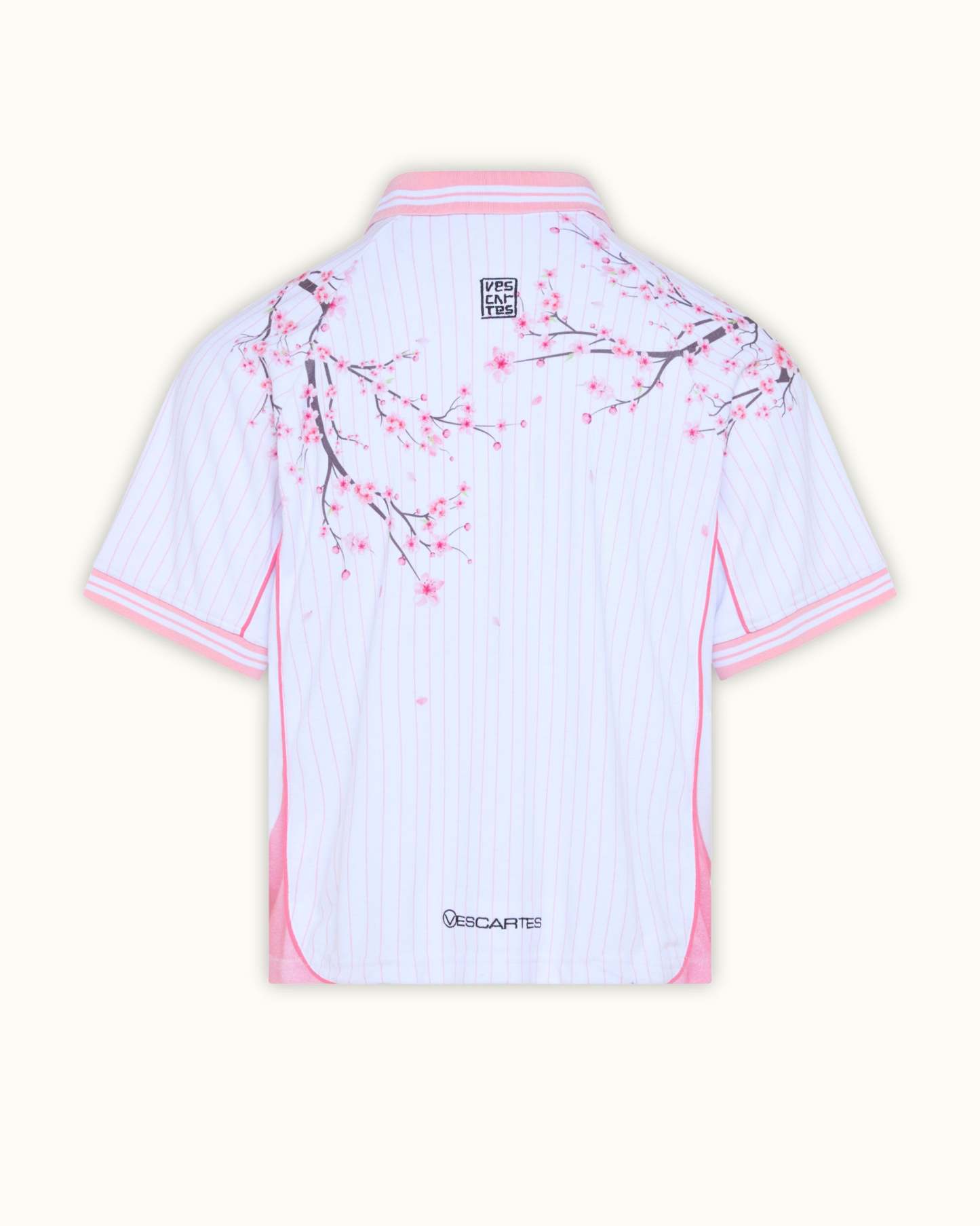 Features fine pink pinstripes running across all panels and printed cherry blossom branches running down from the shoulders over the front and back. contrasted by a pastel pink collar and sleeve trim. Finished with embroidered 'Vescartes' brand logos on the front and back.