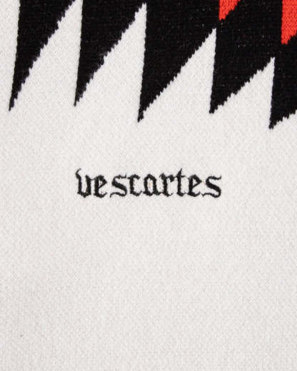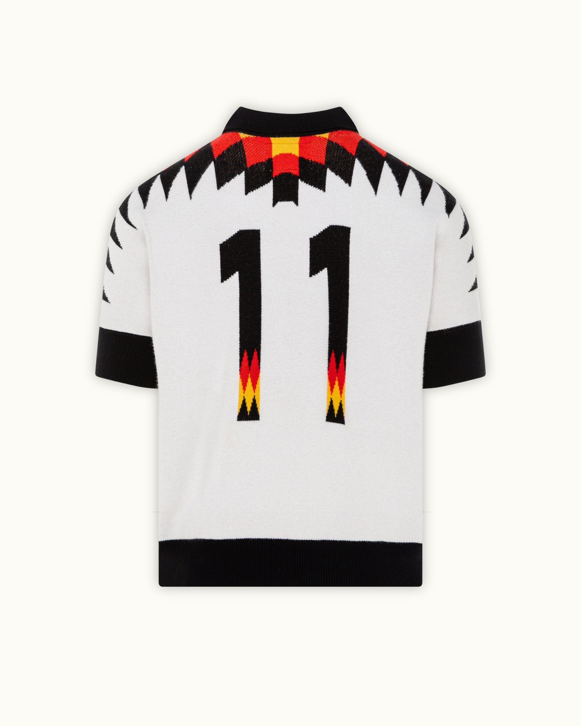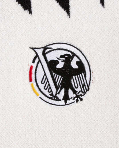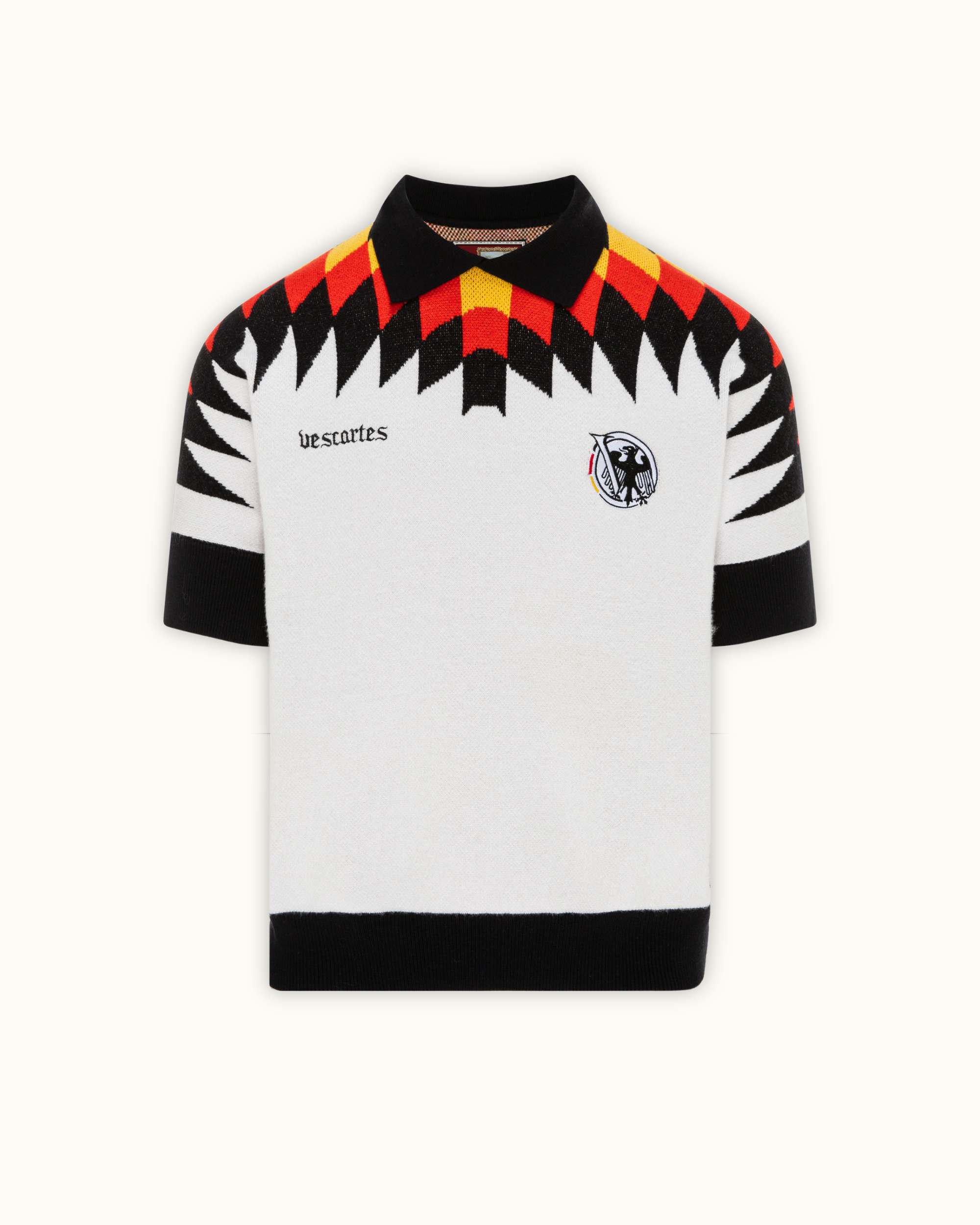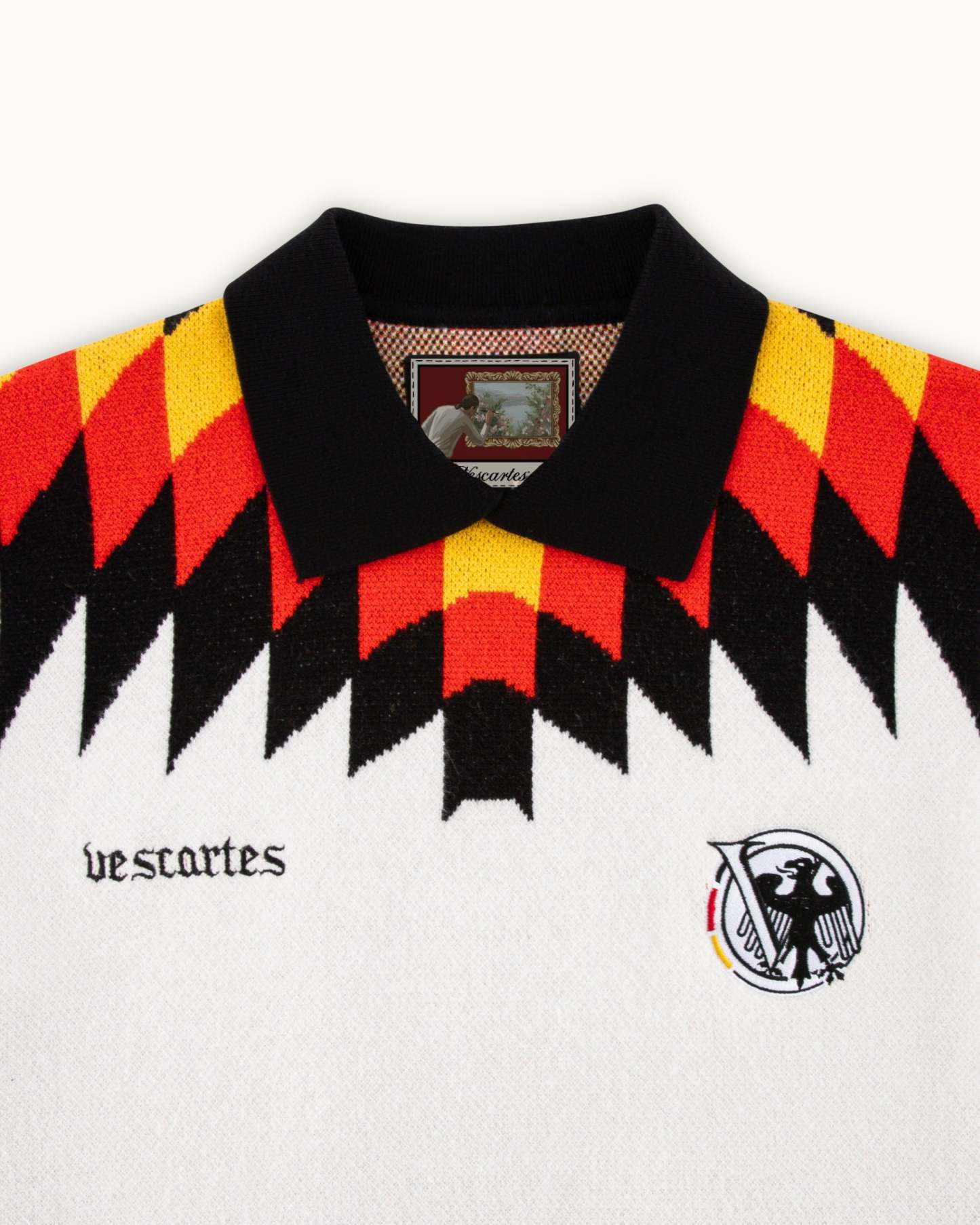 A reimagined classic, this knitted jersey takes inspiration from the legendary 1994–96 Germany kit—reinterpreted through a Vescartes lens. Crafted in a cream-toned weave, it features a bold geometric wing pattern across the shoulders and number detailing on the back.