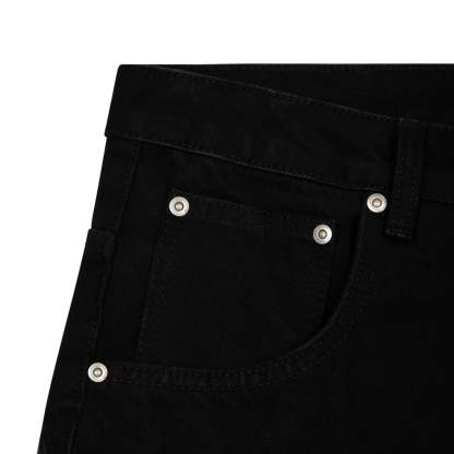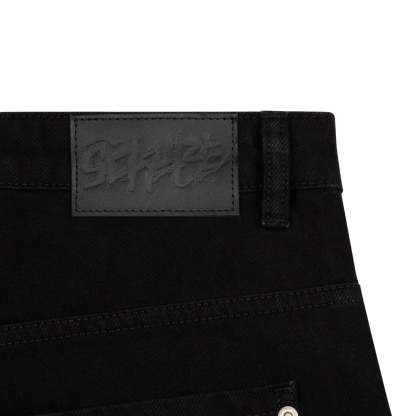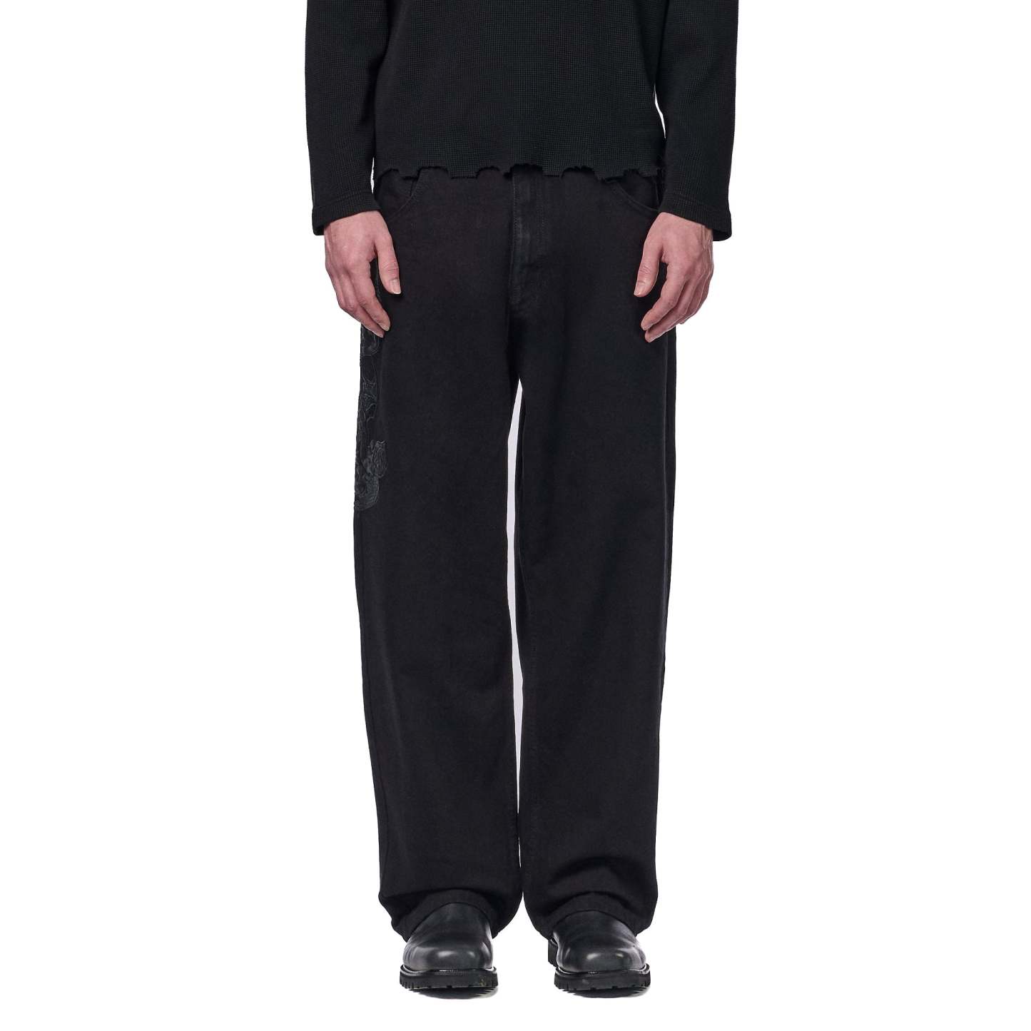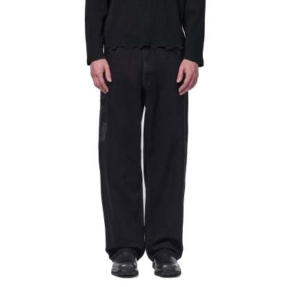 14,5oz denim / 100% cotton / leather embroidery appliqué on front and back / embossed printed leather patch / wash inside out / balloon fit / fits true to size