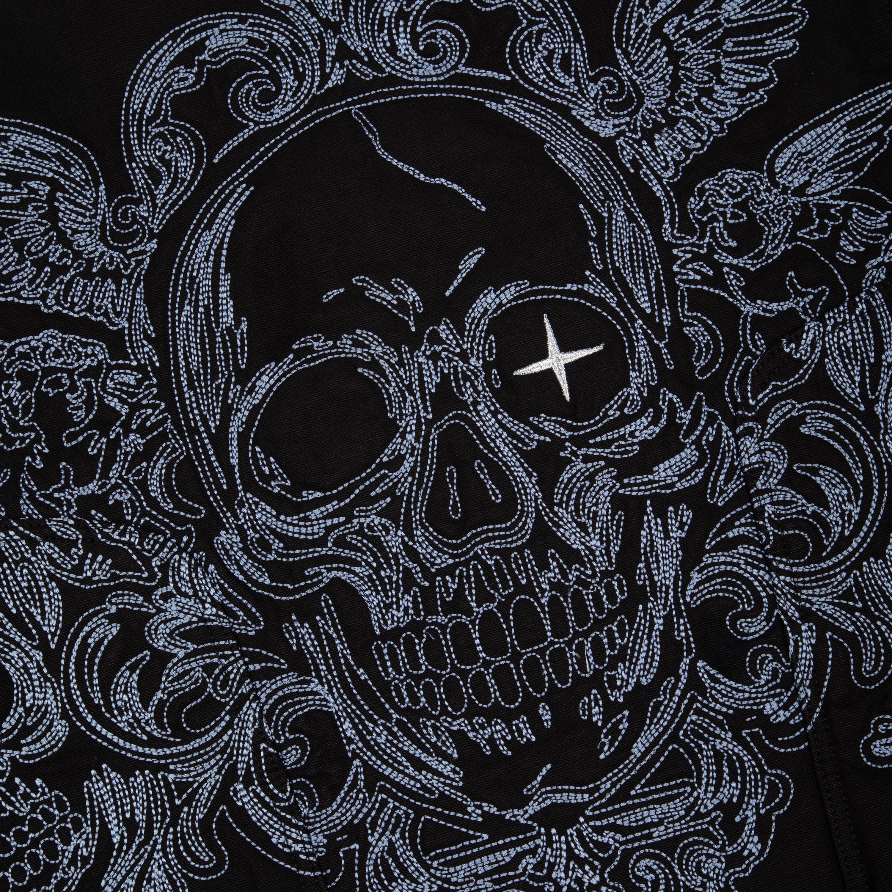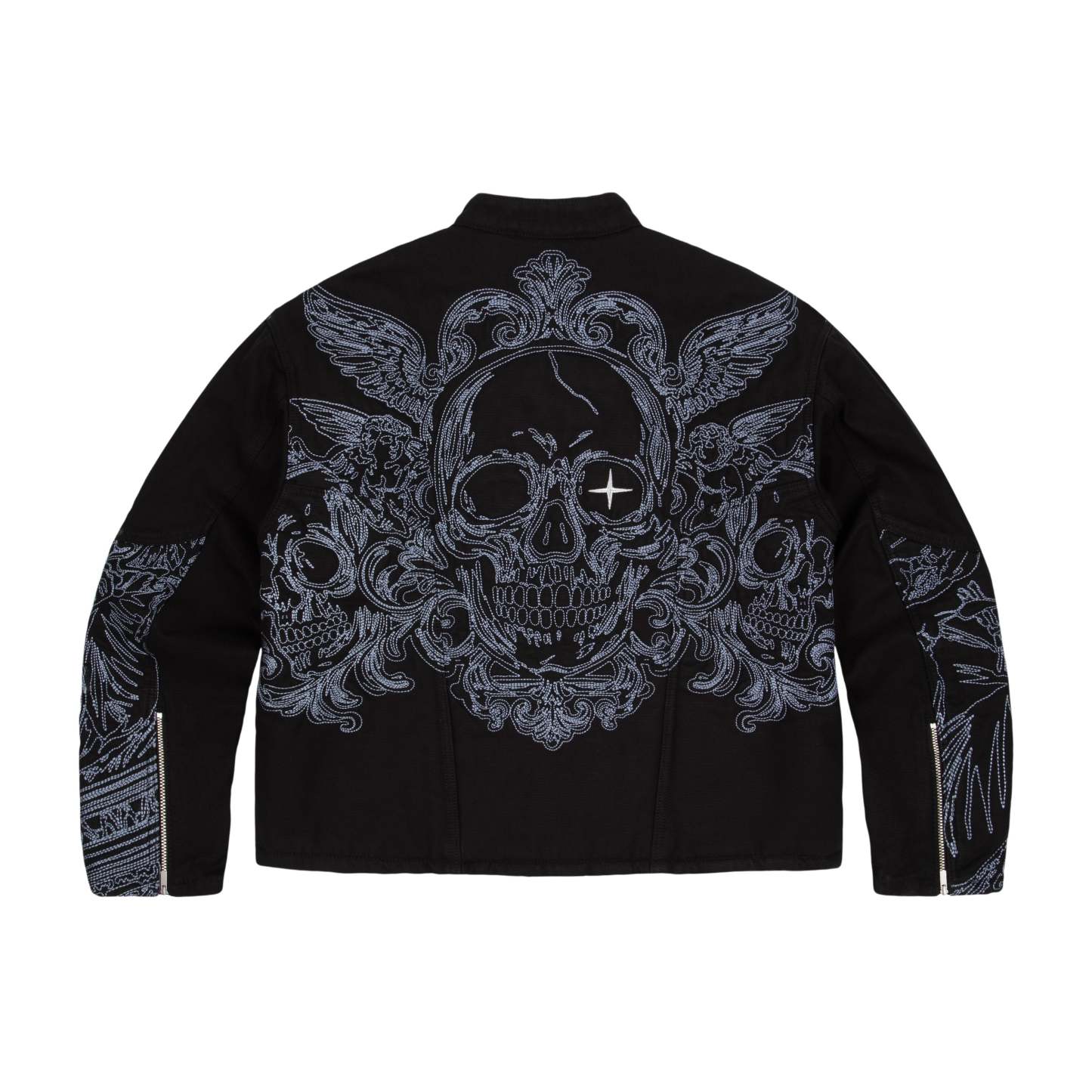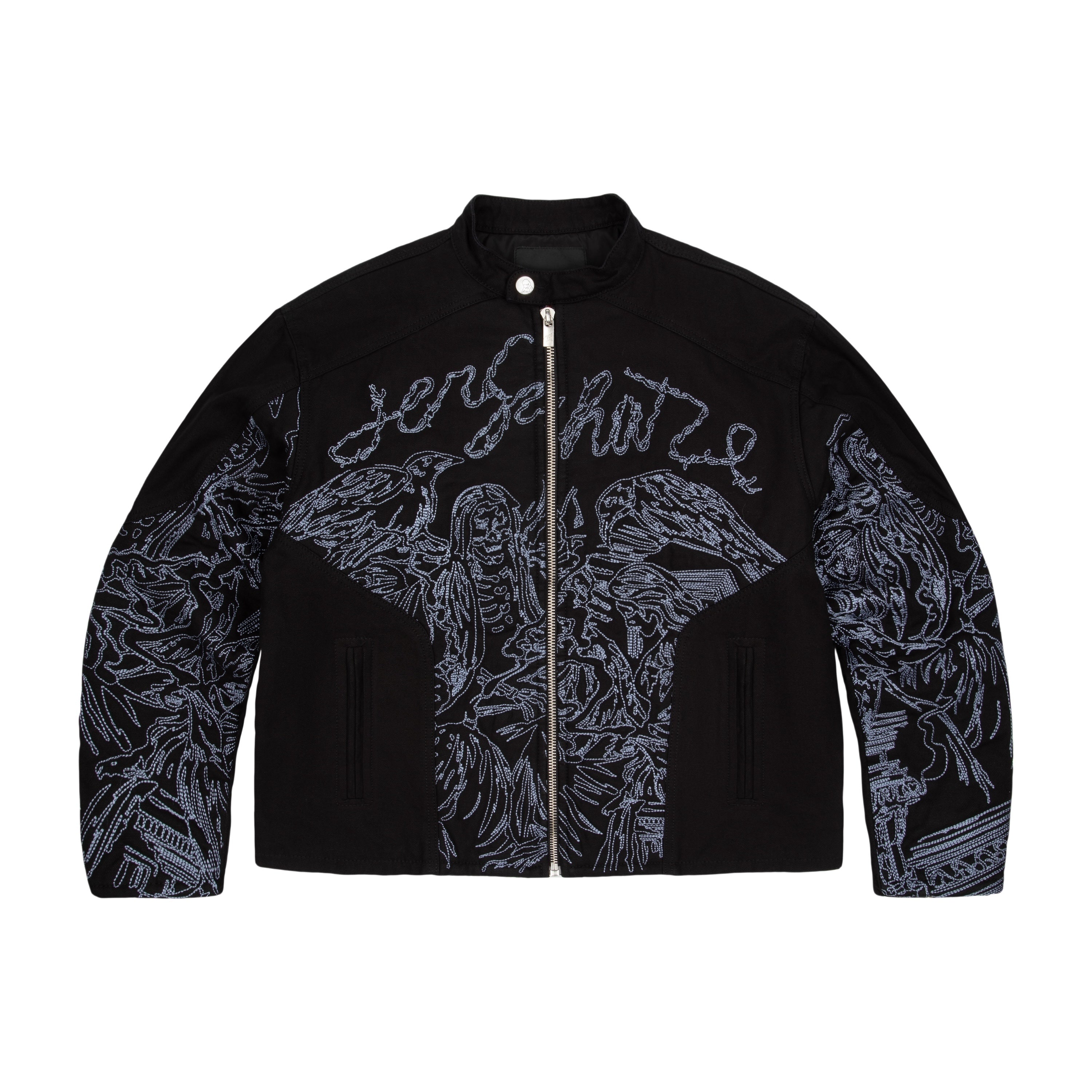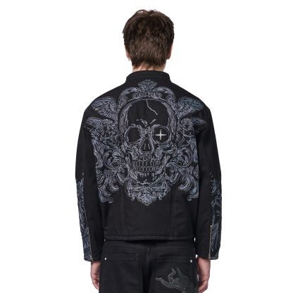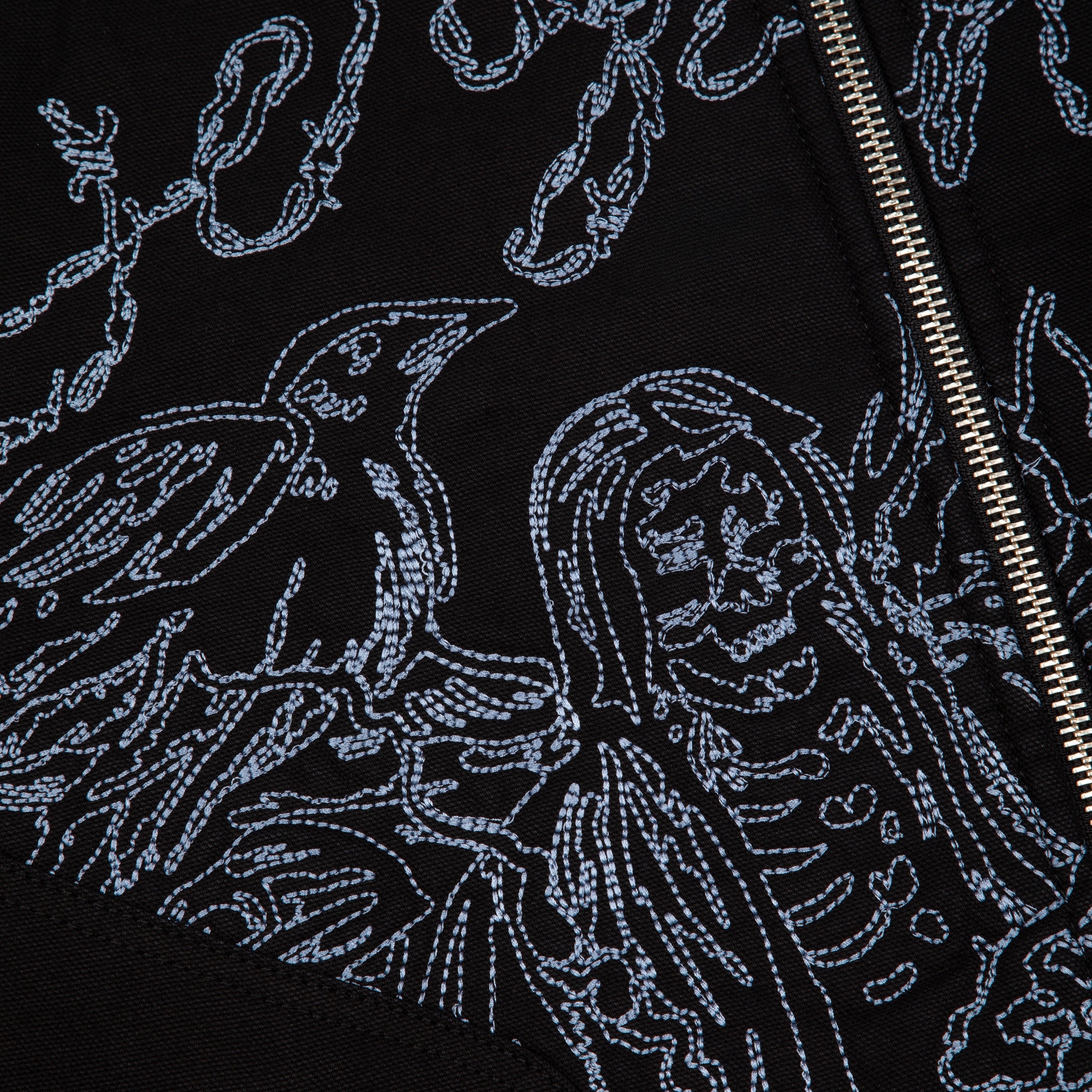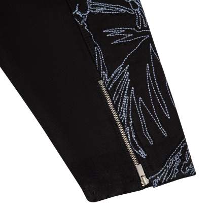 420gsm canvas denim / 100% cotton / mat polyester lining / line art embroidery on front, back and sleeves / with YKK zipper / zip details on sleeves / custom button / fits true to size