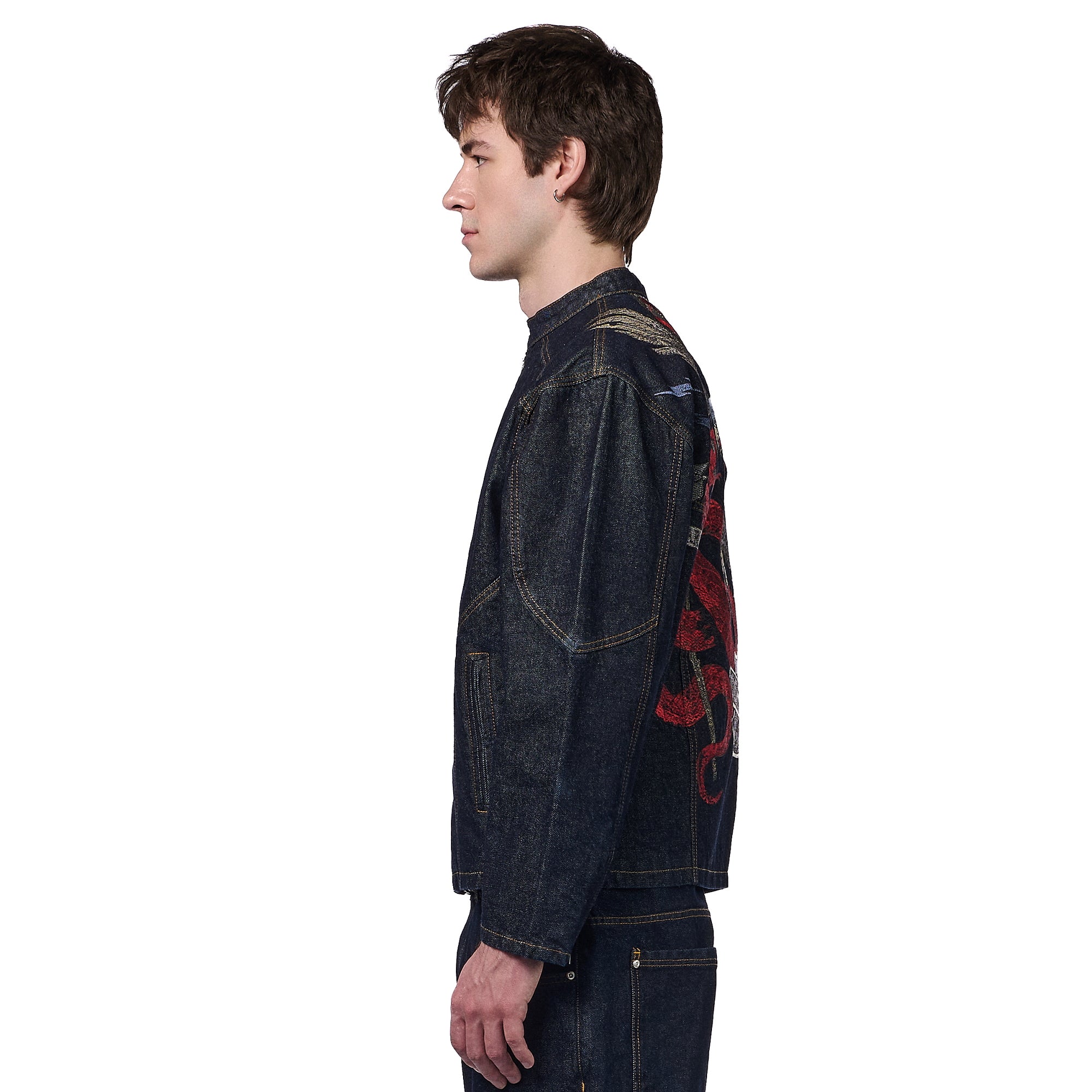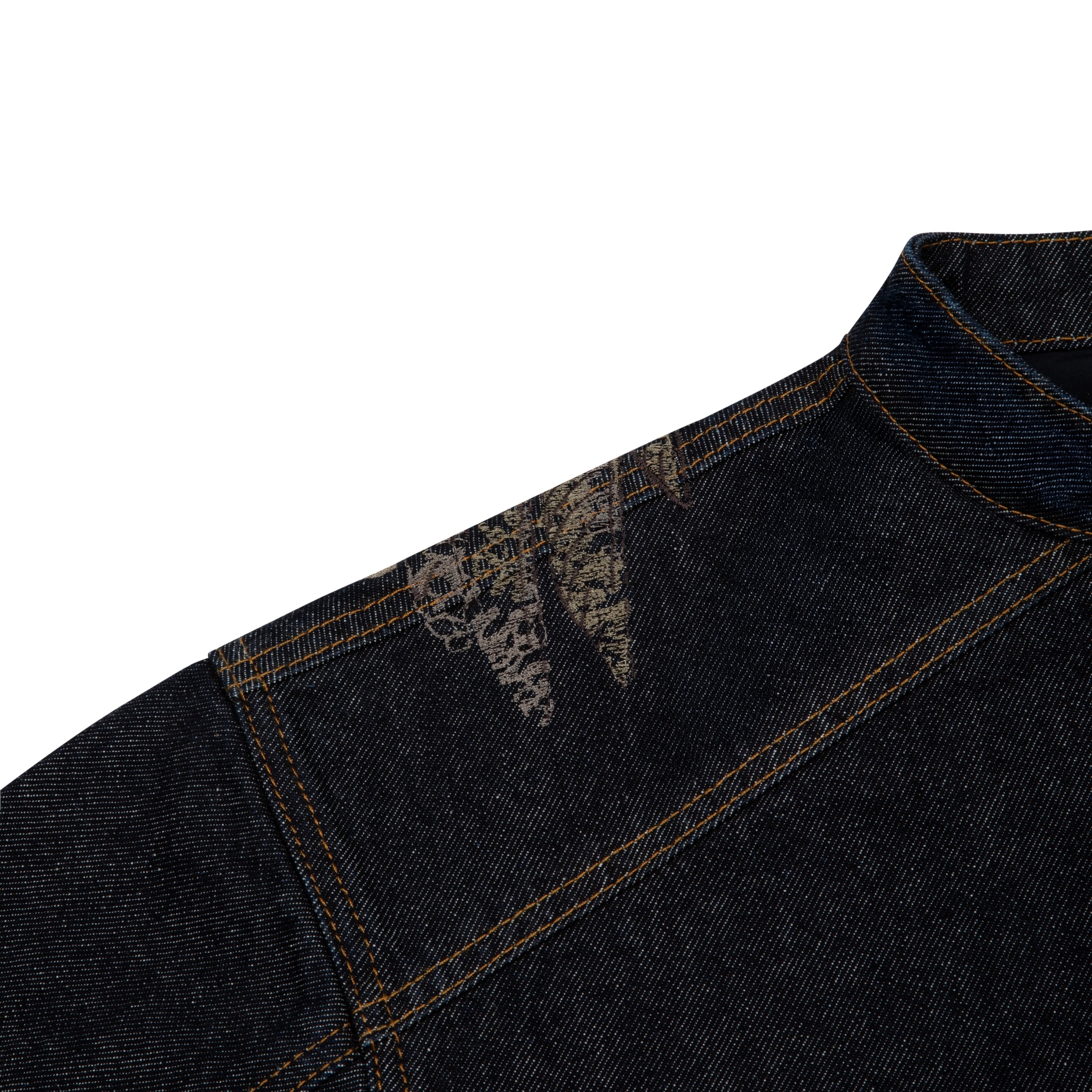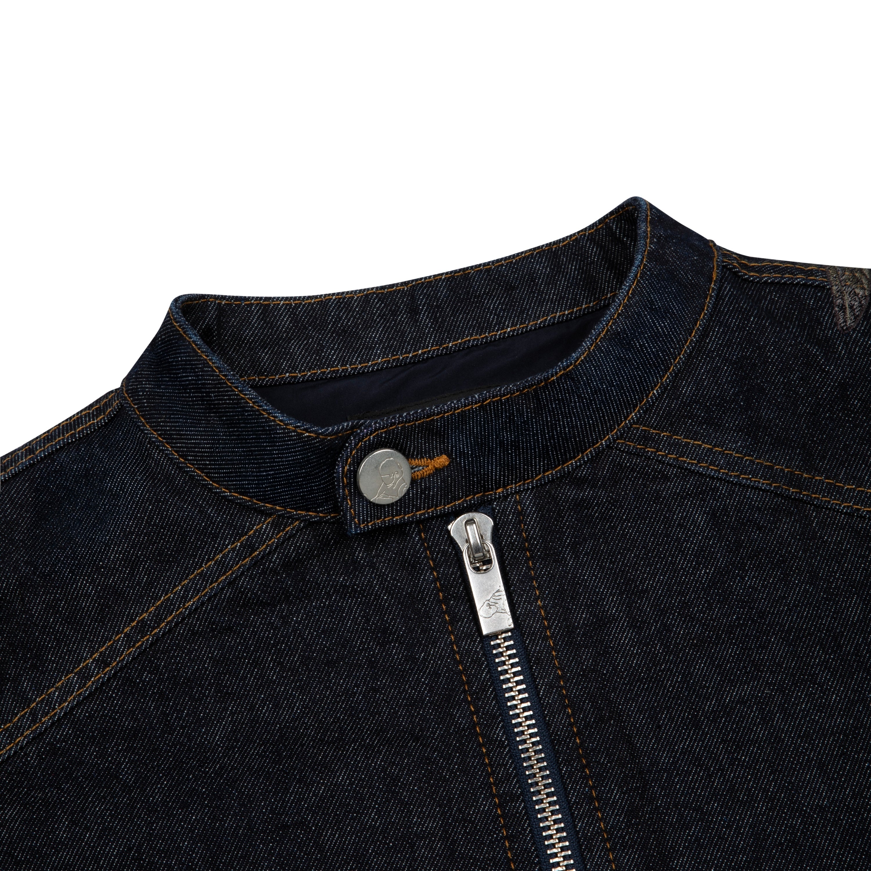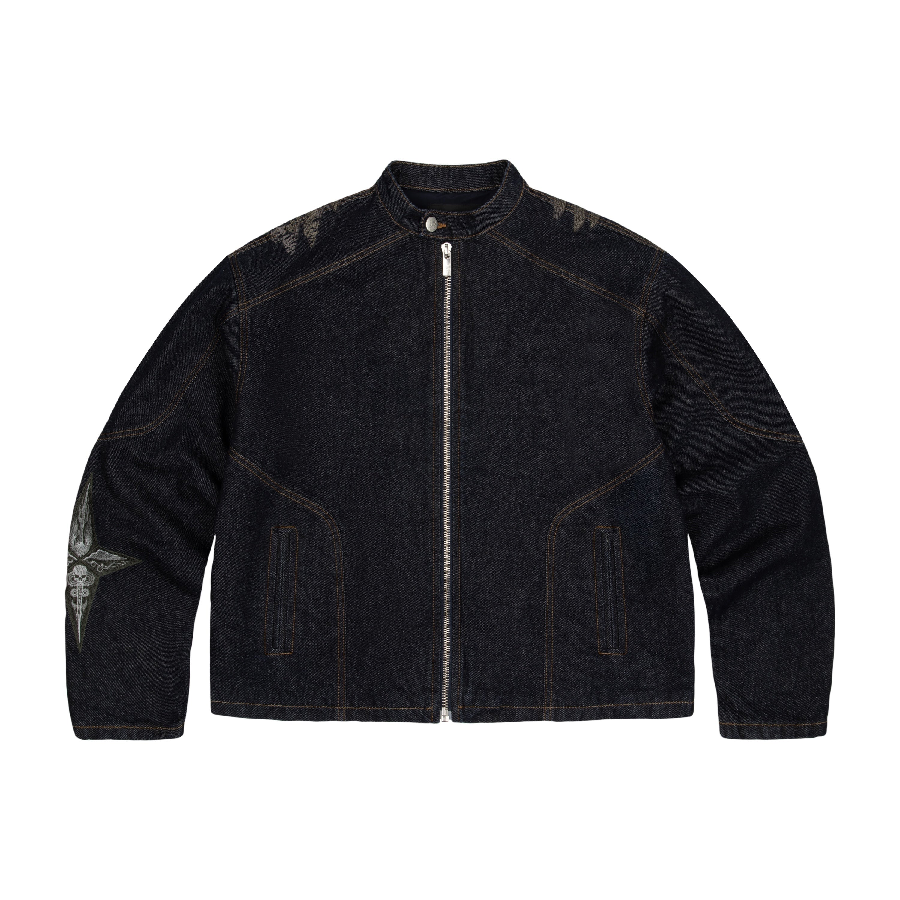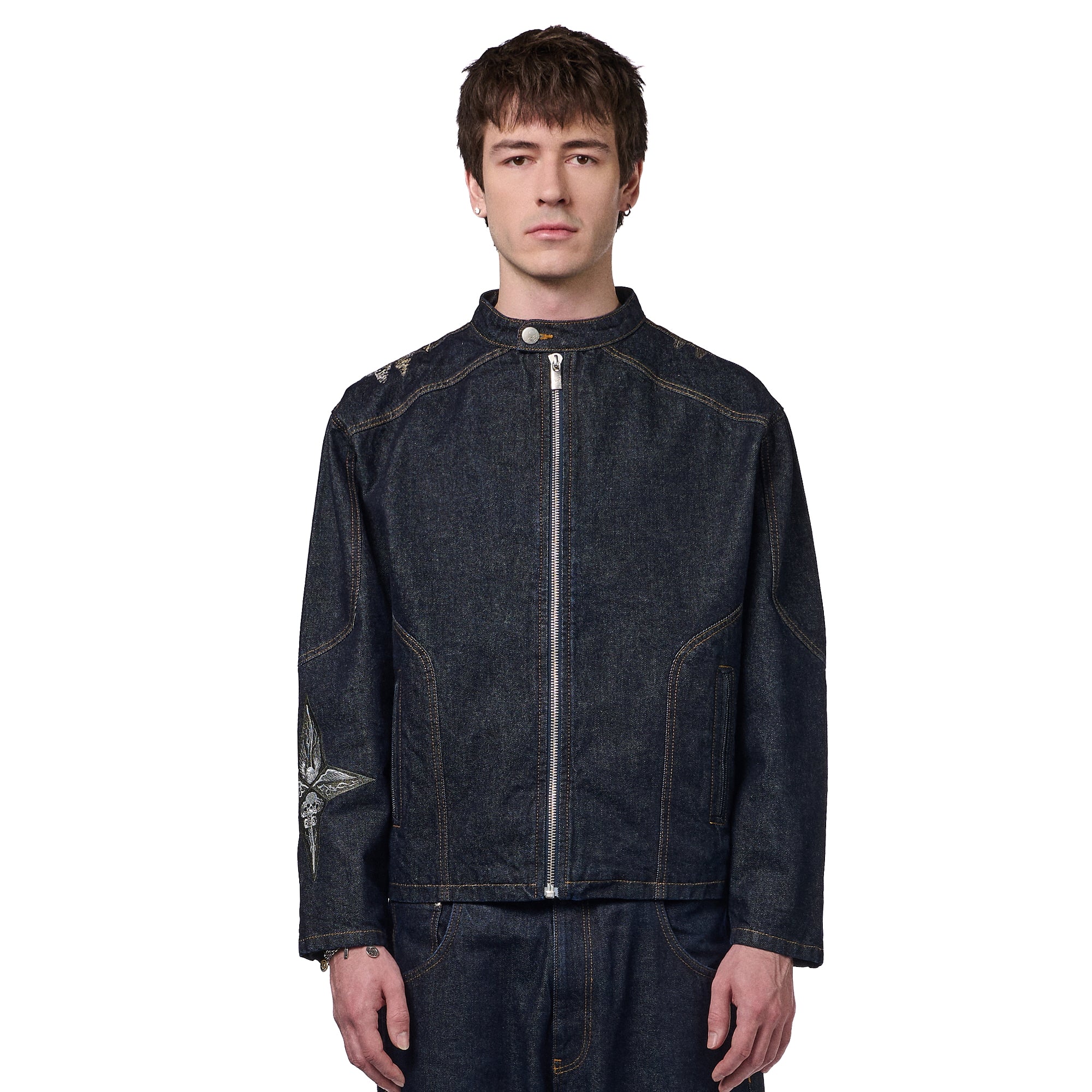14,5oz denim / 100% cotton / mat polyester lining / embroidery on back and sleeves / with YKK zipper / zip details on sleeves / custom buttons / fits true to size