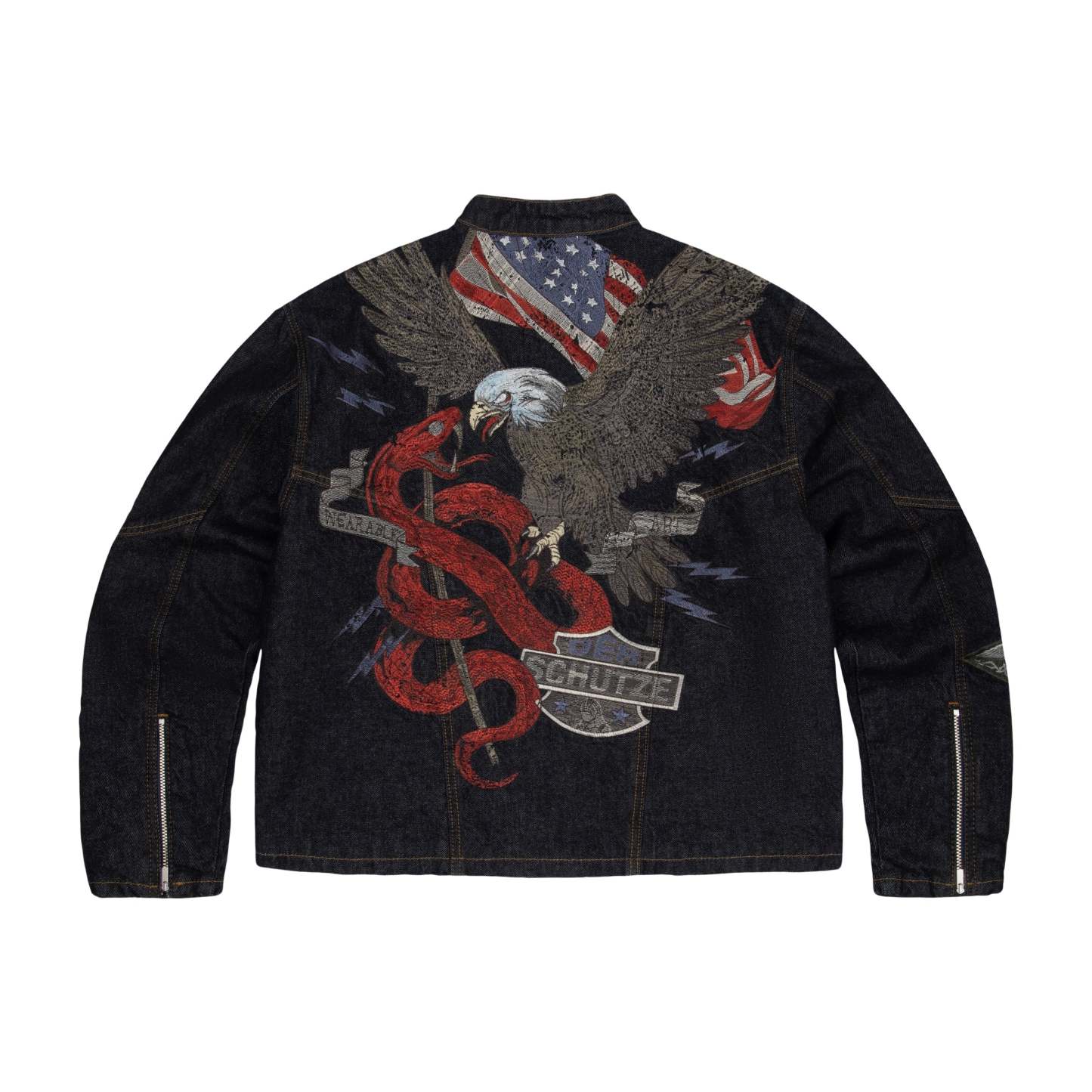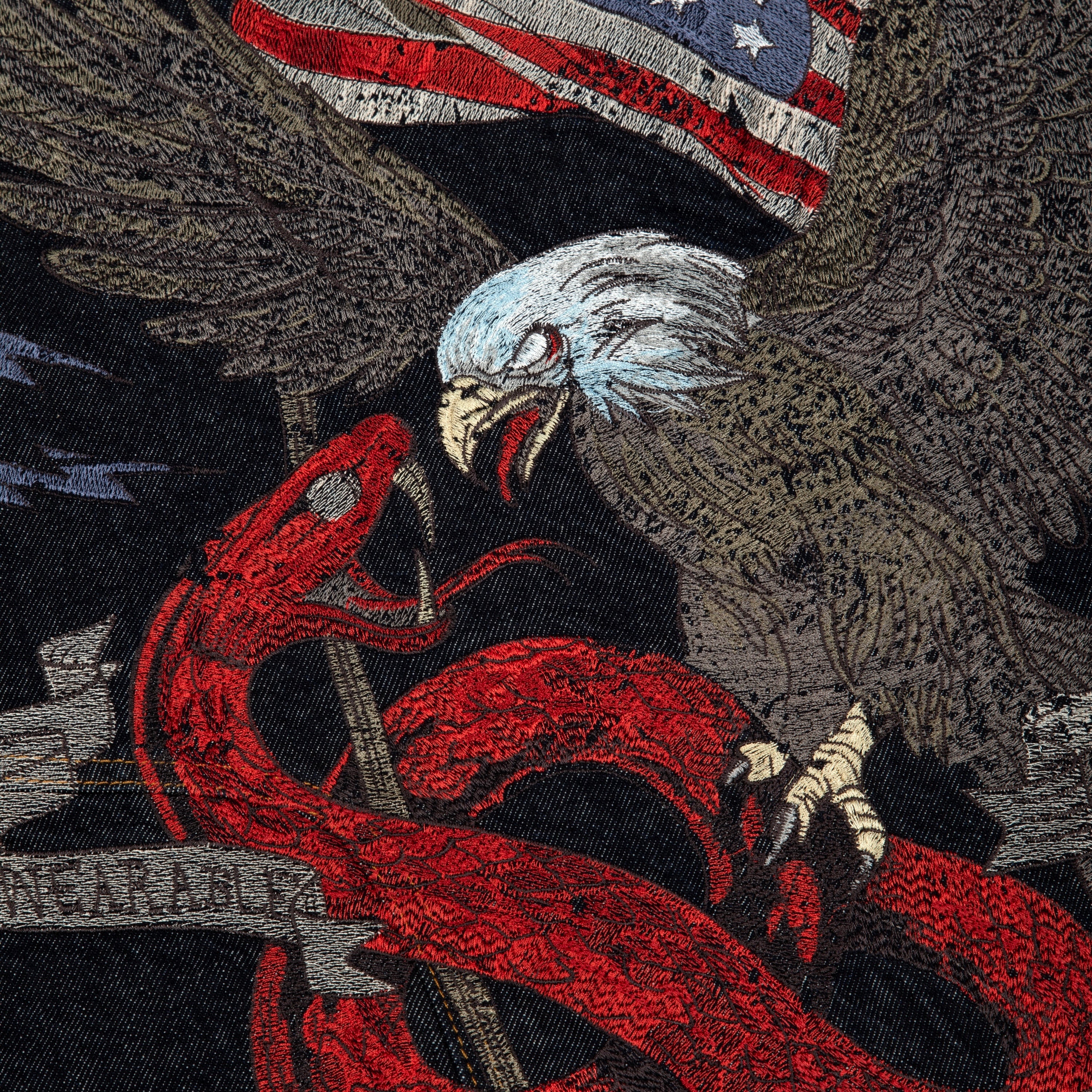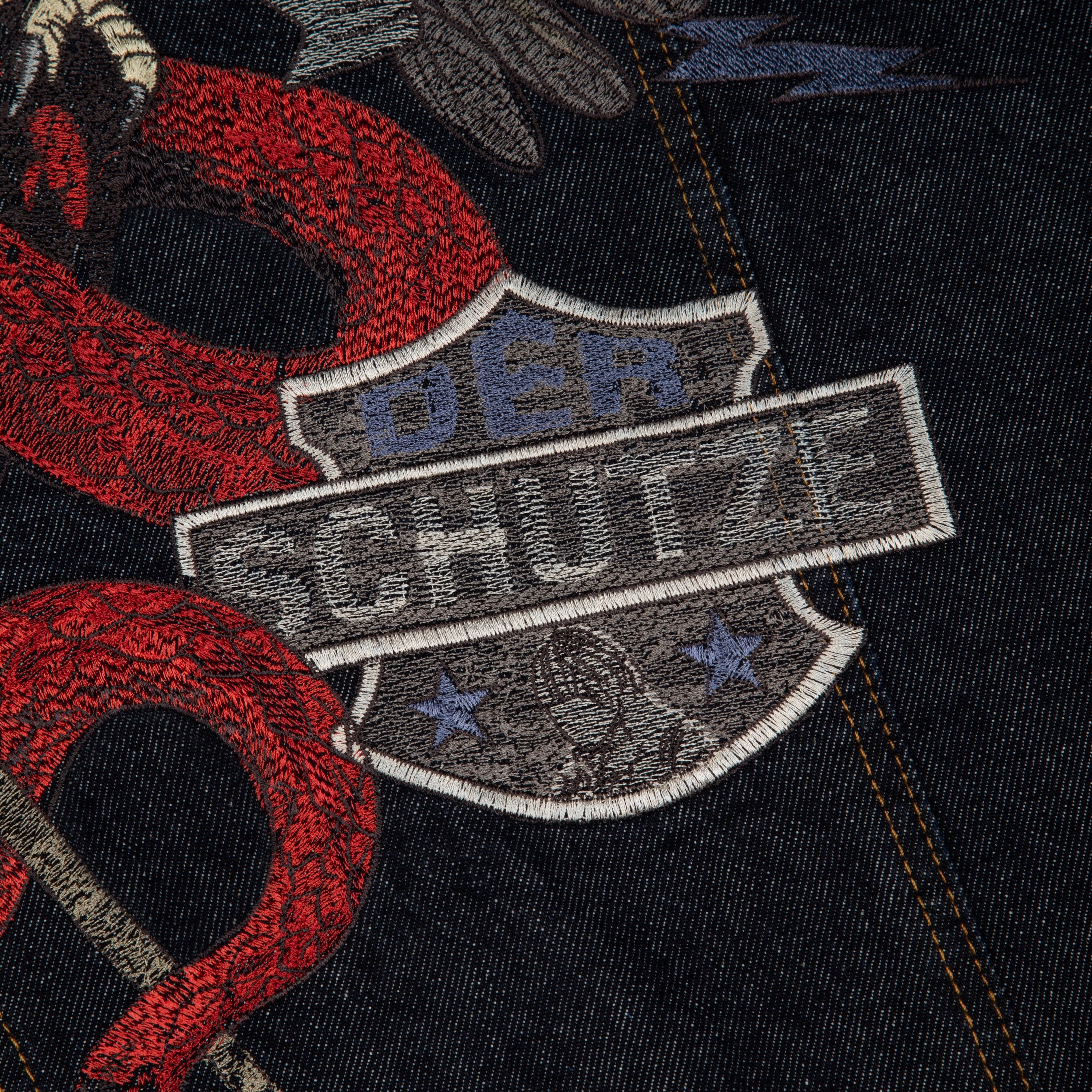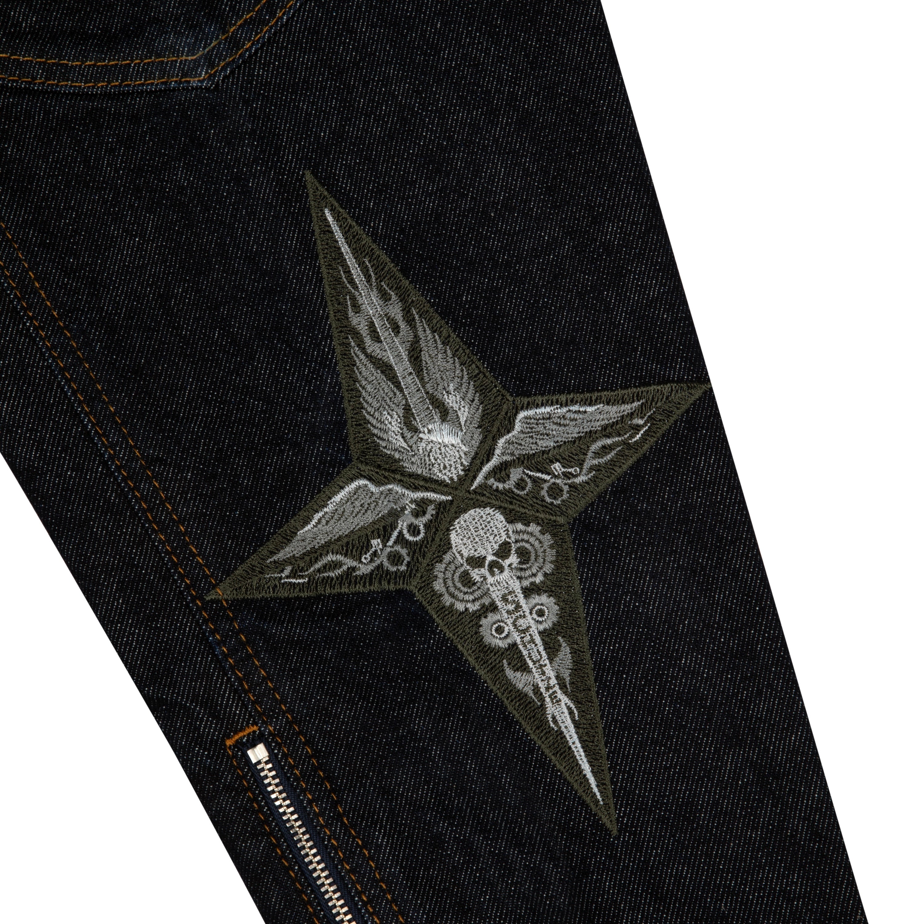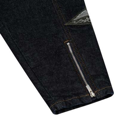 14,5oz denim / 100% cotton / mat polyester lining / embroidery on back and sleeves / with YKK zipper / zip details on sleeves / custom buttons / fits true to size