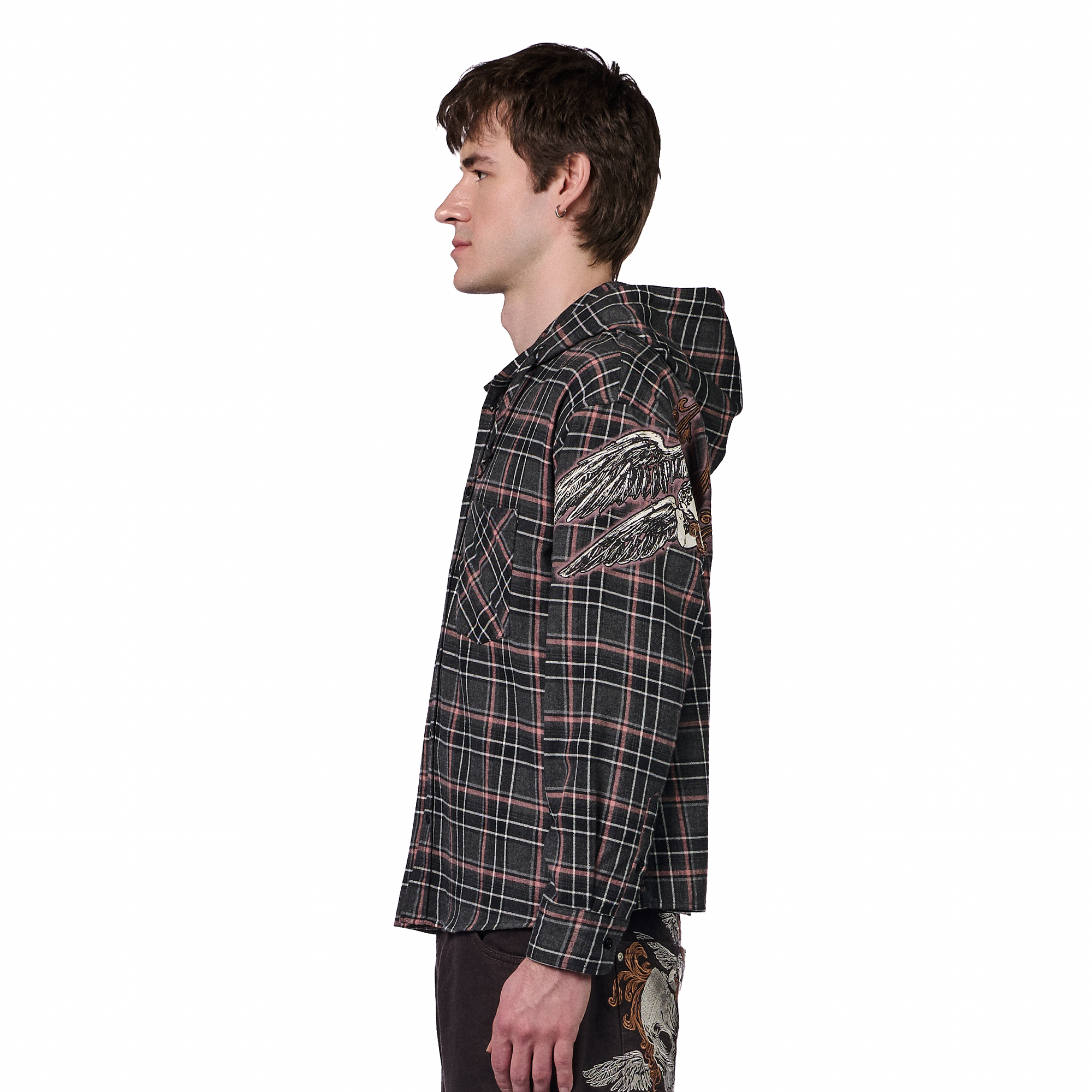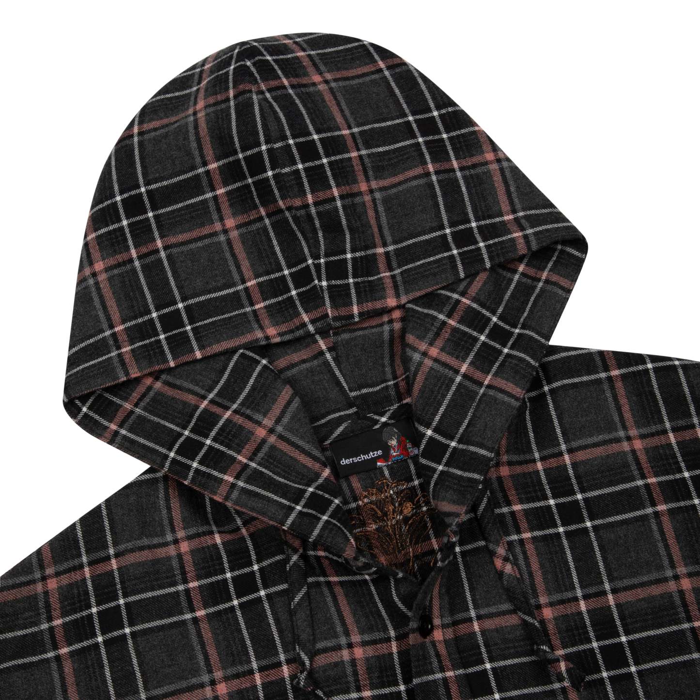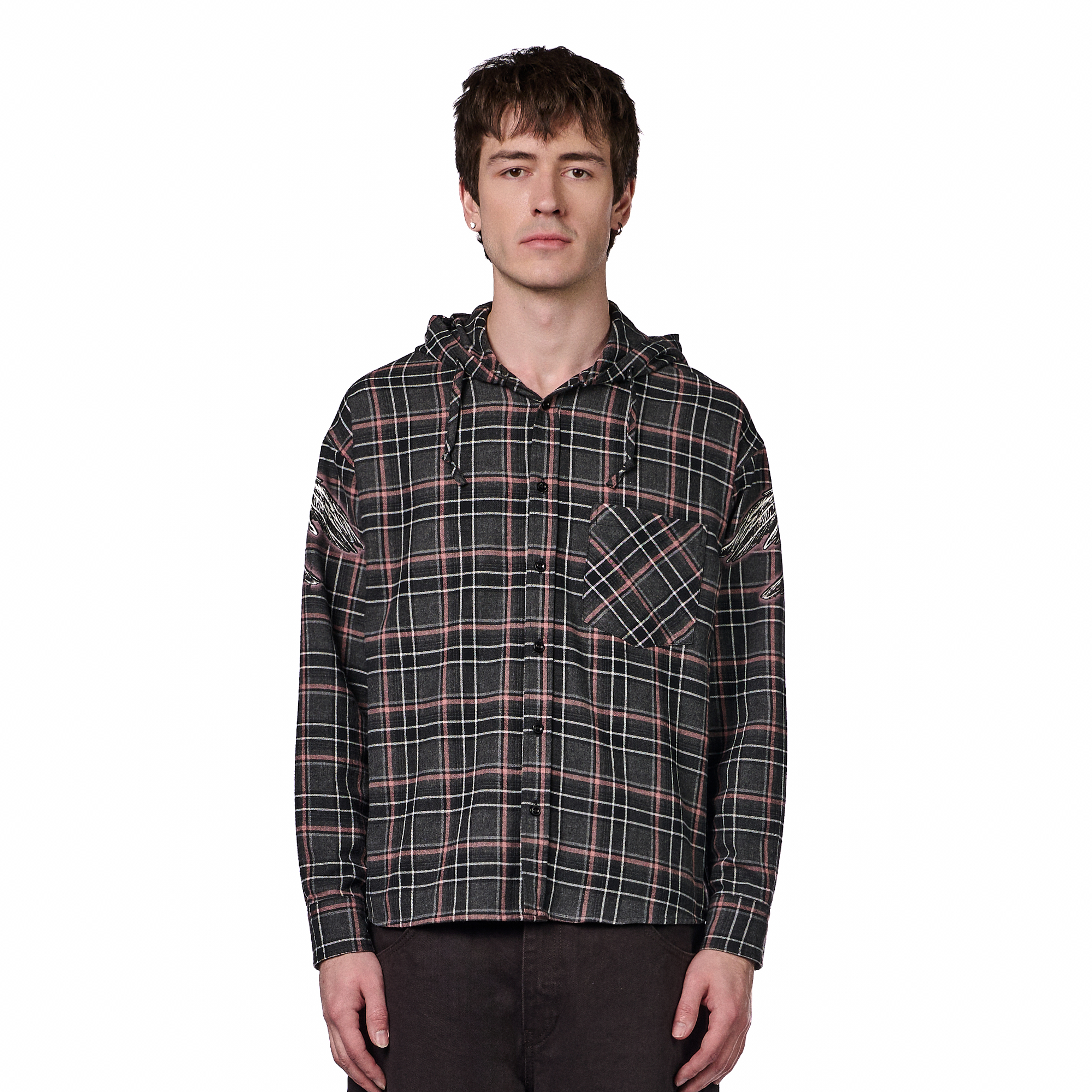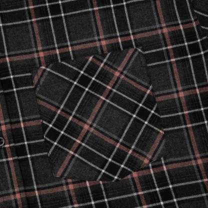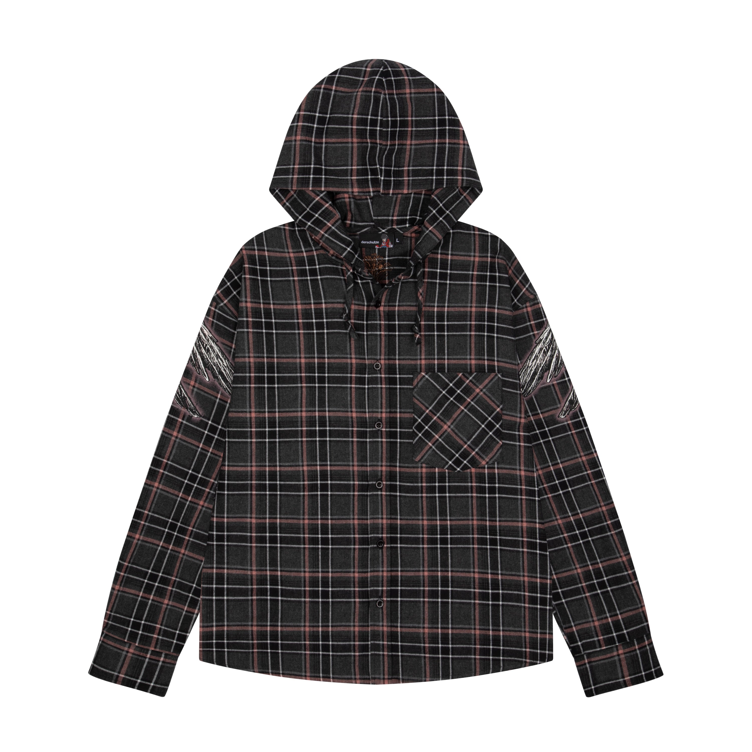 50% cotton 50% polyester plaid flannel fabric / printed back and sleeves with embroidered details / with hood / custom buttons / curved hem / relaxed fit / fits true to size / shipping is delayed by up to 2 weeks