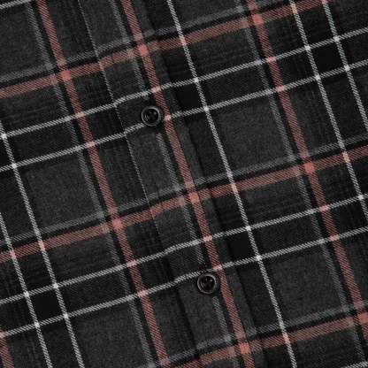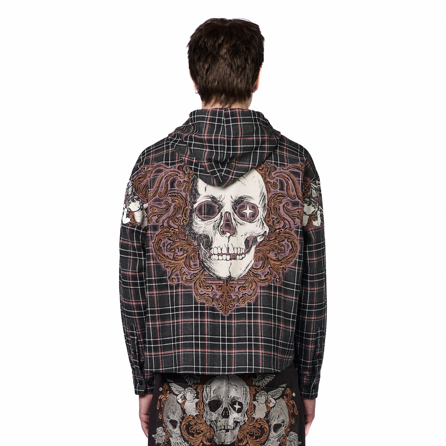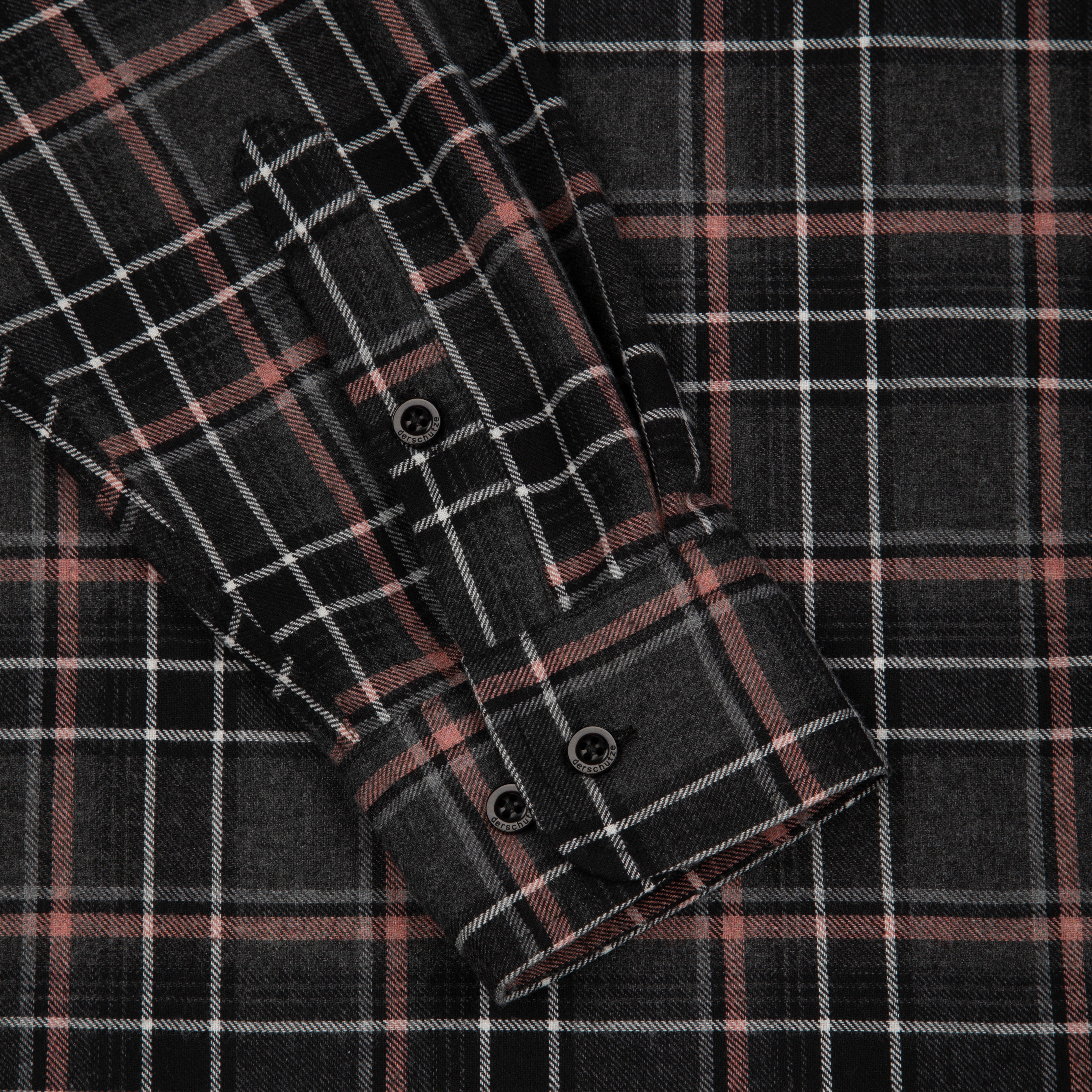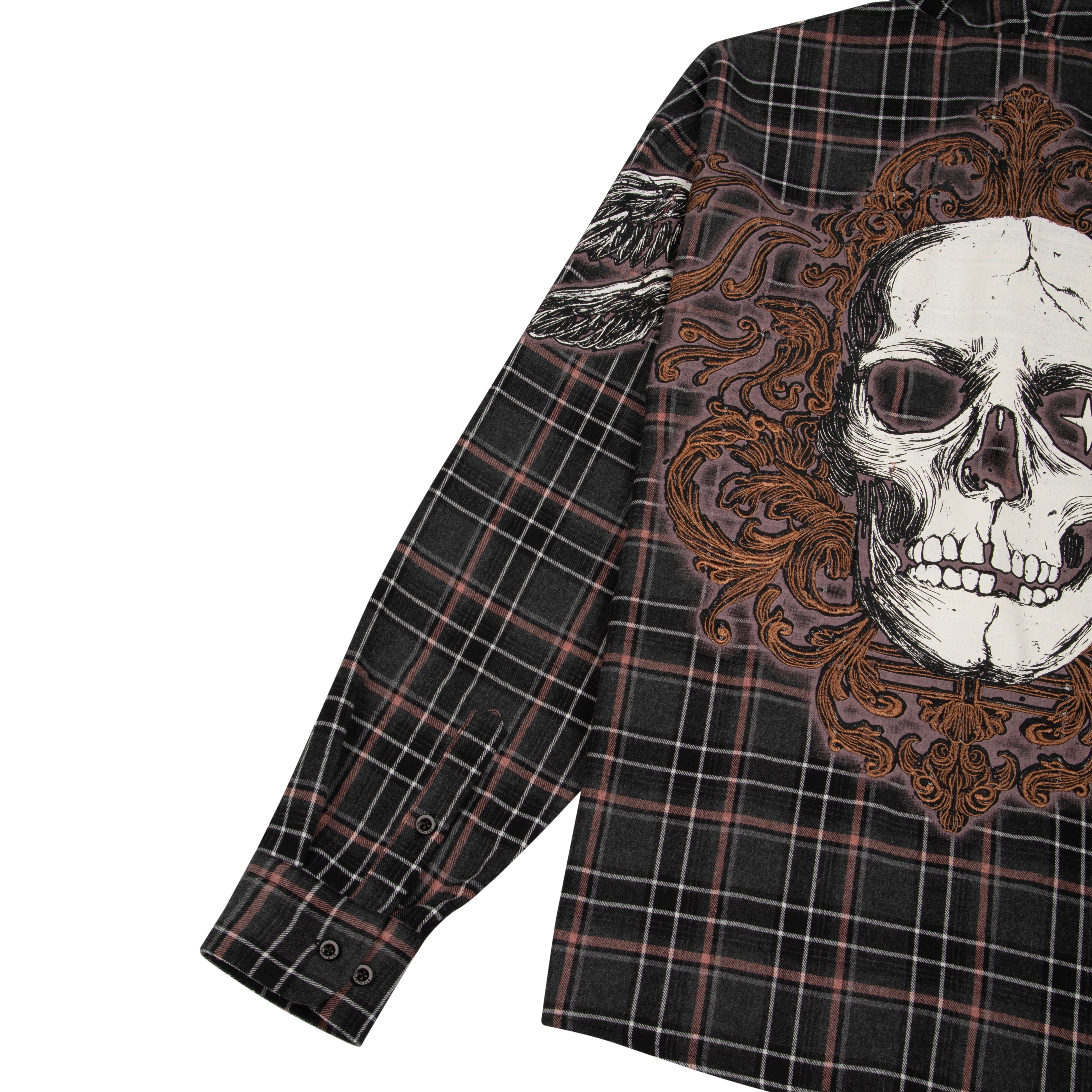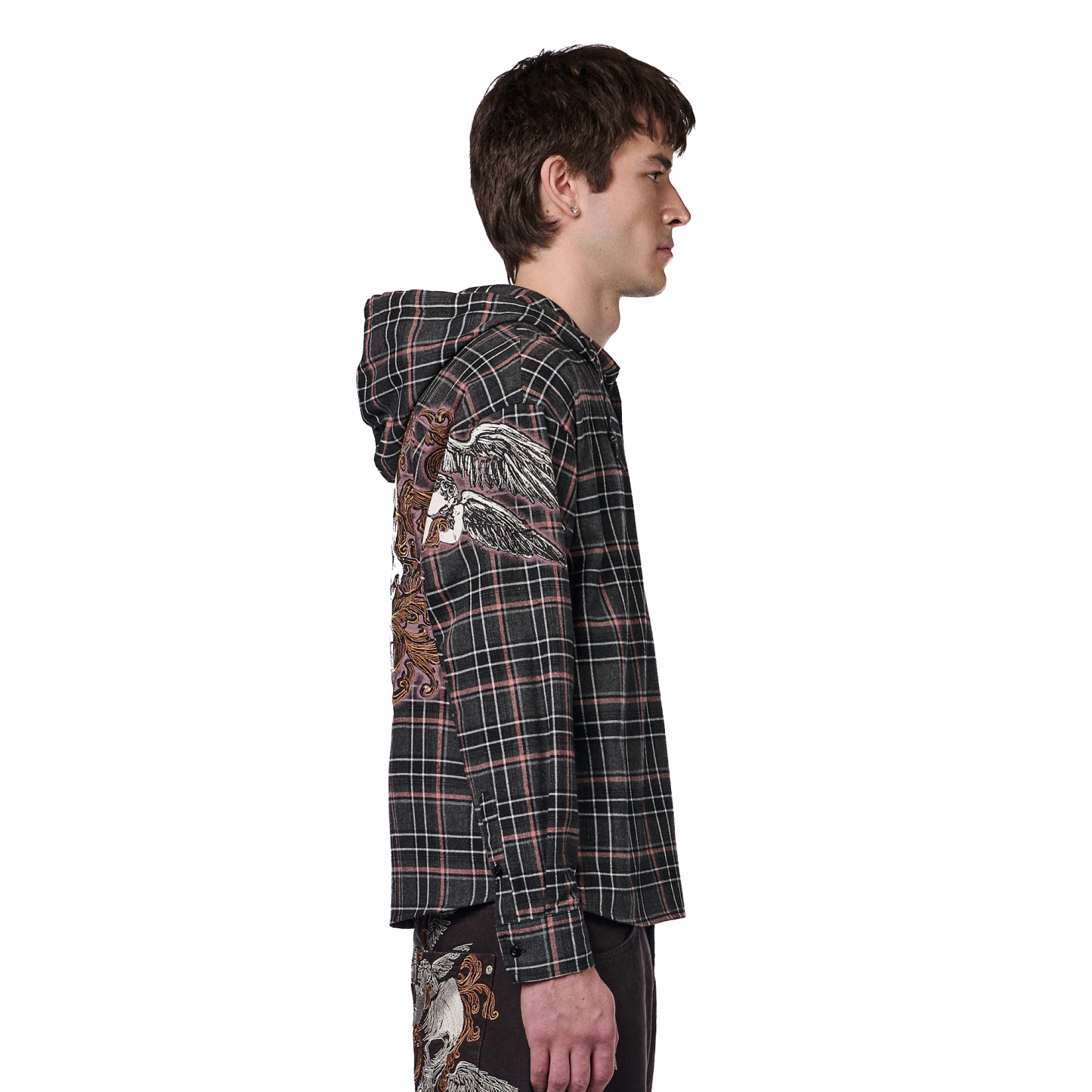 50% cotton 50% polyester plaid flannel fabric / printed back and sleeves with embroidered details / with hood / custom buttons / curved hem / relaxed fit / fits true to size / shipping is delayed by up to 2 weeks