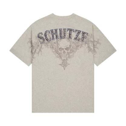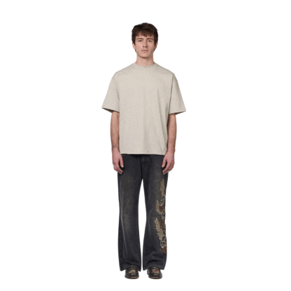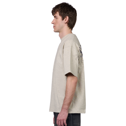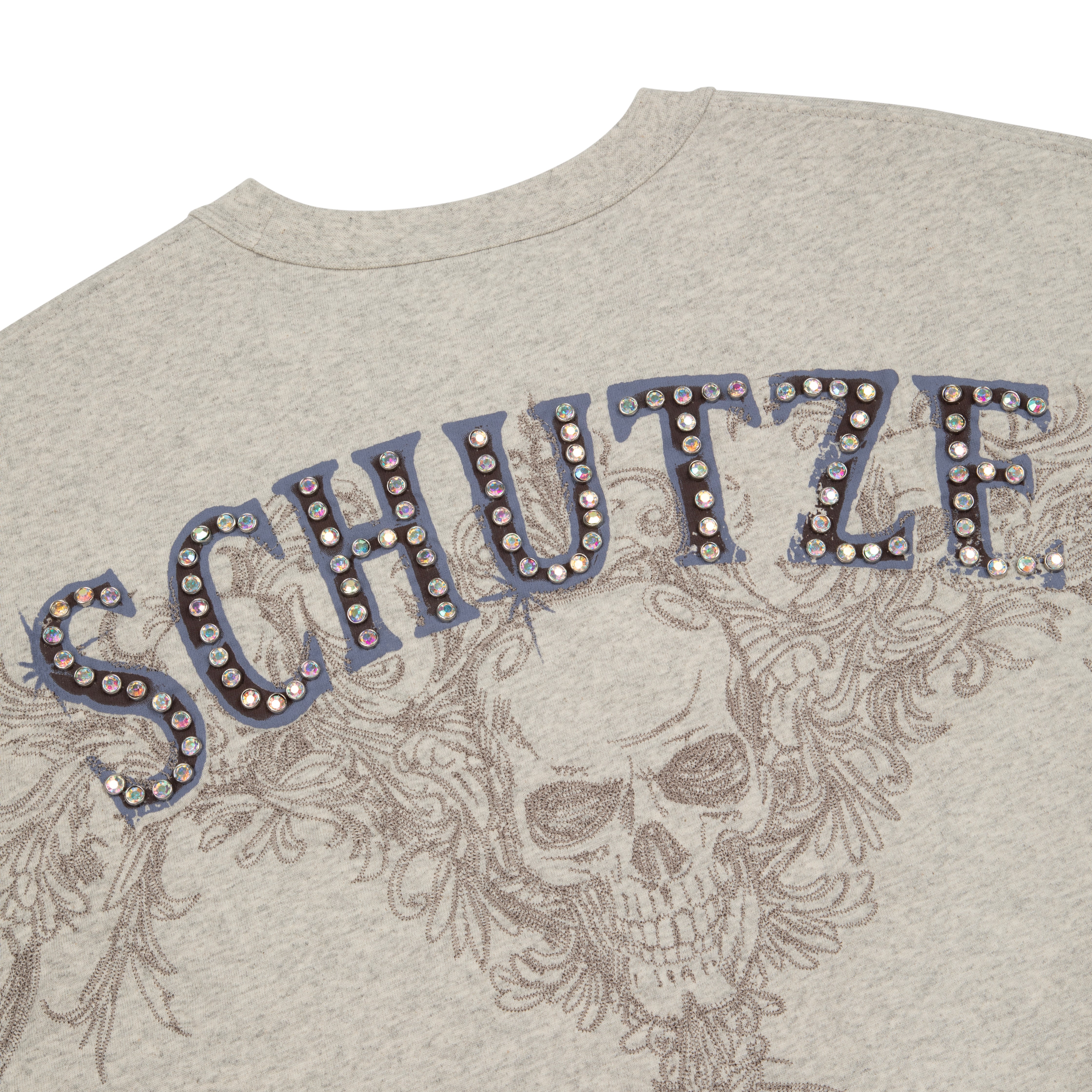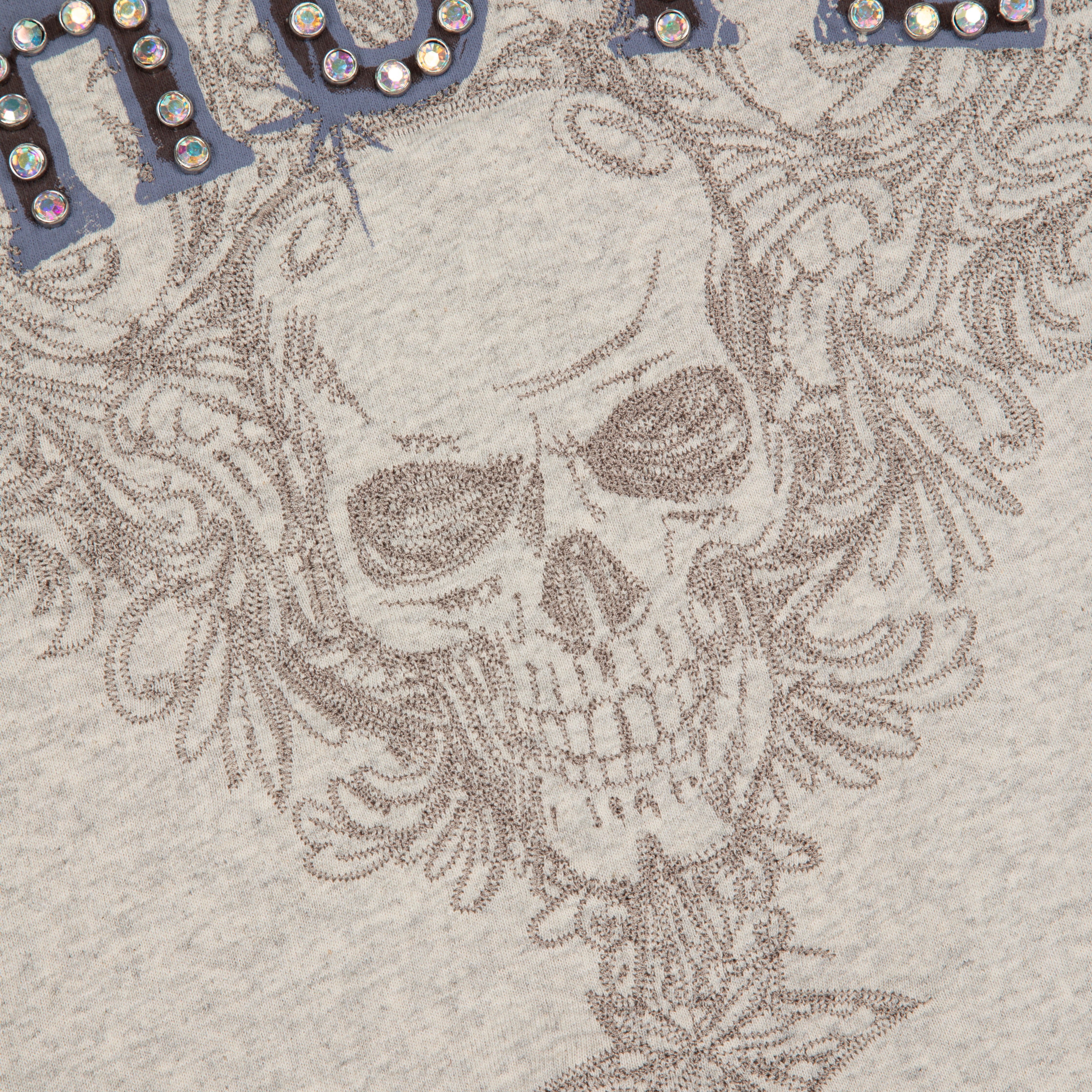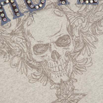 260gsm fabric / 100% preshrunk cotton / print and embroidery on back / with rhinestone application on back / distressing on collar and hem / fits true to size