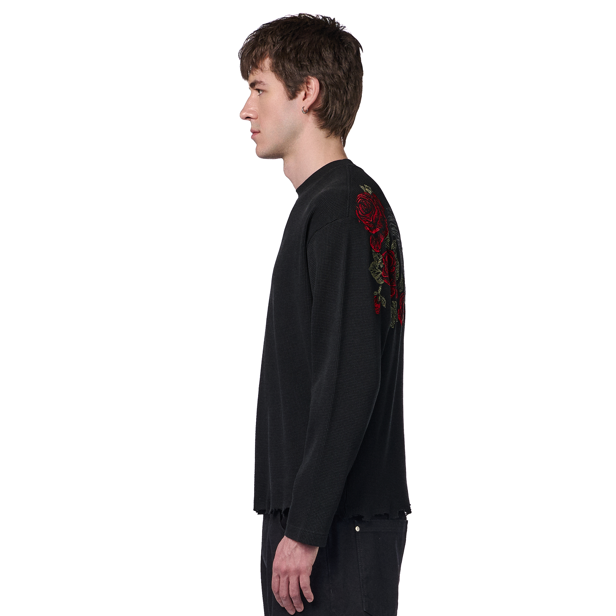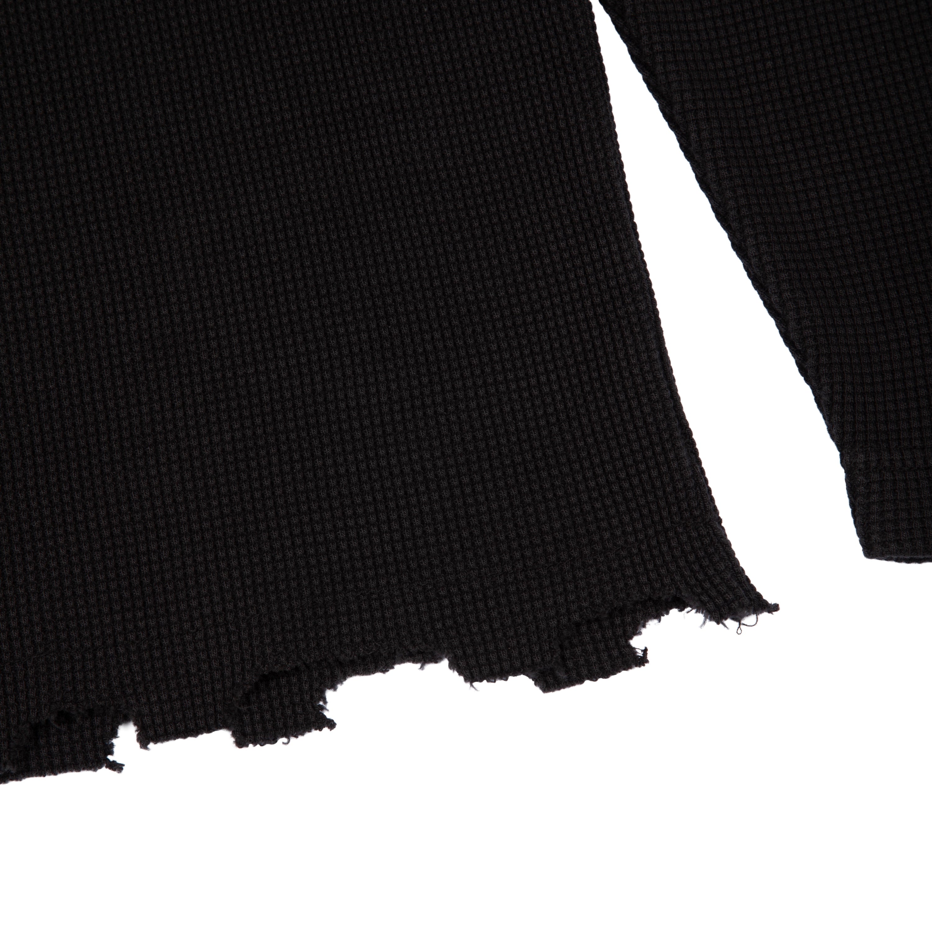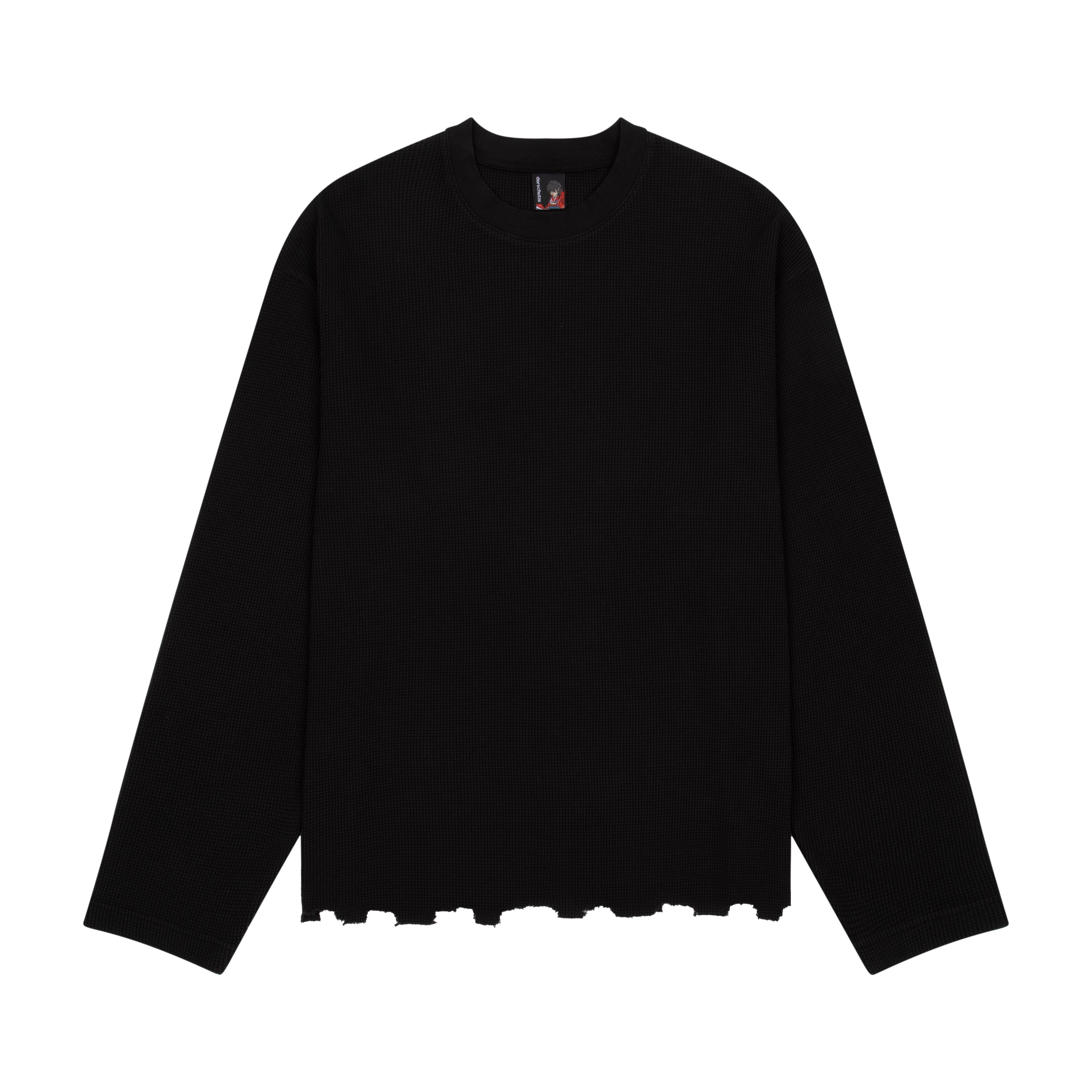 255gsm preshrunk waffle fabric / 100% cotton / embroidery on back and sleeves / distressed hem / fits true to size