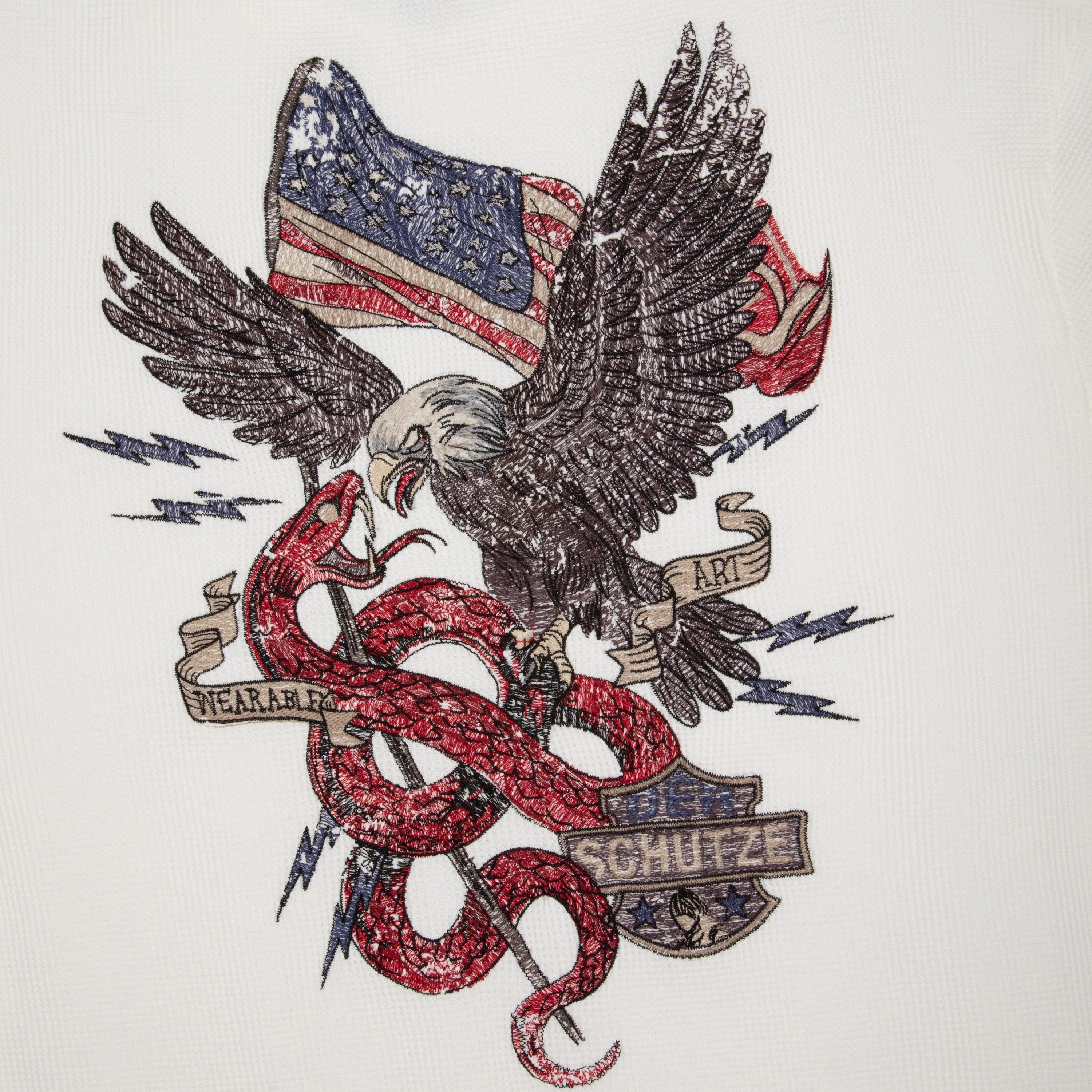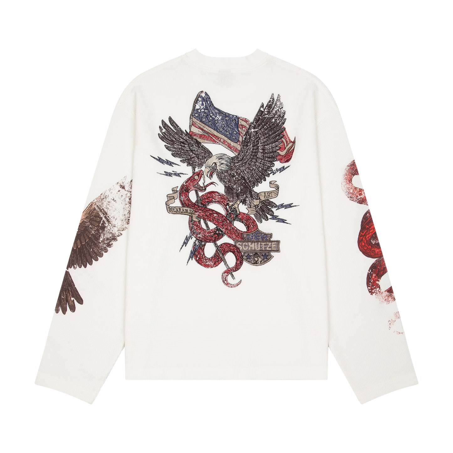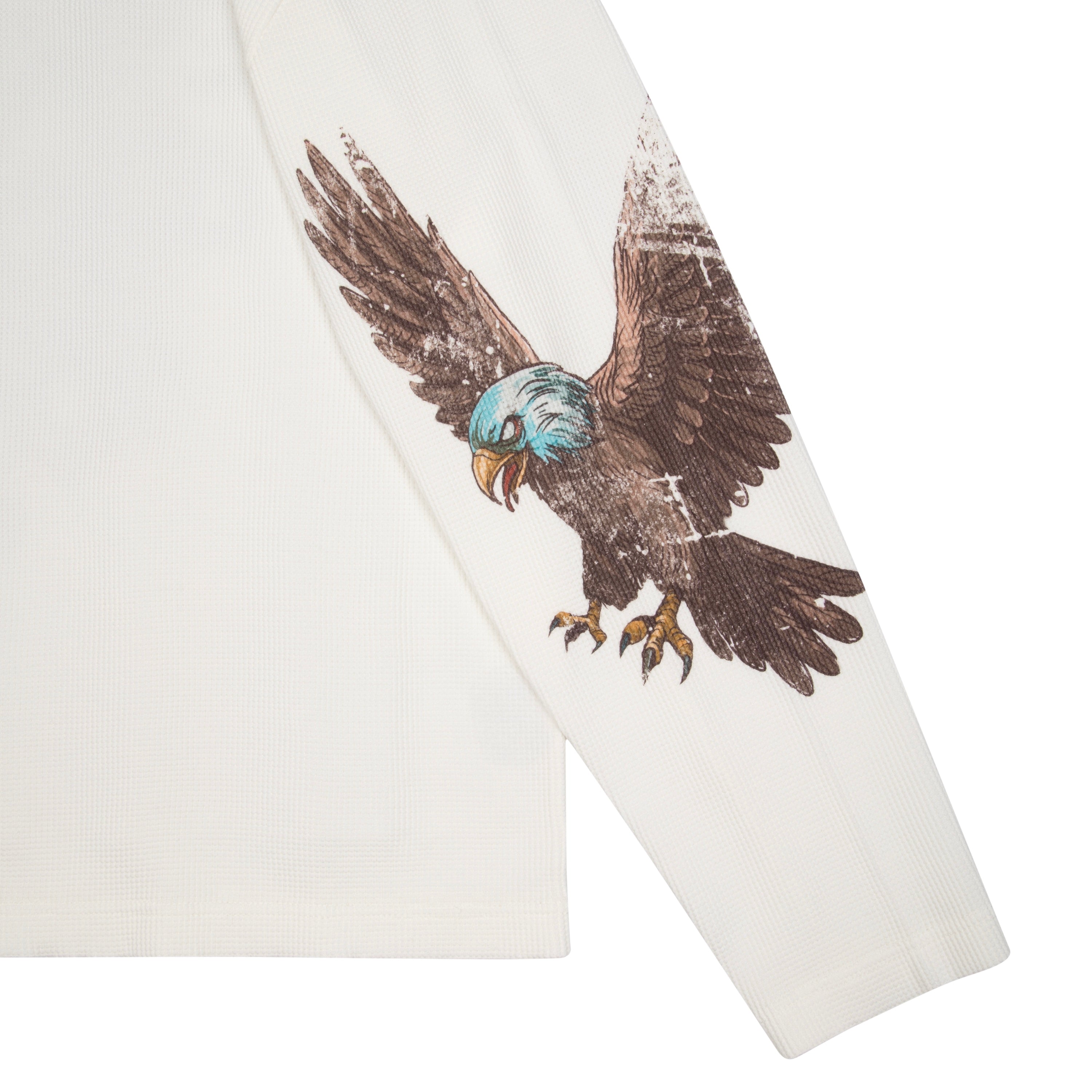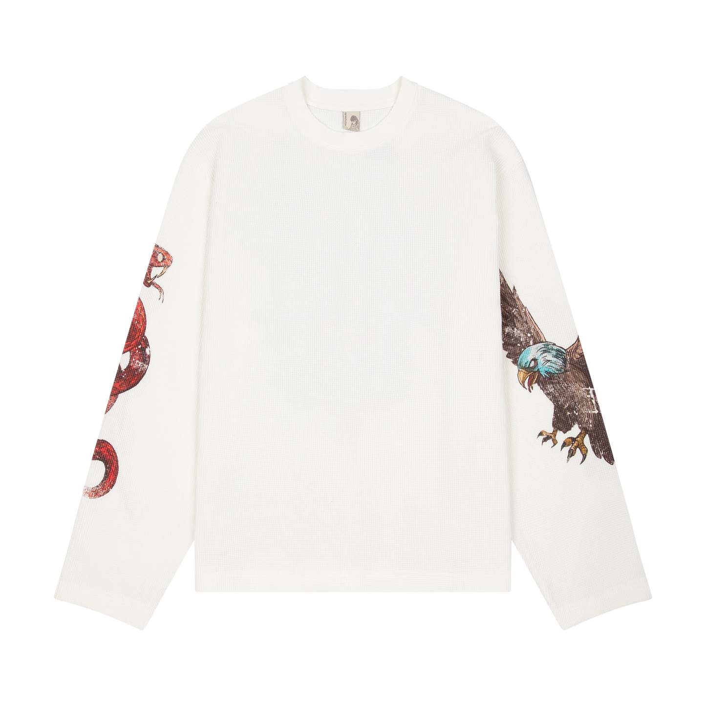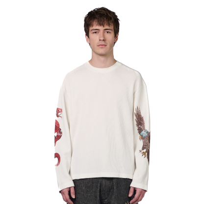 255gsm preshrunk waffle fabric / 100% cotton / printed sleeves / embroidery on back / fits true to size