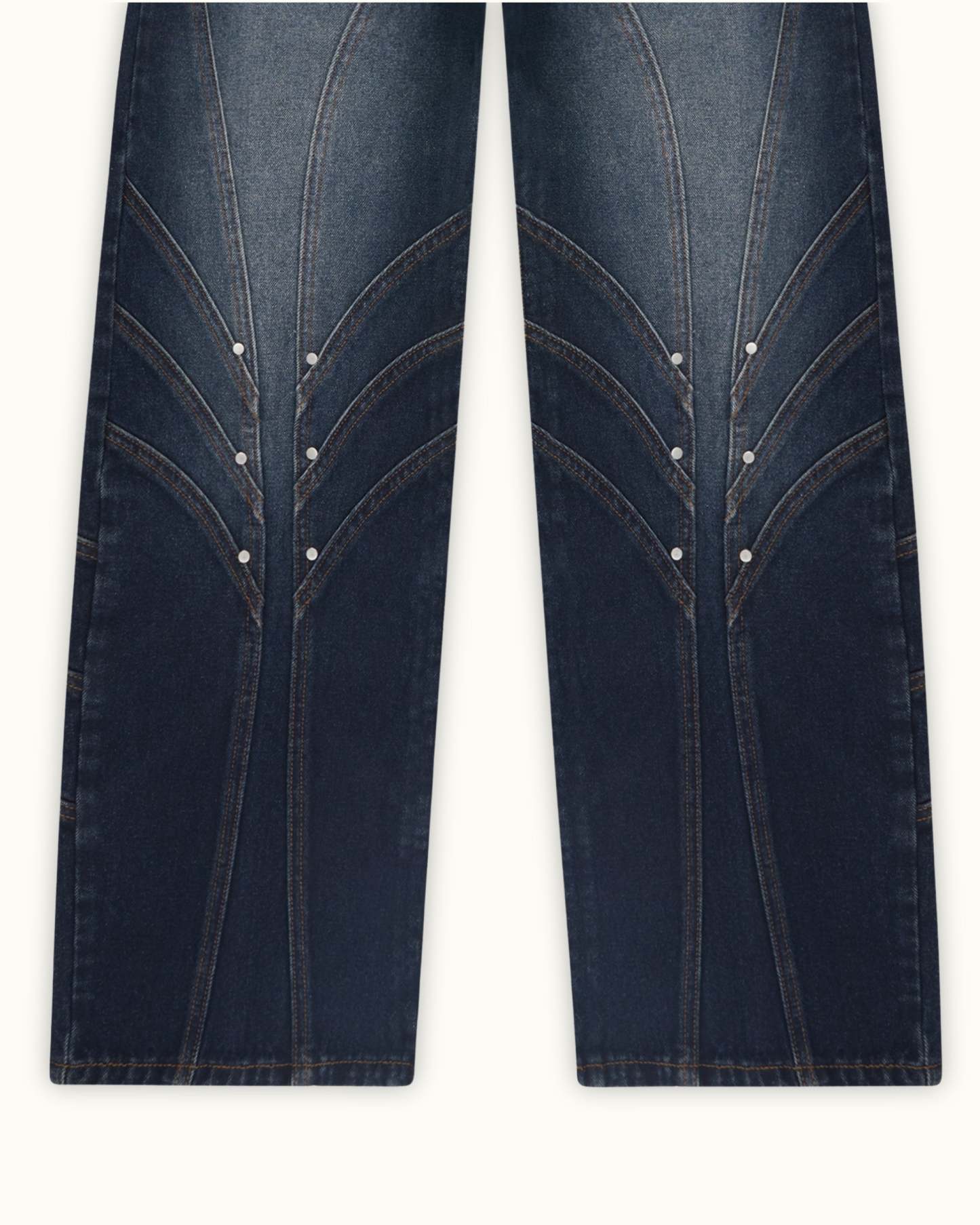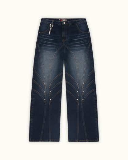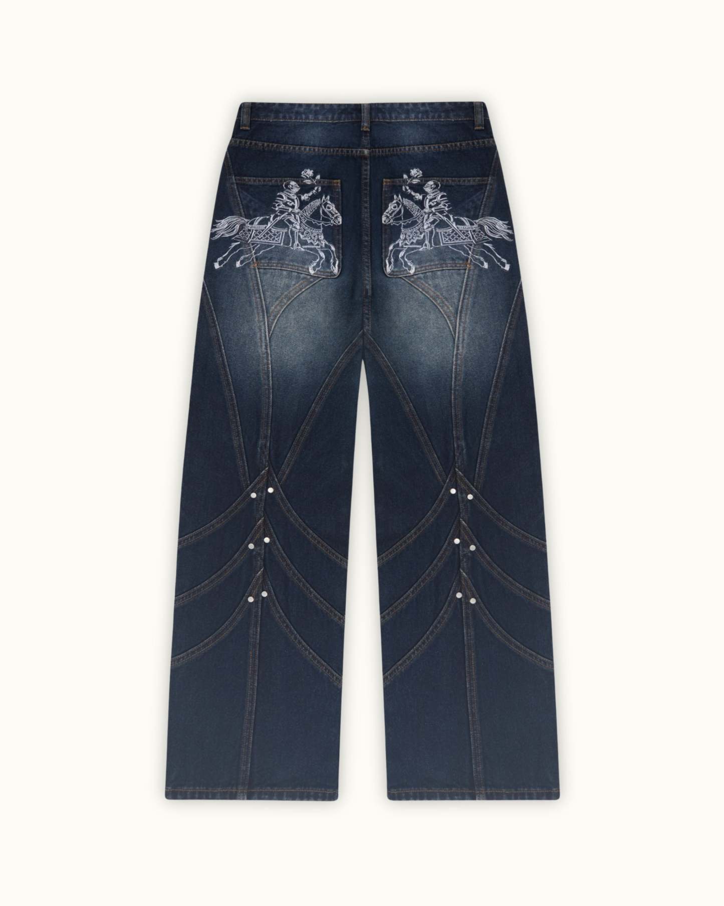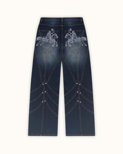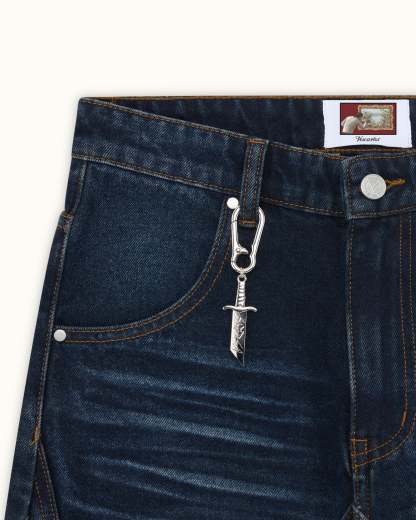 Inspired by medieval knights, this denim features front and back panelling finished with metal rivets at each intersecting seams. Subtle thigh fade w/ dark indigo wash. Embroidery of jousting knights on the back pockets. Custom sword-shaped carabiner, engraved with the Vescartes name.
