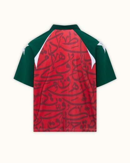 A tribute to North African heritage, the Morocco Jersey features a bold red body overlaid with flowing Arabic calligraphy and a veiled woman motif. The deep green raglan sleeves and star shoulder embroideries round off the national palette.