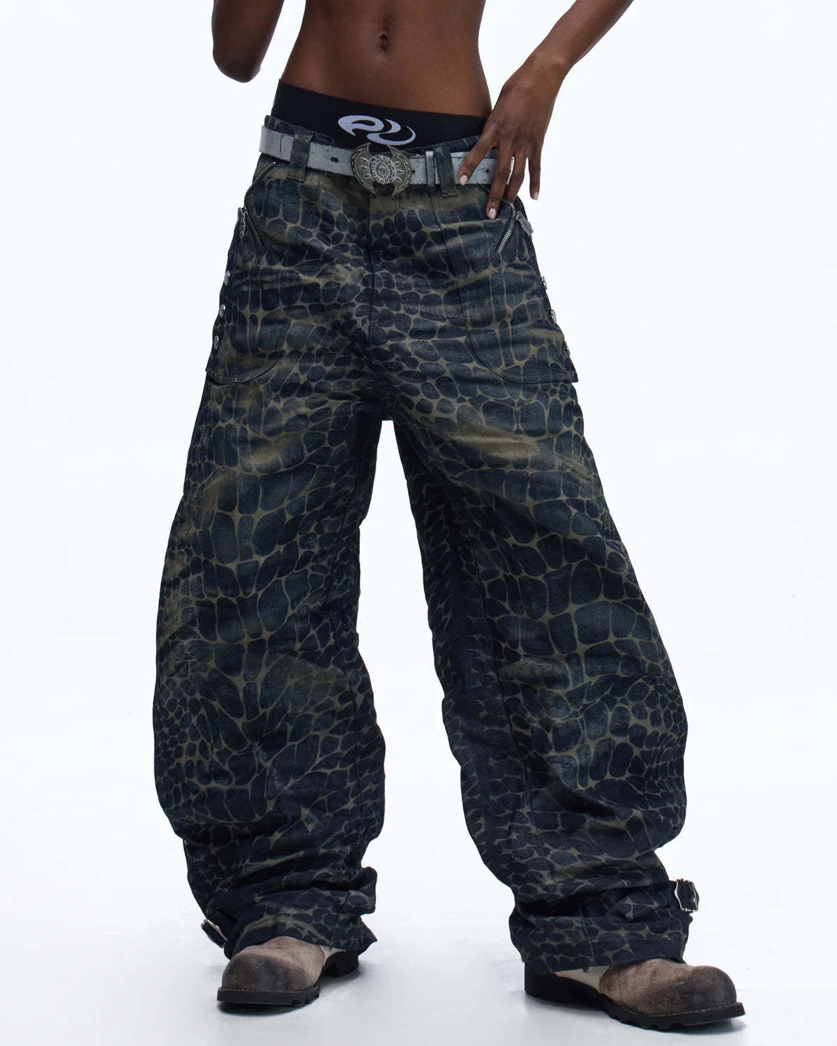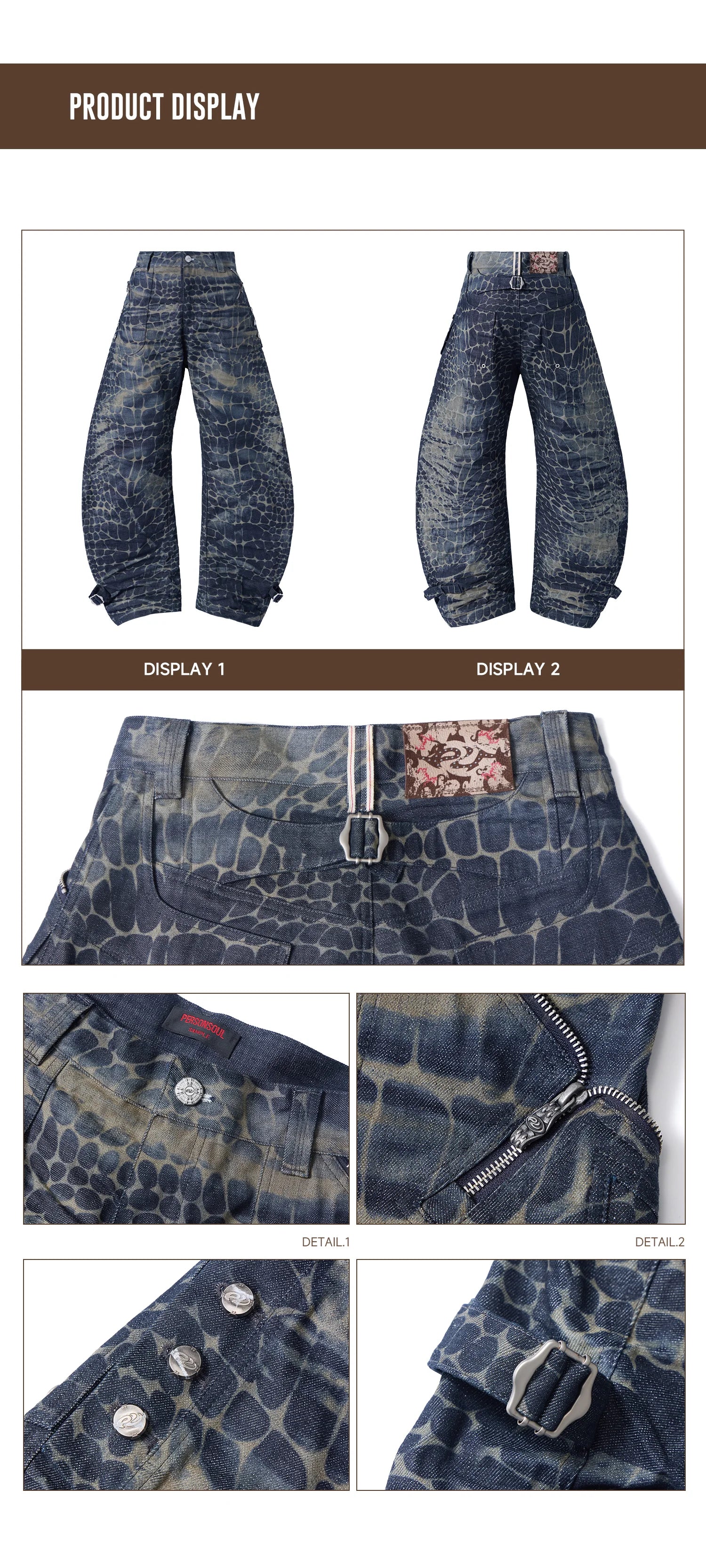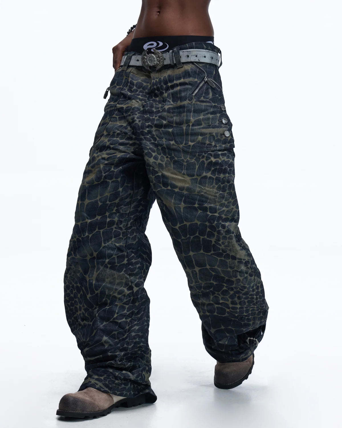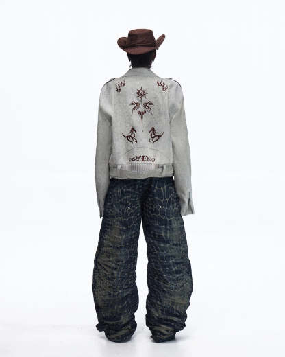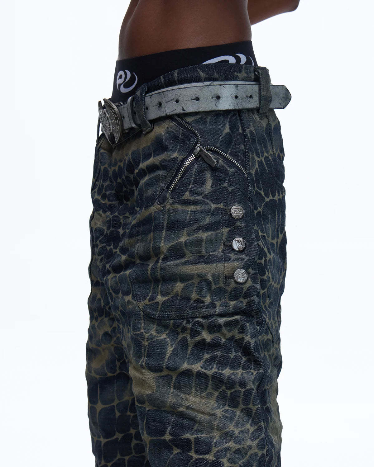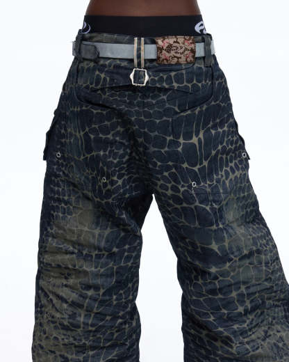 Personsoul Laser-Etched Crocodile-Patterned Raw Denim Curved Jeans