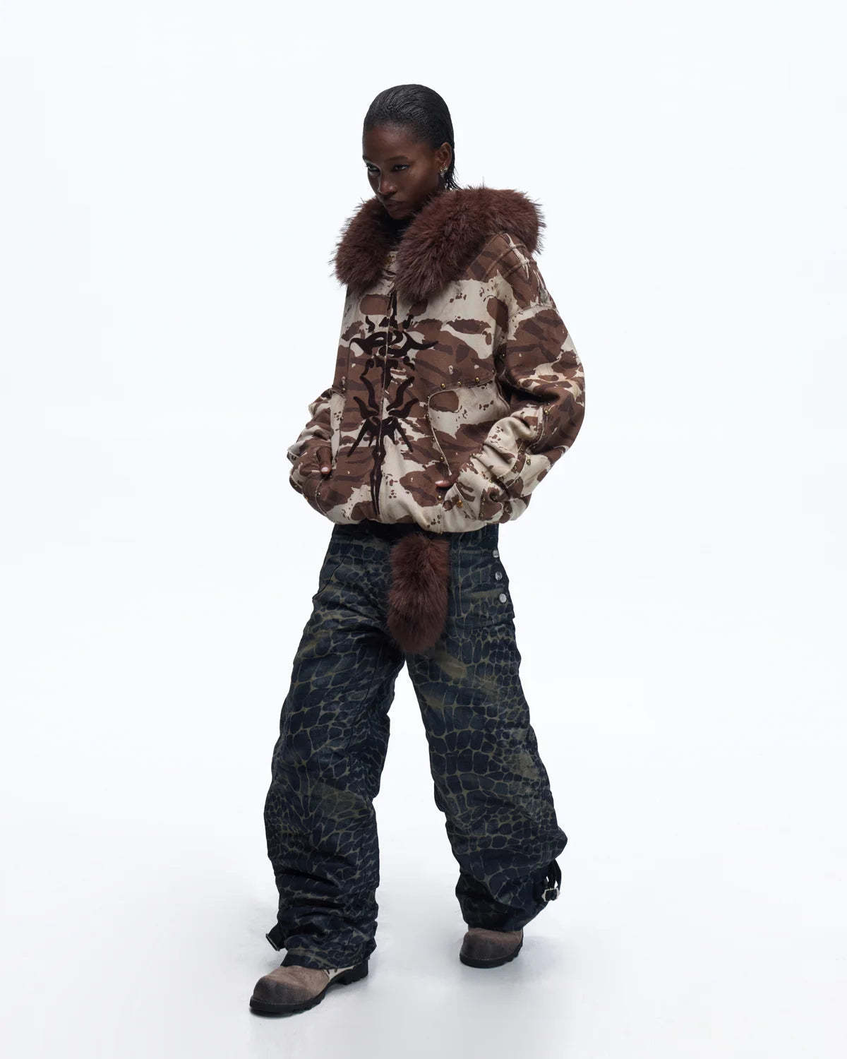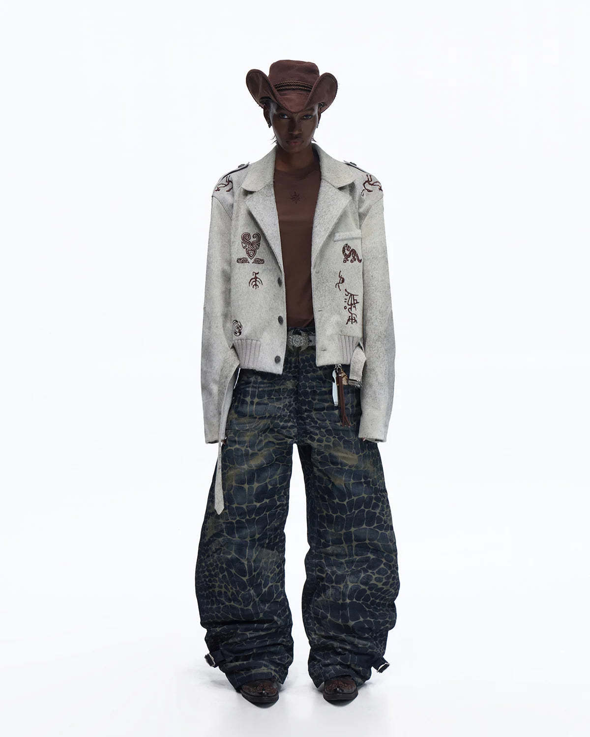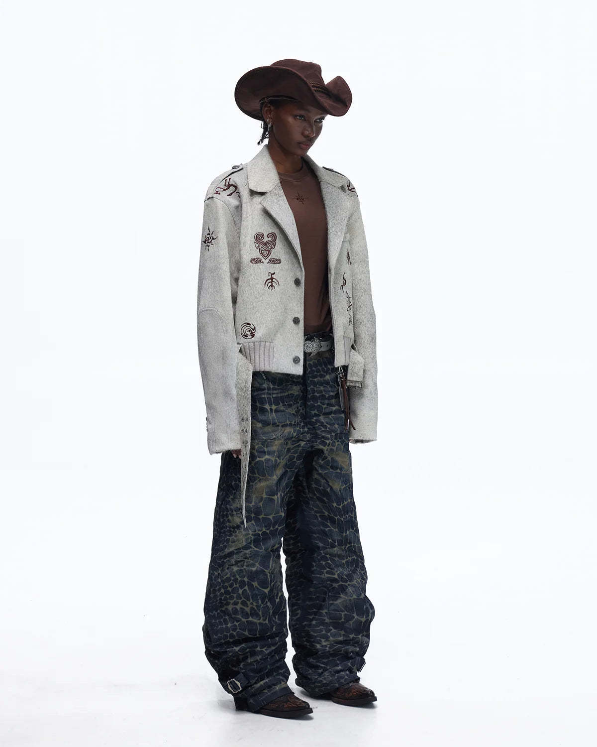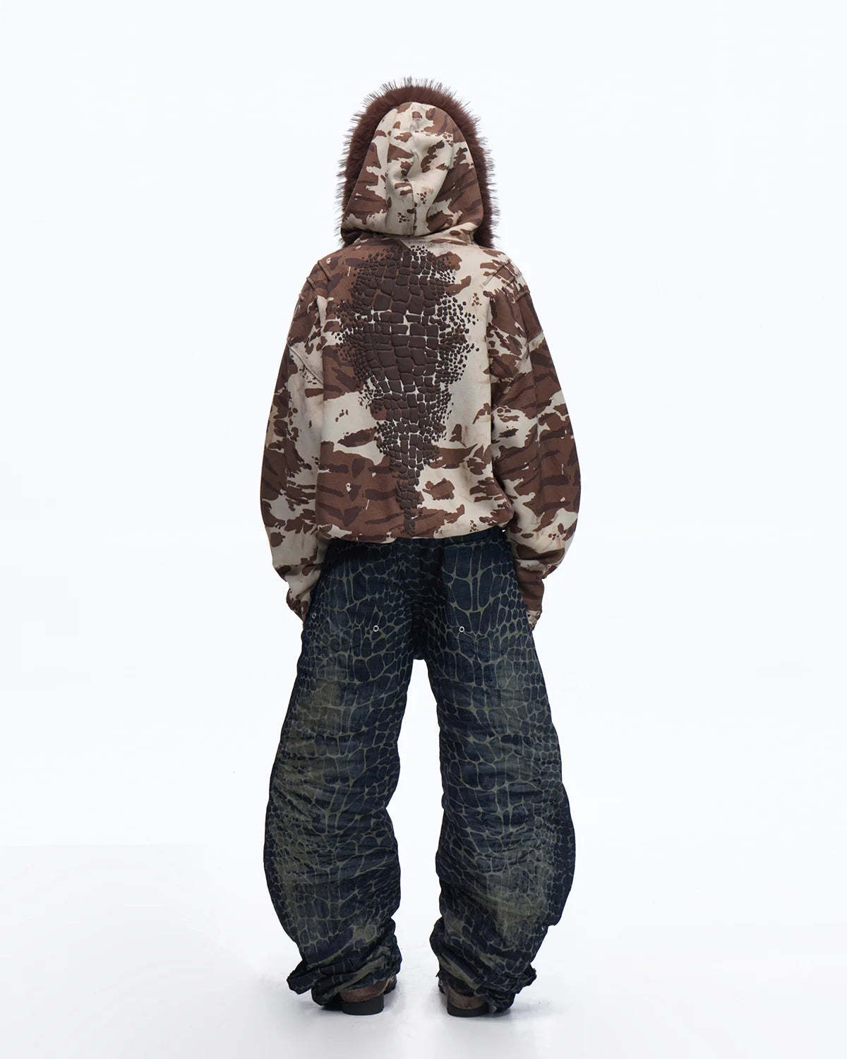 Personsoul Laser-Etched Crocodile-Patterned Raw Denim Curved Jeans