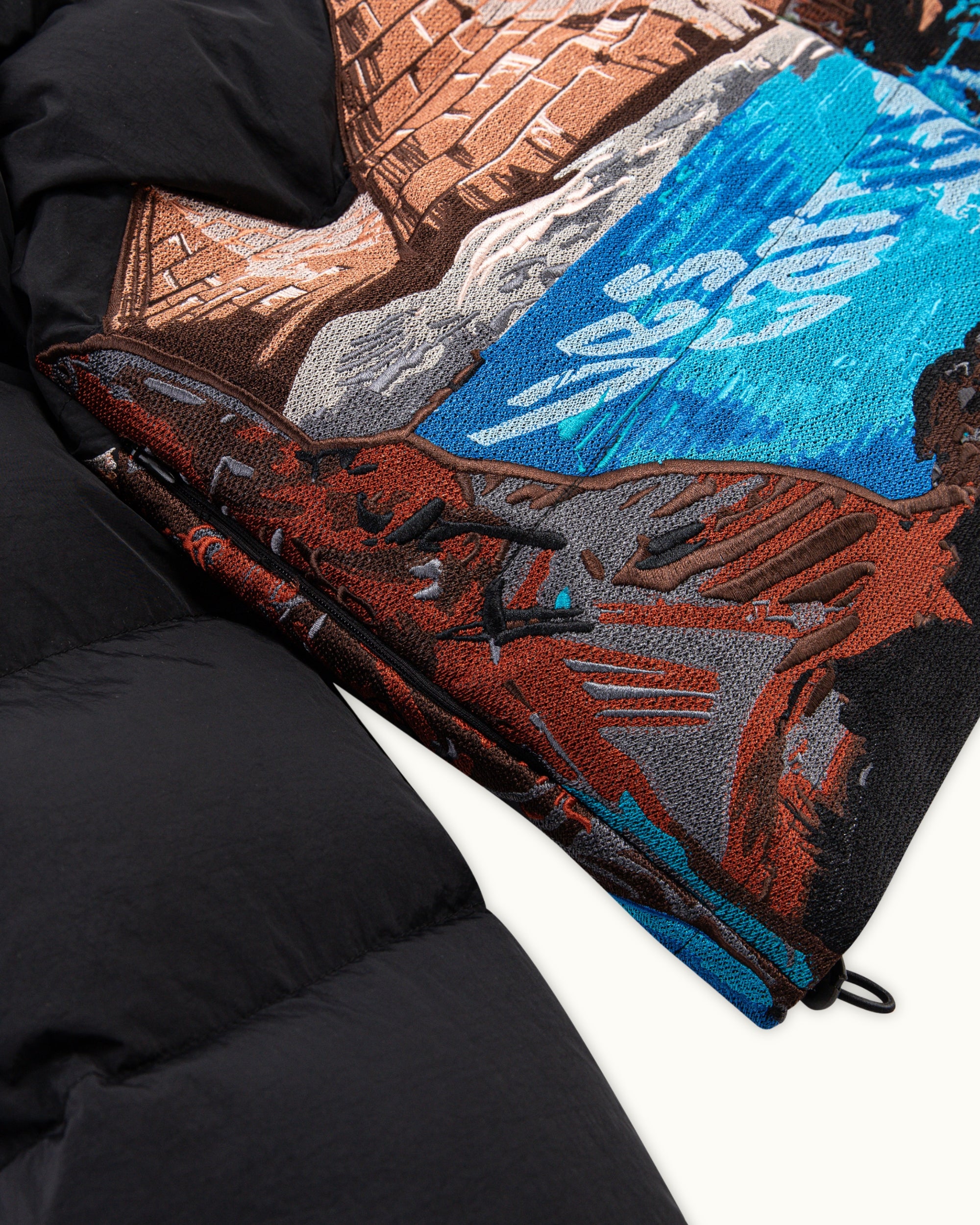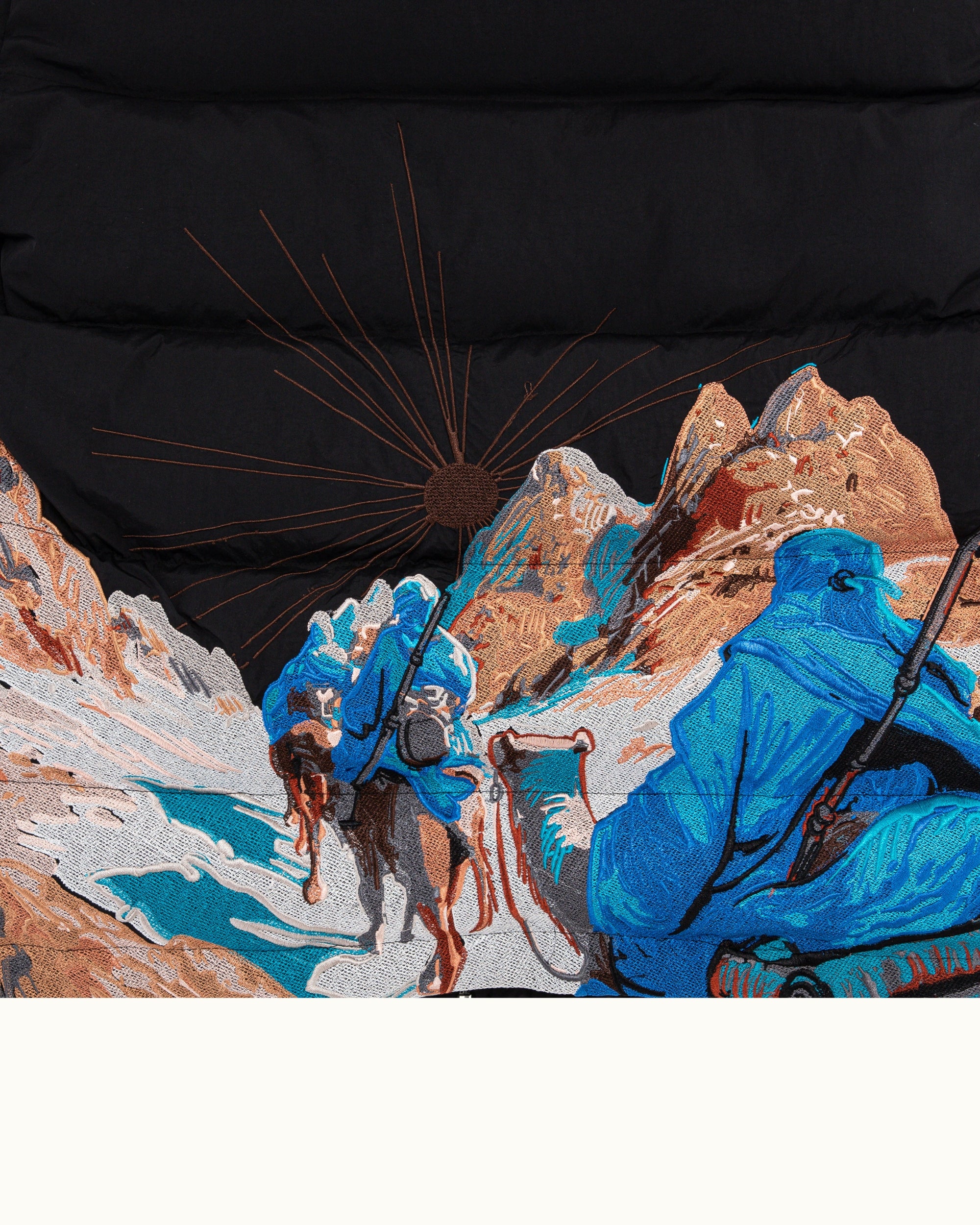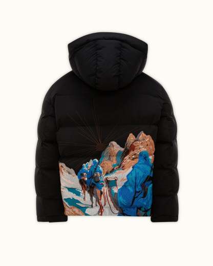 Crafted in a jet black tone, the Rihla Puffer introduces a statement embroidery panel that wraps around the jacket like a moving mural. The detachable hood adds versatility, while the desert scene—travellers, camels, palms, water—unfolds in dense, high-precision stitching exceeding 2 million stitches.