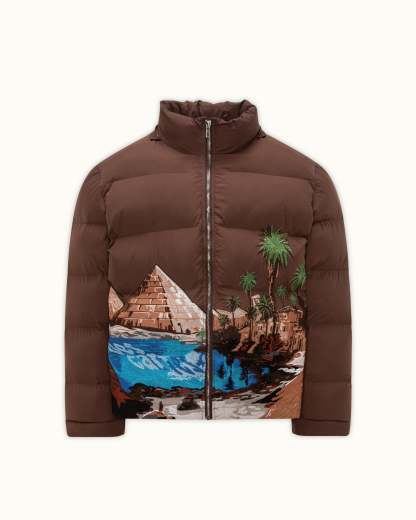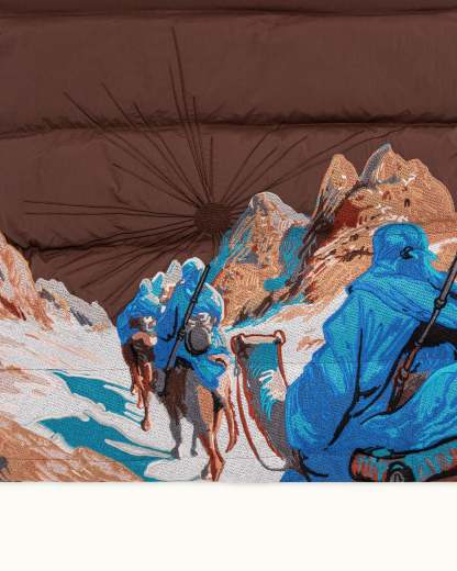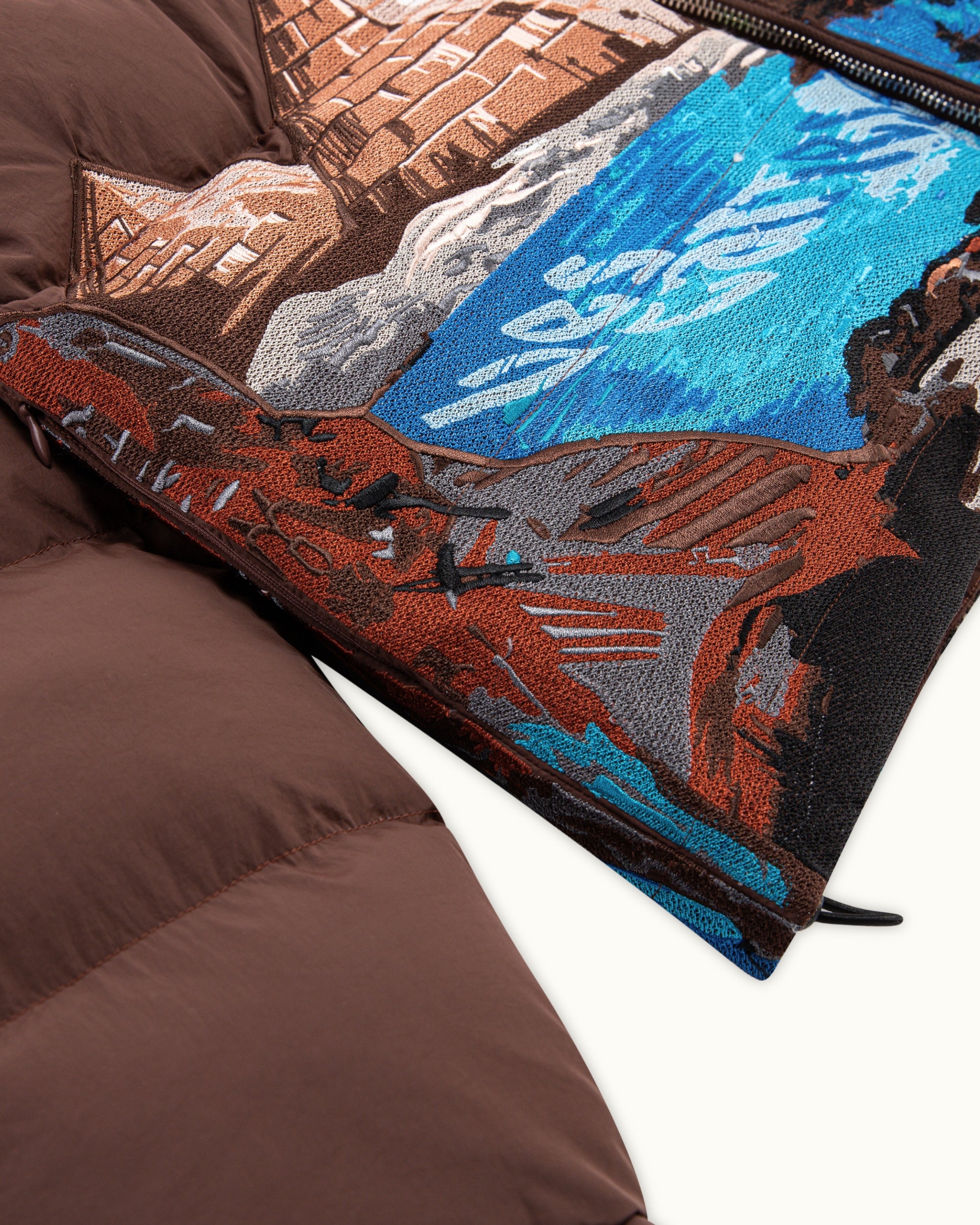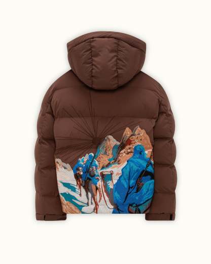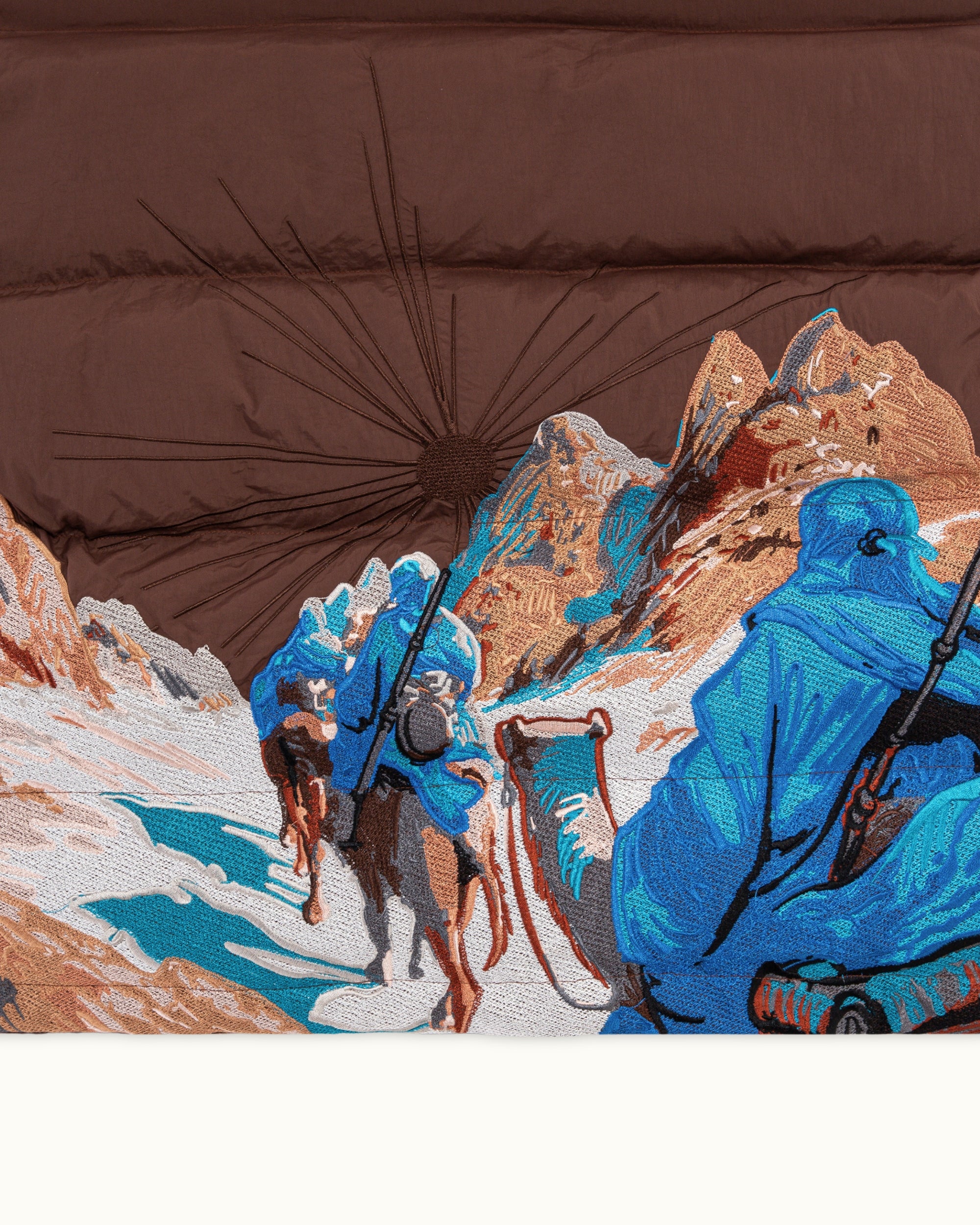 Crafted in a deep brown tone, the Rihla Puffer introduces a statement embroidery panel that wraps around the jacket like a moving mural. The detachable hood adds versatility, while the desert scene—travellers, camels, palms, water—unfolds in dense, high-precision stitching exceeding 2 million stitches.