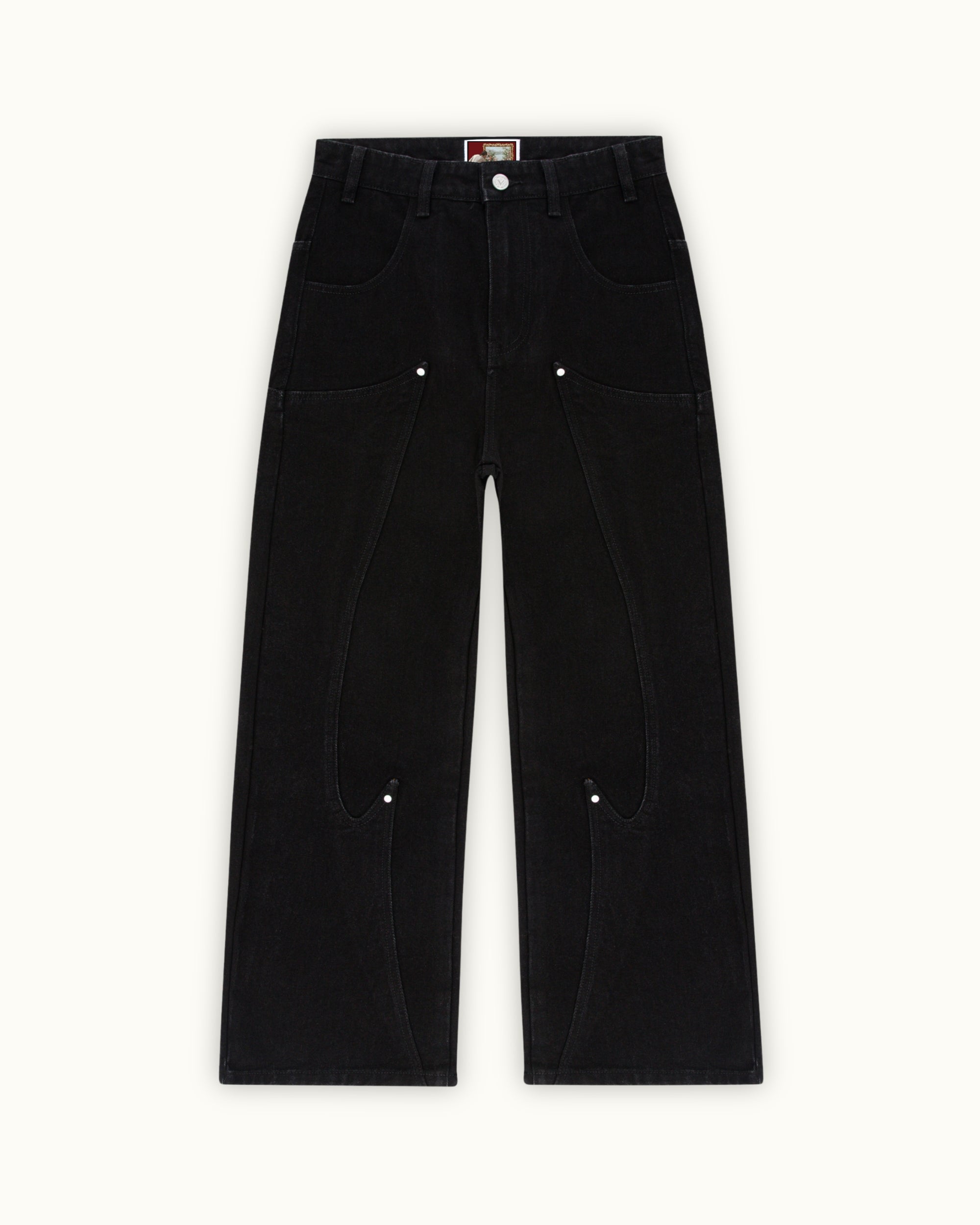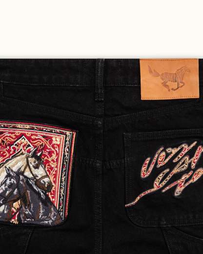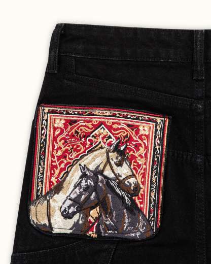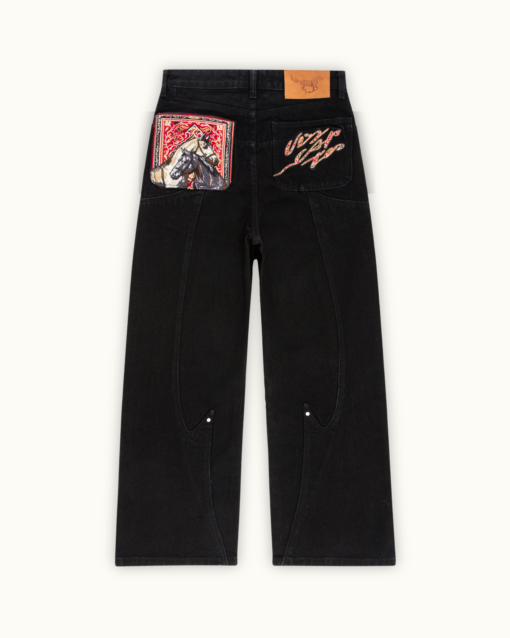 Sleek black denim paired with richly detailed embroidery inspired by Middle Eastern artistry. The left rear pocket showcases a tapestry-style scene of two horses framed within a Persian rug border, while the right pocket echoes the design through an Arabic rug-patterned Vescartes script.