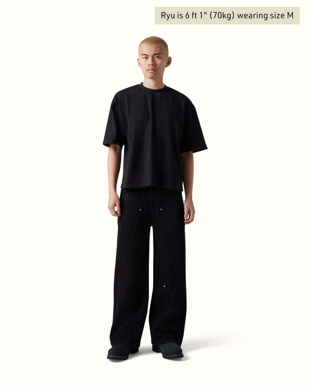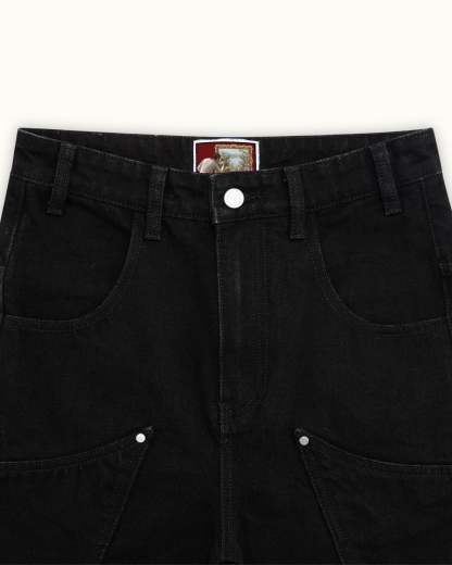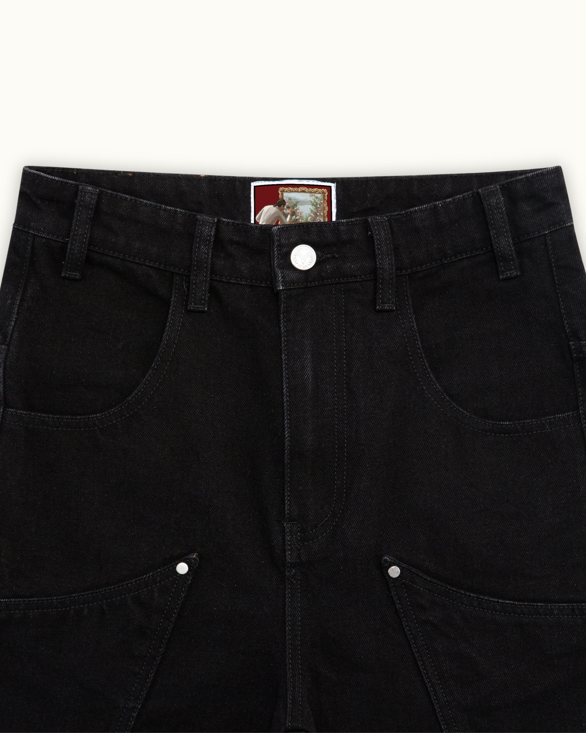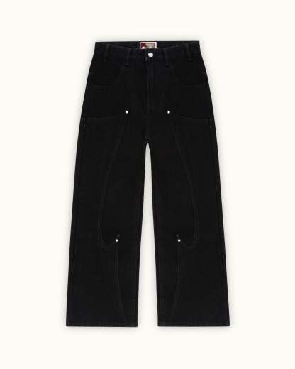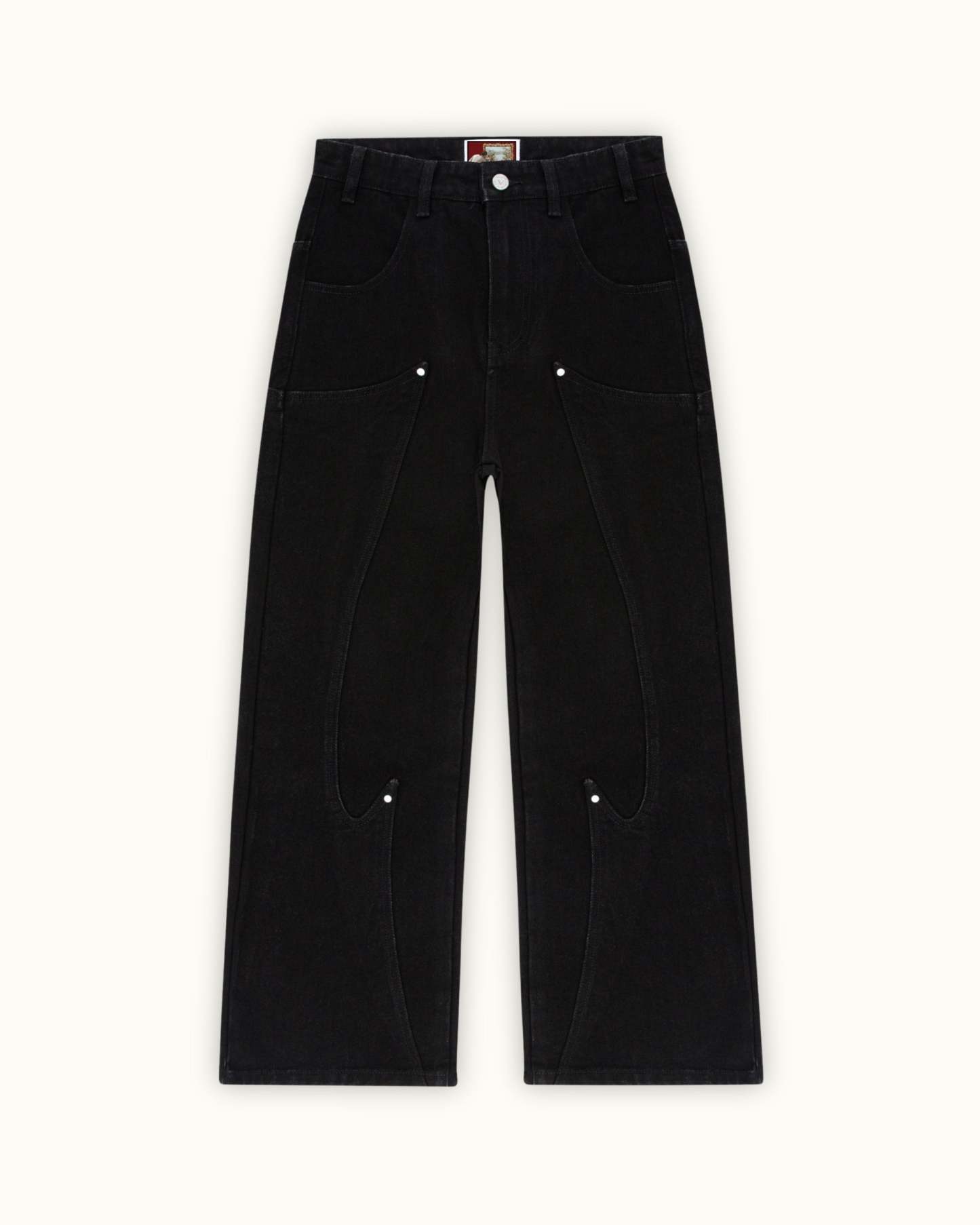 Sleek black denim paired with richly detailed embroidery inspired by Middle Eastern artistry. The left rear pocket showcases a tapestry-style scene of two horses framed within a Persian rug border, while the right pocket echoes the design through an Arabic rug-patterned Vescartes script.